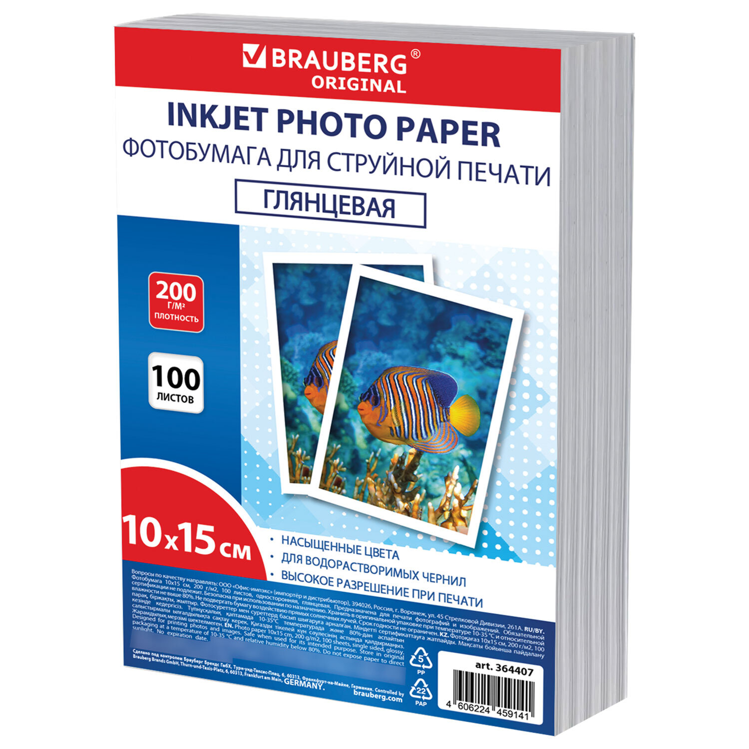 Фотобумага глянцевая, 10х15 см, 200 г/м2, односторонняя, 100 листов, ПАКЕТ, BRAUBERG ORIGINAL Код товара: 364407 234,37 ₽ Купить Производитель:BRAUBERG Глянцевая односторонняя фотобумага BRAUBERG подходит для всех типов струйных принтеров. Незаменима для печати ярких фотореалистичных изображений. Передает яркие, насыщенные цвета со множеством оттенков. Имеет формат 10х15 см и плотность 200 г/м2, что исключает просвечивание изображения. Гладкая поверхность обеспечивает превосходное качество, а особый состав – идеальную цветопередачу. Печать возможна только водорастворимыми чернилами. Поставляется по 100 листов в плотном пузырчатом пакете, защищающем бумагу от механических повреждений при доставке.Производство: КитайФормат: 10х15Тип поверхности: глянцеваяПлотность: 200 г/м2Серия: ORIGINAL PLUSТехнология печати: для струйной печатиКоличество листов в упаковке: 100 шт.Вес: 319 грРазмер упаковки: 2.9 × 16.3 × 11.6 смОбъём: 0.0009 м3Промежуточная упаковка: 48 штТранспортная упаковка: 48 штШтрих-код: 4606224459141 Файлы Сертификат-1.jpg Сертификат-2.jpg Сертификат-3.jpg Сертификат-4.jpg Сертификат-5.jpg Сертификат-6.jpg Сертификат-7.jpg Сертификат-8.jpg Сертификат-9.jpg Сертификат-10.jpg Сертификат-11.jpg Сертификат-12.jpg Сертификат-13.jpg Сертификат-14.jpg Сертификат-15.jpg Сертификат-16.jpg Сертификат-17.jpg Сертификат-18.jpg Сертификат-19.jpg Сертификат-20.jpg Сертификат-21.jpg Сертификат-22.jpg Сертификат-23.jpg Сертификат-24.jpg Сертификат-25.jpg Сертификат-26.jpg