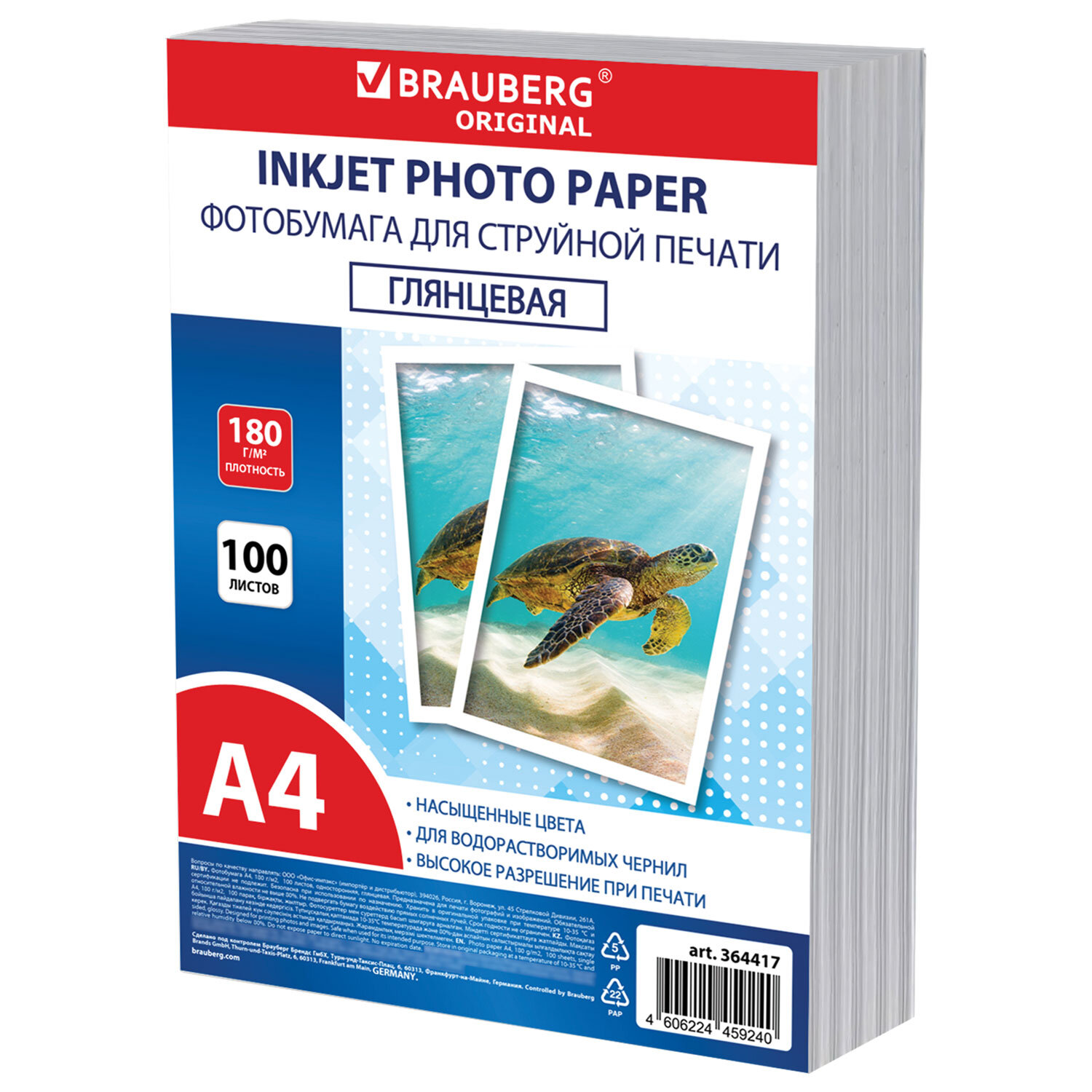 Фотобумага глянцевая, А4, 180 г/м2, односторонняя, 100 листов, ПАКЕТ, BRAUBERG ORIGINAL Код товара: 364417 772,67 ₽ Купить Производитель:BRAUBERG Глянцевая односторонняя фотобумага BRAUBERG подходит для всех типов струйных принтеров. Незаменима для печати ярких фотореалистичных изображений. Передает яркие, насыщенные цвета со множеством оттенков. Имеет формат А4 и плотность 180 г/м2, что исключает просвечивание изображения. Гладкая поверхность обеспечивает превосходное качество, а особый состав – идеальную цветопередачу. Печать возможна только водорастворимыми чернилами. Поставляется по 100 листов в плотном пузырчатом пакете, защищающем бумагу от механических повреждений при доставке.Производство: КитайФормат: А4Тип поверхности: глянцеваяПлотность: 180 г/м2Серия: ORIGINAL PLUSТехнология печати: для струйной печатиКоличество листов в упаковке: 100 шт.Вес: 1,18 кгРазмер упаковки: 3.3 × 30.6 × 23.4 смОбъём: 0.0027 м3Промежуточная упаковка: 12 штТранспортная упаковка: 12 штШтрих-код: 4606224459240 Файлы Сертификат-1.jpg Сертификат-2.jpg Сертификат-3.jpg Сертификат-4.jpg Сертификат-5.jpg Сертификат-6.jpg Сертификат-7.jpg Сертификат-8.jpg Сертификат-9.jpg Сертификат-10.jpg Сертификат-11.jpg Сертификат-12.jpg Сертификат-13.jpg Сертификат-14.jpg Сертификат-15.jpg Сертификат-16.jpg Сертификат-17.jpg Сертификат-18.jpg Сертификат-19.jpg Сертификат-20.jpg Сертификат-21.jpg Сертификат-22.jpg Сертификат-23.jpg Сертификат-24.jpg Сертификат-25.jpg Сертификат-26.jpg