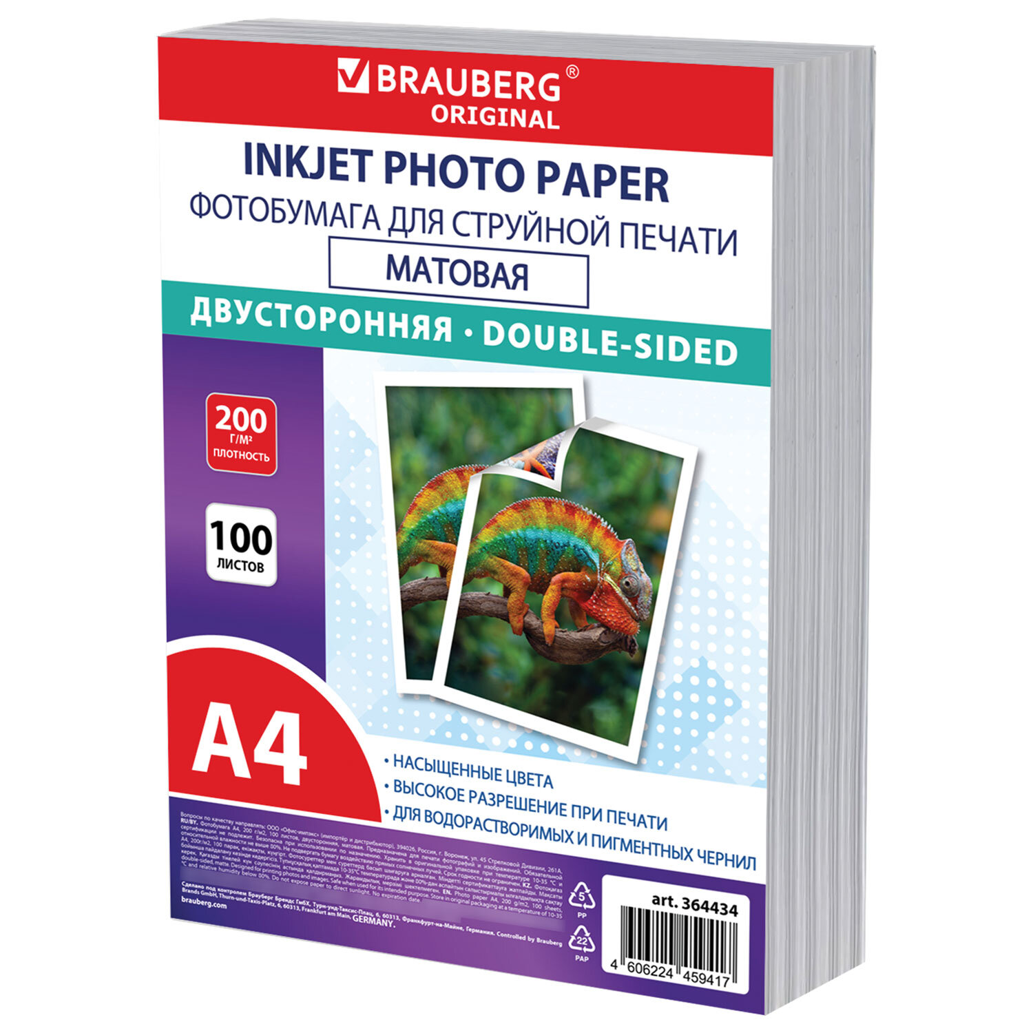 Фотобумага матовая, А4, 200 г/м2, двусторонняя, 100 листов, ПАКЕТ, BRAUBERG ORIGINAL Код товара: 364434 859,18 ₽ Купить Производитель:BRAUBERG Матовая двусторонняя фотобумага BRAUBERG подходит для всех типов струйных принтеров. Незаменима для печати рекламных материалов, текста, портфолио и фотопортретов. Напечатанное изображение не бликует, а тона имеют бархатистую глубину. Имеет формат А4 и плотность 200 г/м2, что исключает просвечивание изображения. Отлично подходит для печати черно-белых изображений. Гладкая поверхность обеспечивает превосходное качество, а особый состав – идеальную цветопередачу. Печать возможна водорастворимыми и пигментными чернилами. Поставляется по 100 листов в плотном пузырчатом пакете, защищающем бумагу от механических повреждений при доставке.Производство: КитайФормат: А4Тип поверхности: матоваяПлотность: 200 г/м2Двухсторонняя: даСерия: ORIGINAL PLUSТехнология печати: для струйной печатиКоличество листов в упаковке: 100 шт.Вес: 1,3 кгРазмер упаковки: 3.1 × 31 × 24.3 смОбъём: 0.003 м3Промежуточная упаковка: 12 штТранспортная упаковка: 12 штШтрих-код: 4606224459417 Файлы Сертификат-1.jpg Сертификат-2.jpg Сертификат-3.jpg Сертификат-4.jpg Сертификат-5.jpg Сертификат-6.jpg Сертификат-7.jpg Сертификат-8.jpg Сертификат-9.jpg Сертификат-10.jpg Сертификат-11.jpg Сертификат-12.jpg Сертификат-13.jpg Сертификат-14.jpg Сертификат-15.jpg Сертификат-16.jpg Сертификат-17.jpg Сертификат-18.jpg Сертификат-19.jpg Сертификат-20.jpg Сертификат-21.jpg Сертификат-22.jpg Сертификат-23.jpg Сертификат-24.jpg Сертификат-25.jpg Сертификат-26.jpg