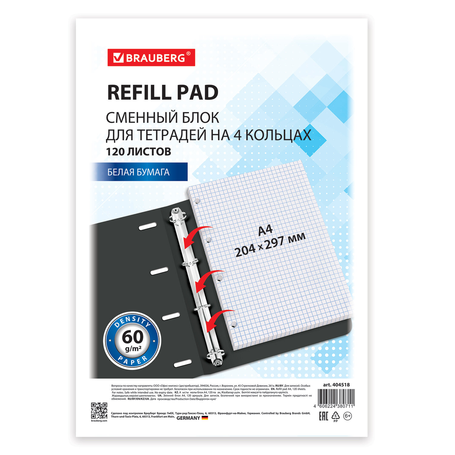 Сменный блок к тетради на кольцах БОЛЬШОГО ФОРМАТА А4, 120 л., BRAUBERG, Белый Код товара: 404518 157,68 ₽ Купить Производитель:BRAUBERG Сменный блок BRAUBERG предназначен для письма гелевыми, шариковыми, капиллярными и перьевыми ручками. Универсальная перфорация на 4 отверстия. Сменный блок подходит для всех тетрадей на 4 кольцах формата А4. Внутренний блок содержит 120 листов белой офсетной бумаги плотностью 60 г/м2. Линовка – клетка без полей. Упакован в термопленку.Производство: РоссияФормат: А4Тип товара: сменный блокОбщее количество листов: 120Вид бумаги: офсетПлотность бумаги: 60 г/м2Вид линовки: клеткаБелизна: 100 %Цвет сменного блока: белыйТермоупаковка: даВес: 453 грРазмер упаковки: 1.1 × 29.4 × 20.1 смОбъём: 0.0008 м3Промежуточная упаковка: 20 штТранспортная упаковка: 20 штШтрих-код: 4606224380711 Файлы Сертификат-1.jpg Сертификат-2.jpg Сертификат-3.jpg Сертификат-4.jpg Сертификат-5.jpg Сертификат-6.jpg Сертификат-7.jpg