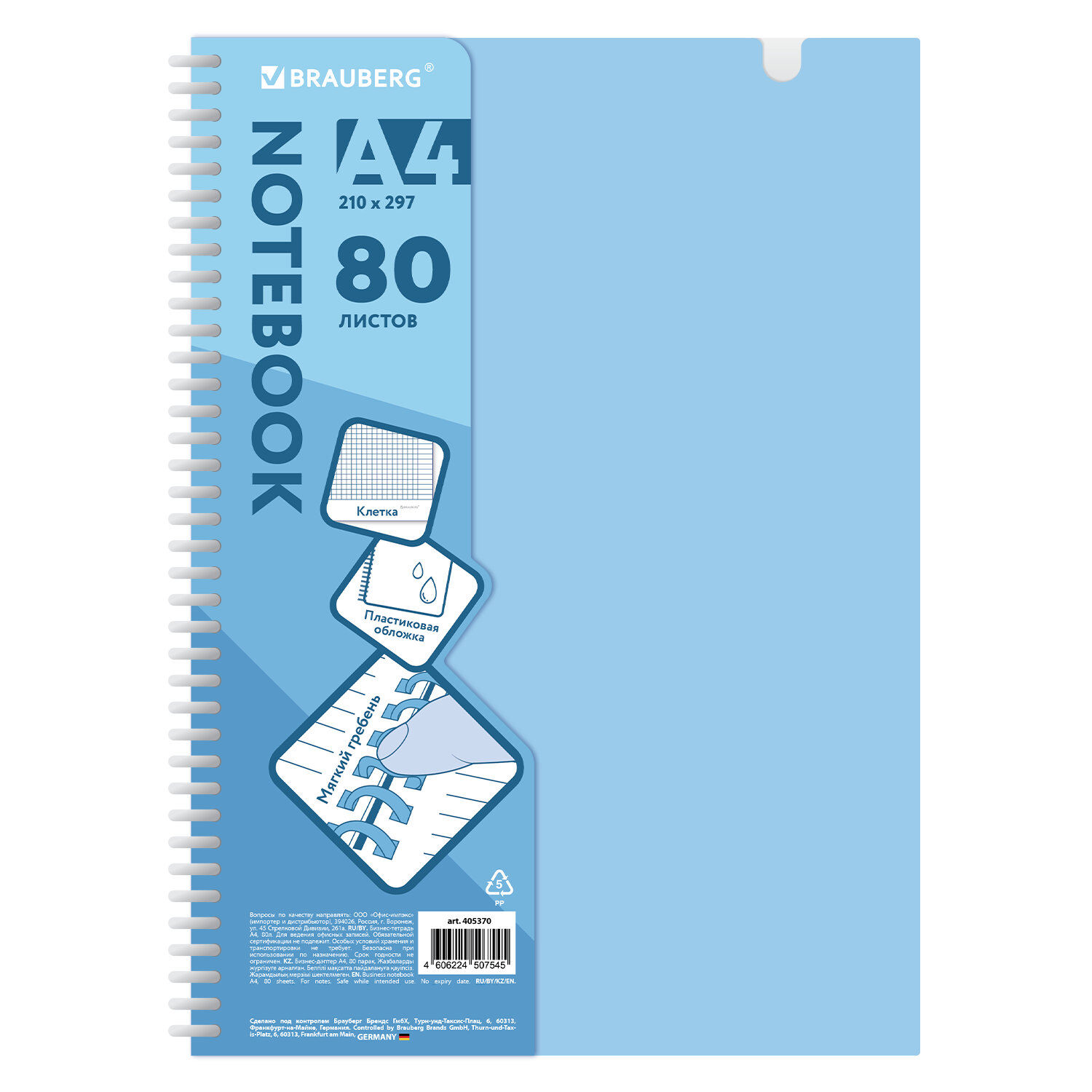 Тетрадь обложка пластик, А4 80 л., гребень мягкий, вырубка для ручки, клетка, BRAUBERG, голубой Код товара: 405370 342,97 ₽ Купить Производитель:BRAUBERG Стильная и практичная тетрадь BRAUBERG станет незаменимым помощником для старшеклассников, студентов и офисных сотрудников. Она идеально подходит для учебы, работы и повседневных записей, обеспечивая комфорт и удобство в использовании. Прочная пластиковая обложка надежно защищает внутренний блок от повреждений и влаги, продлевая срок службы тетради. Обложка тетради оснащена специальной вырубкой для удобного крепления ручки. Внутри – 80 листов высококачественной офсетной бумаги плотностью 70 г/м2 и белизной 100%, обеспечивающей комфортное письмо. Удобная линовка в клетку с полями помогает вести структурированные записи. Листы скреплены мягким силиконовым гребнем, что обеспечивает удобство использования тетради и комфорт при письме. Формат А4 позволяет разместить большой объем информации, что делает тетрадь идеальным выбором для учебы, работы и деловых заметок.Производство: КитайКоличество листов: 80Тип скрепления: гребень силиконовыйМатериал обложки: пластикЛиновка блока: клеткаНаличие полей: даЦвет бумаги блока: белыйСерия: Мягкий гребень_2Дизайн: ГолубойФормат: А4Плотность внутреннего блока: 70 г/м2Белизна: 100 %Однотонный дизайн обложки: даКоличество дизайнов в минимальной упаковке: 1 шт.Количество дизайнов в транспортной упаковке: 1 шт.Длина: 297 ммШирина: 210 ммИндивидуальная упаковка: даВес: 461 грРазмер упаковки: 1.4 × 30.7 × 21.8 смОбъём: 0.0009 м3Промежуточная упаковка: 24 штТранспортная упаковка: 24 штШтрих-код: 4606224507545 Сертификат-1.jpg Сертификат-2.jpg Сертификат-3.jpg