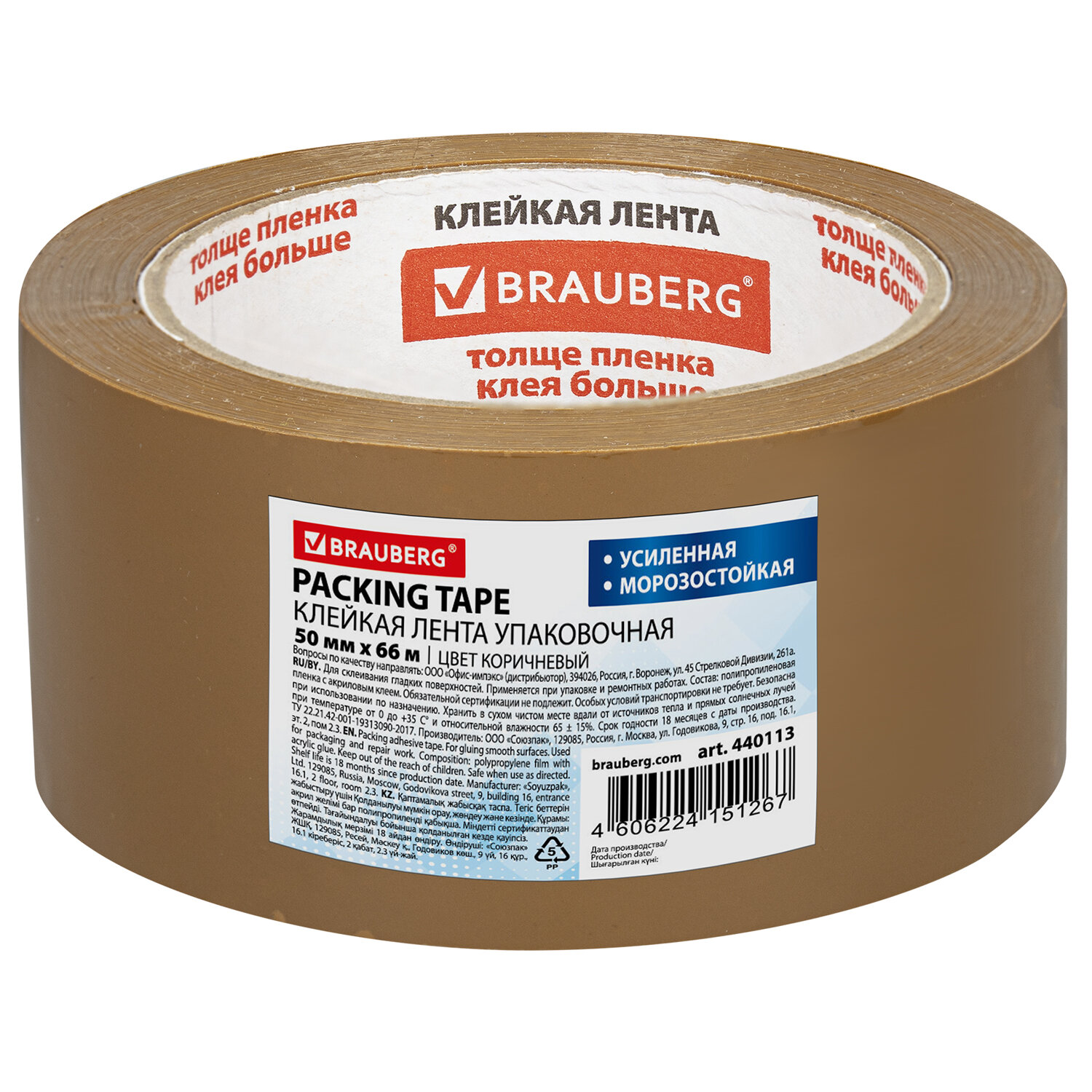 Клейкая лента упаковочная, 50 мм х 66 м, КОРИЧНЕВАЯ, УСИЛЕННАЯ, МОРОЗОСТОЙКАЯ, толщина 50 микрон, BRAUBERG Код товара: 440113 139,03 ₽ Купить Производитель:BRAUBERG Упаковочная клейкая лента BRAUBERG активно используется в торговле, промышленности, быту и подходит для оперативной упаковки с помощью диспенсера или вручную. Отличается высокой адгезией клея (слипанием с поверхностью) и стойкостью к разрыву. Толщина скотча 50 мкм позволяет переносить воздействие низких температур и влажности и выдерживать вес коробки 15-17 кг. Клейкой ленты шириной 50 мм и длиной намотки 66 м хватит на продолжительное время. Цвет - коричневый.Производство: РоссияШирина: 50 ммДлина намотки: 66 мТолщина: 50 мкмКоличество в упаковке: 1 шт.Дополнительные свойства: морозостойкая, суперклейкаяДиаметр втулки: 76.2 ммТип клейкой ленты: упаковочная цветнаяЦвет: коричневыйУпаковка: нетСрок годности: 18 месВес: 186 грРазмер упаковки: 5.2 × 10.5 × 10.5 смОбъём: 0.0006 м3Промежуточная упаковка: 36 штТранспортная упаковка: 36 штШтрих-код: 4606224151267 Файлы Сертификат-1.jpg Сертификат-2.jpg Сертификат-3.jpg Сертификат-4.jpg Сертификат-5.jpg Сертификат-6.jpg Сертификат-7.jpg Сертификат-8.jpg Сертификат-9.jpg Сертификат-10.jpg Сертификат-11.jpg Сертификат-12.jpg Сертификат-13.jpg Сертификат-14.jpg Сертификат-15.jpg Сертификат-16.jpg Сертификат-17.jpg Сертификат-18.jpg Сертификат-19.jpg Сертификат-20.jpg Сертификат-21.jpg Сертификат-22.jpg Сертификат-23.jpg Сертификат-24.jpg Сертификат-25.jpg Сертификат-26.jpg