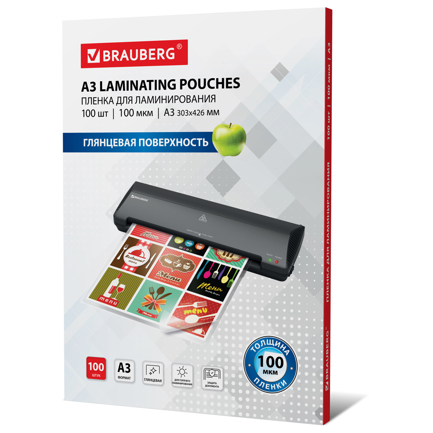 Пленки-заготовки для ламинирования БОЛЬШОГО ФОРМАТА, А3, КОМПЛЕКТ 100 шт., 100 мкм, BRAUBERG Код товара: 530895 2 724,53 ₽ Купить Производитель:BRAUBERG Пленка для ламинирования BRAUBERG надежно защитит документы от влаги, пыли, воздействия УФ-лучей и других внешних факторов. Представляет собой двойной пакет, спаянный с одной стороны (содержание полиэстера > 50%). Документ вкладывается между слоями пленки и в дальнейшем подвергается термообработке в ламинаторе. Суммарная толщина пленки-заготовки - 200 (100х2) мкм, что позволяет защитить документы и увеличить жесткость, сохраняя яркость изображения. Пленка для ламинирования BRAUBERG формата А3 (303х426 мм) имеет уникальный состав: полиэтилентерефталат (PET), этиленвинилацетат (EVA), полиэтилен (LDPE). Промежуточный слой полиэтилена (LDPE) выступает как связующий элемент между слоями PET и EVA, служит дополнительной защитой от вероятного вытекания клея из-под пленки при ламинировании. Полиэтилен (PE) придает пакетам прочность эластичность и износостойкость. Глянцевое покрытие пленки способствует сохранению и максимальной передаче цвета ламинируемого изображения. Поставляется в картонной упаковке по 100 штук, которых при нечастом использовании хватает на продолжительное время.Производство: КитайФормат: А3Толщина пленки: 100 мкмТип: пакетДлина: 303 ммШирина: 426 ммТип плёнки: глянцеваяВ комплекте: 100 шт.Вес: 3,1 кгРазмер упаковки: 2.3 × 43.2 × 31 смОбъём: 0.0039 м3Промежуточная упаковка: 5 штТранспортная упаковка: 5 штШтрих-код: 4606224105901 Файлы Сертификат-1.jpg Сертификат-2.jpg Сертификат-3.jpg Сертификат-4.jpg Сертификат-5.jpg Сертификат-6.jpg Сертификат-7.jpg Сертификат-8.jpg Сертификат-9.jpg Сертификат-10.jpg Сертификат-11.jpg Сертификат-12.jpg Сертификат-13.jpg Сертификат-14.jpg Сертификат-15.jpg Сертификат-16.jpg Сертификат-17.jpg Сертификат-18.jpg Сертификат-19.jpg Сертификат-20.jpg Сертификат-21.jpg Сертификат-22.jpg Сертификат-23.jpg Сертификат-24.jpg Сертификат-25.jpg Сертификат-26.jpg