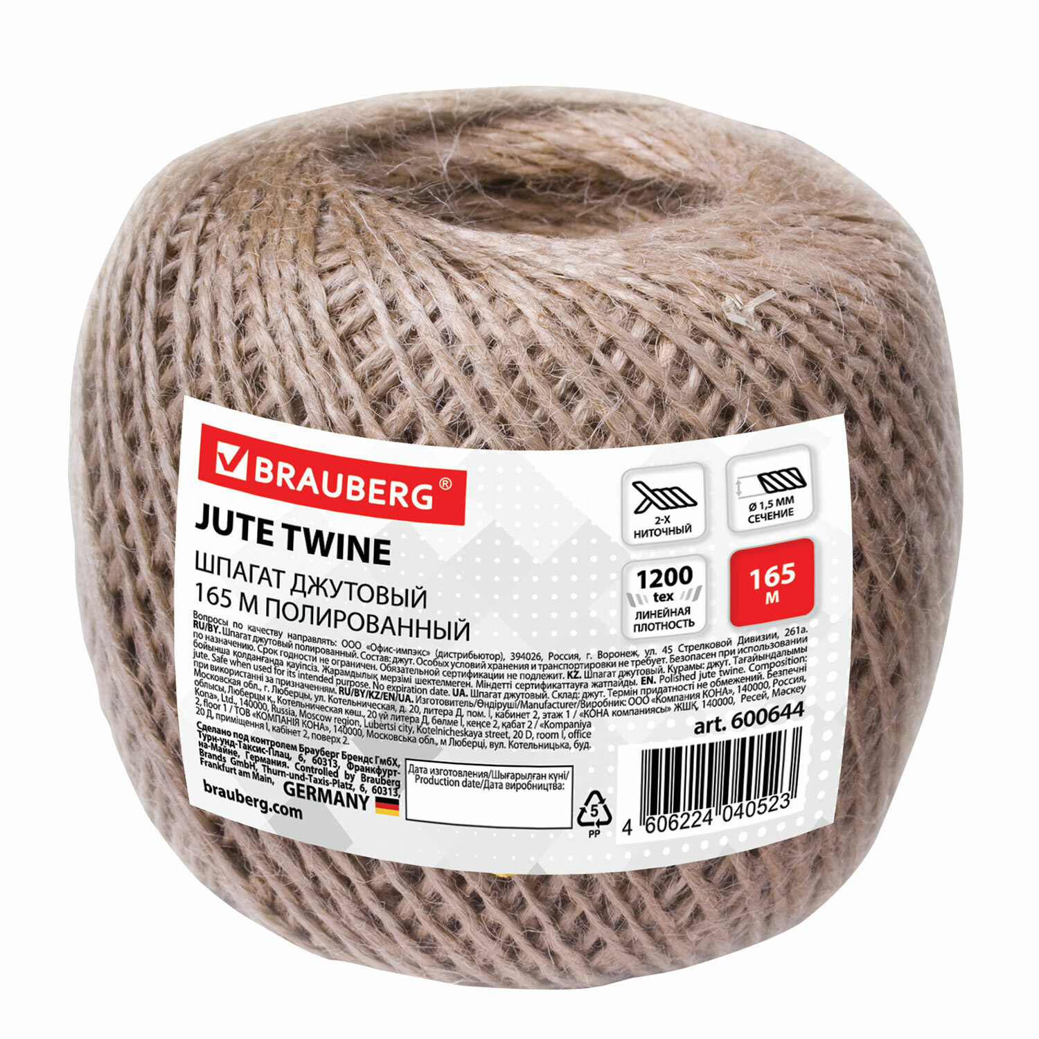 Шпагат джутовый банковский полированный, длина 165 м, диаметр 1,5 мм, линейная плотность 1200 текс, BRAUBERG Код товара: 600644 210,89 ₽ Купить Производитель:BRAUBERG Джутовый шпагат BRAUBERG отлично подходит для декорирования, плетения, обвязки, упаковки товаров, инкассации, опечатывания и прошивки документов. Активно применяется для хозяйственных и бытовых нужд в домашнем и дачном хозяйстве. Изготовлен из натурального сырья растительного происхождения. Представляет собой нить диаметром 1,5 мм намотанную в клубок. Обладает линейной плотностью 1200 текс. Отличается мягкостью, высокой прочностью и эластичностью, не накапливает статическое электричество, устойчив к негативному воздействию ультрафиолета, не боится высоких температур и холода. Имеет равномерную витую структуру без посторонних включений, не ворсится и не колется. Джутовый шпагат отлично подходит для декорирования корзинок, вазочек, шкатулок, плетения сумок, ковриков, украшений. Так же джутовый шпагат используют для изготовления предметов интерьера, изделий в технике макраме. Активно применяется для хозяйственных нужд, подвязки растений и деревьев, упаковки товаров, для строительных и ремонтных работ. Подходит для опечатывания, инкассации, прошивки документов в делопроизводстве. Благодаря своим уникальным природным качествам и практичностью джутовый шпагат является незаменимым помощником в каждом доме и дачном хозяйстве. Экологически чистый продукт.Производство: РоссияТип: шпагатМатериал: джутДлина намотки: 165 мЦвет: темно-коричневыйВес бухты: 0.2 кгУпаковка: пленкаДиаметр: 1.5 ммРазрывная нагрузка: 15 кгсЛинейная плотность: 1200 тексВес: 208 грРазмер упаковки: 9.1 × 9.9 × 10.2 смОбъём: 0.0014 м3Промежуточная упаковка: 35 штТранспортная упаковка: 35 штШтрих-код: 4606224040523 Сертификат-1.jpg Сертификат-2.jpg Сертификат-3.jpg