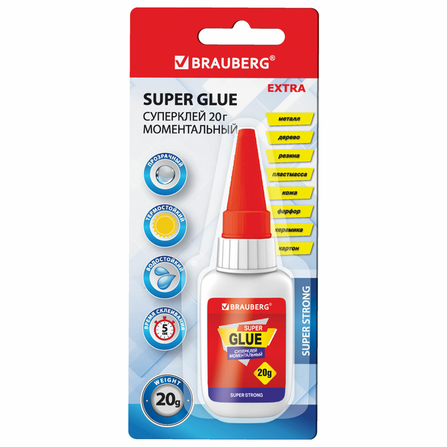 Клей моментальный ультрапрочный суперклей BRAUBERG EXTRA, 20 г, МАКСИМАЛЬНЫЙ ОБЪЕМ, 608101 Код товара: 608101 122,11 ₽ Купить Производитель:BRAUBERG Моментальный суперклей BRAUBERG EXTRA в большой фасовке незаменим в быту! Применяется для склеивания изделий из пластмассы, дерева, резины, кожи и других материалов. Клей экономно расходуется благодаря высокой плотности. Обладает быстрым схватыванием – всего 5 секунд! Склеивает прочно и надежно. Не растекается, не оставляет видимых следов после высыхания. Водостойкий, термостойкий, устойчив к органическим растворителям. Heпригоден для склеивания посуды, контактирующей с пищей. Рабочая температура: от -30 °С до +80 °С. Вес нетто – 20 г, упаковка – блистер с европодвесом.Производство: КитайНазначение: универсальныйВид: суперклейФорма выпуска: клейВремя схватывания: 0.08 минутВес/объем: 20 г/млМногоразовое применение: даВодостойкий: даСклеивает: войлок, дерево, картон, керамика, кожа, металл, оргстекло, пластик, резина, стекло, фарфор, фибергласСпециальный колпачок позволяет использовать клей многократно: даЦвет клея: прозрачныйУпаковка: блистер с европодвесомСрок годности: 36 месВес: 48 грРазмер упаковки: 2.6 × 16 × 6.8 смОбъём: 0.0003 м3Промежуточная упаковка: 12 штТранспортная упаковка: 144 штШтрих-код: 4606224365824 Файлы Сертификат-1.jpg Сертификат-2.jpg Сертификат-3.jpg Сертификат-4.jpg Сертификат-5.jpg Сертификат-6.jpg Сертификат-7.jpg Сертификат-8.jpg Сертификат-9.jpg Сертификат-10.jpg Сертификат-11.jpg Сертификат-12.jpg Сертификат-13.jpg Сертификат-14.jpg Сертификат-15.jpg Сертификат-16.jpg Сертификат-17.jpg Сертификат-18.jpg Сертификат-19.jpg Сертификат-20.jpg Сертификат-21.jpg Сертификат-22.jpg Сертификат-23.jpg Сертификат-24.jpg Сертификат-25.jpg
