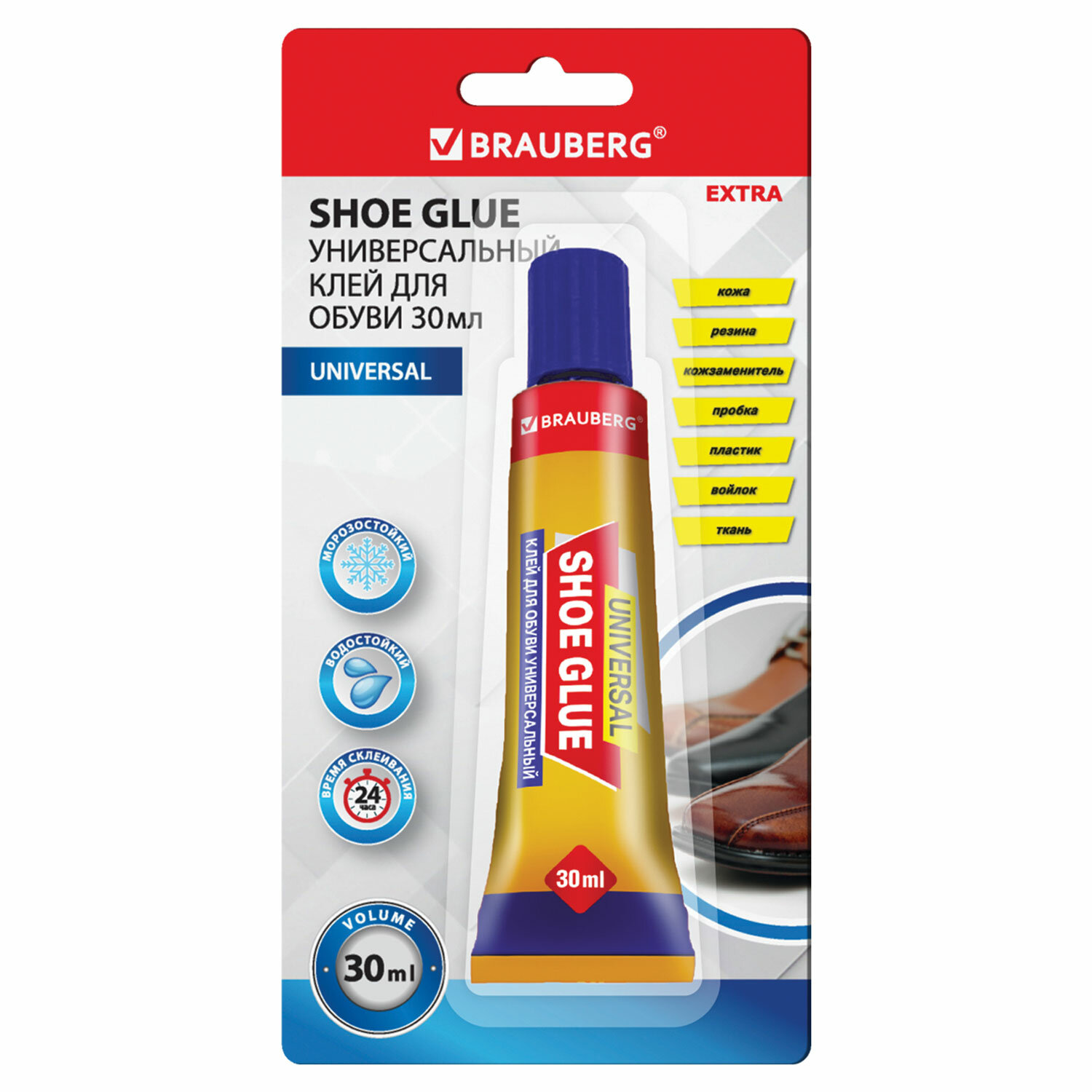 Клей универсальный обувной водостойкий BRAUBERG EXTRA, 30 мл, прочный, блистер, 608105 Код товара: 608105 75,88 ₽ Купить Производитель:BRAUBERG Универсальный обувной клей BRAUBERG EXTRA предназначен для склеивания обувных материалов из кожи, кожзаменителя, резины, пластика, войлока, ткани. Клей наносится тонким слоем на очищенные и обезжиренные основания. Прозрачная смесь хорошо растекается по поверхности и мгновенно застывает при сжатии склеиваемых элементов, образуя эластичный клеевой шов. Эффективность операции зависит от силы сжатия (достаточно выдержать пресс несколько секунд). Клей устойчив к реагентам, солям, отличается высокой тепло-, водо- и морозостойкостью. Рабочая температура: от -30 °С до +80 °С. Объем тубы – 30 мл. Упаковка – блистер с европодвесом.Производство: КитайНазначение: универсальныйВид: обувнойФорма выпуска: клейВремя схватывания: 15 минутВес/объем: 30 г/млМногоразовое применение: даВодостойкий: даВысокая эластичность: даСклеивает: войлок, кожа, пластик, резина, тканьСпециальный колпачок позволяет использовать клей многократно: даЦвет клея: желтыйУпаковка: блистер с европодвесомСрок годности: 36 месВес: 58 грРазмер упаковки: 2.6 × 19.1 × 9.5 смОбъём: 0.0005 м3Промежуточная упаковка: 12 штТранспортная упаковка: 144 штШтрих-код: 4606224365862 Файлы Сертификат-1.jpg Сертификат-2.jpg Сертификат-3.jpg Сертификат-4.jpg Сертификат-5.jpg Сертификат-6.jpg Сертификат-7.jpg Сертификат-8.jpg Сертификат-9.jpg Сертификат-10.jpg Сертификат-11.jpg Сертификат-12.jpg Сертификат-13.jpg Сертификат-14.jpg Сертификат-15.jpg Сертификат-16.jpg Сертификат-17.jpg Сертификат-18.jpg Сертификат-19.jpg Сертификат-20.jpg Сертификат-21.jpg Сертификат-22.jpg Сертификат-23.jpg Сертификат-24.jpg Сертификат-25.jpg