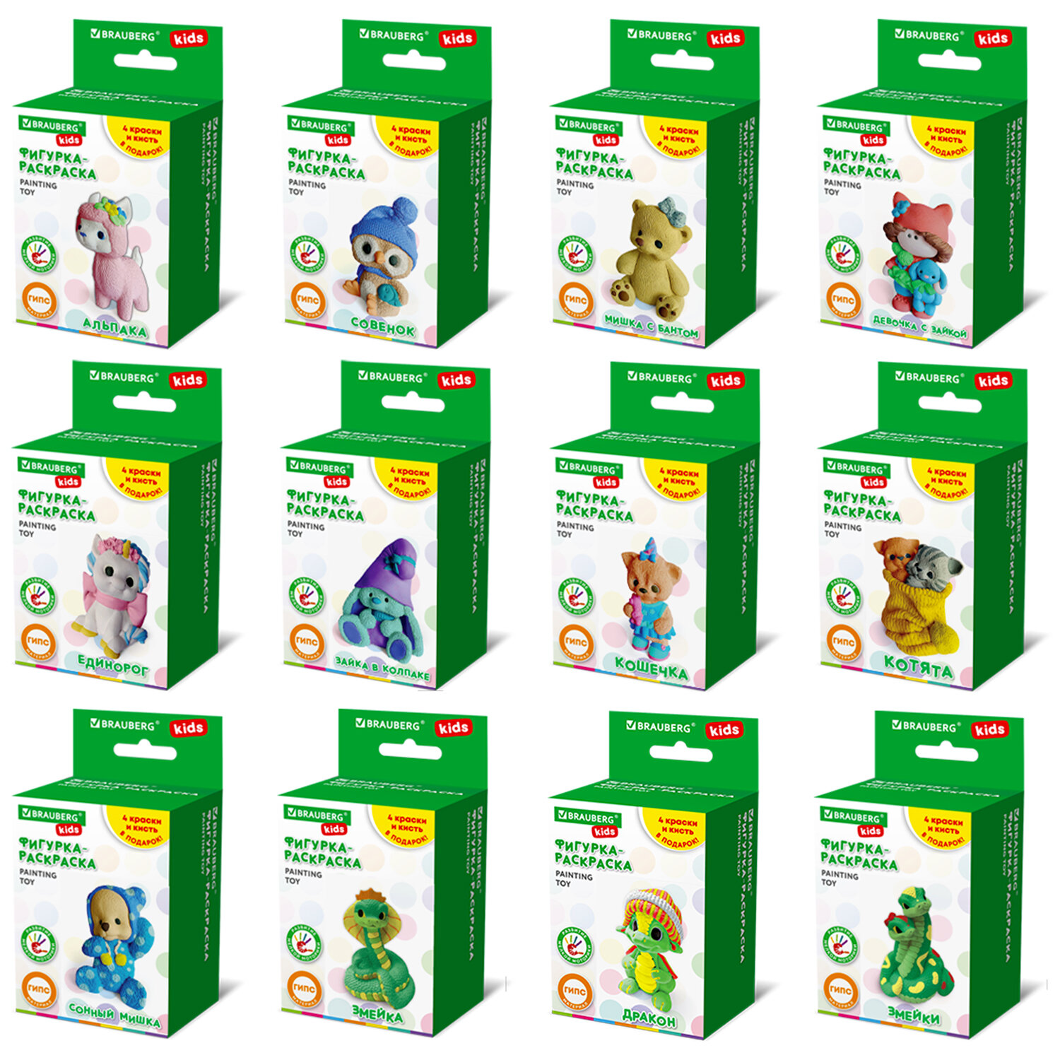 ФИГУРКА ИЗ ГИПСА с красками и кистью для росписи, ассорти, BRAUBERG KIDS Код товара: 665203 147,55 ₽ Купить Производитель:BRAUBERG KIDS Фигурка-раскраска из гипса BRAUBERG KIDS с набором красок – это набор для раскрашивания со всем необходимым внутри. Занятие росписью развивает у ребёнка усидчивость и креативное мышление. В набор фигурки для росписи BRAUBERG KIDS входят белая гипсовая фигурка, 5 гуашевых красок, кисточка, коробка с примером раскрашивания. Сочетания цветов для каждой фигурки были подобраны профессиональными художниками. Цвета красок внутри коробки соответствуют цветам, в которые раскрашена фигурка на фото упаковки. Каждая фигурка обладает рельефной поверхностью, на которую хорошо ложится краска. Из 14 дизайнов в транспортной упаковке находится ассорти из 12 разных фигурок без возможности выбора: альпака, совенок, мишка с бантом, девочка с зайкой, единорог, зайка в колпаке, сонный мишка, кошечка, котята, дракон, дракончики, змейки.Производство: РоссияТип товара: фигурка для росписиВид творчества: рисование (роспись)Количество предметов в наборе: 7 шт.Комплектация: кисть, краски, фигуркаВозрастная группа: 3+ летПол: универсальныйСюжет: ФигуркиМатериал: гипсДлина готового изделия: 8 смШирина готового изделия: 4 смГлубина готового изделия: 4 смУпаковка: картонная с европодвесомСрок годности: 36 месВес: 142 грРазмер упаковки: 6.9 × 14.3 × 8 смОбъём: 0.0008 м3Промежуточная упаковка: 12 штТранспортная упаковка: 12 штШтрих-код: 4606224391052 Сертификат-1.jpg Сертификат-2.jpg Сертификат-3.jpg