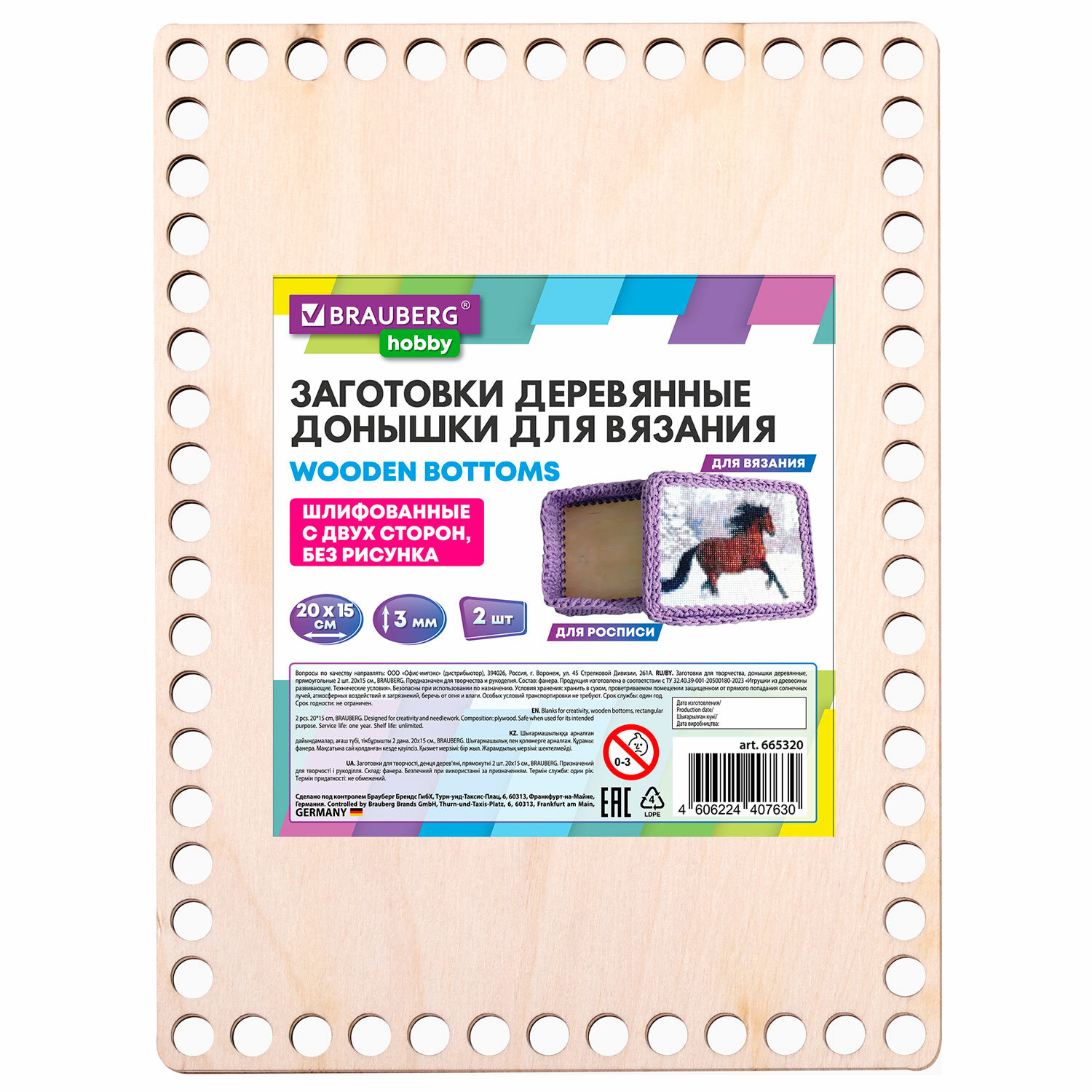 Донышки деревянные для вязания прямоугольные, 2 шт., 20х15 см, BRAUBERG HOBBY Ликвидация Код товара: 665320 86,7 ₽ Купить Производитель:BRAUBERG HOBBY Донышки для вязания деревянные BRAUBERG HOBBY – это материал для создания оригинальных и эксклюзивных декоративных изделий ручной работы. Например, корзинок, шкатулок, панно. Донышко для вязания представляет собой гладкое и шлифованное с обеих сторон прямоугольное деревянное основание размером 20х15 см и толщиной 3 мм, с 58 отверстиями по периметру, предназначенное для вязания крючком. Диаметр отверстий – 8 мм. В комплекте 2 штуки. Комплект донышек – это прочный, устойчивый круглый каркас для вязания своими руками, способствующий экономии пряжи. Основа подходит для плетения из шнура, толстых и тонких трикотажных нитей или джута. Заготовки выполнены из березовой фанеры - материала из дерева высшего сорта, по краям набора равномерно распределены отверстия без зазубрин и скосов. С помощью донышек можно создать корзинки для мелочей, шкатулки, копилки, кашпо, оригинальные женские косметички и сумочки, кукольные люльки, а также выбрать любой узор, расписать изделие по своему вкусу и украсить готовый предмет декоративным дополнением или этикеткой.Производство: РоссияТип товара: донышки для вязанияФормат: 15х20 смКоличество чистых досок: 2 шт.Количество насадок к выжигателю: 0 шт.Материал заготовок: фанераВозрастная группа от: 3Длина: 20 смШирина: 15 смТолщина: 3 ммУпаковка: термоусадочная пленкаВес: 119 грРазмер упаковки: 0.6 × 20.1 × 15.1 смОбъём: 0.0002 м3Промежуточная упаковка: 48 штТранспортная упаковка: 48 штШтрих-код: 4606224407630 Сертификат-1.jpg Сертификат-2.jpg Сертификат-3.jpg
