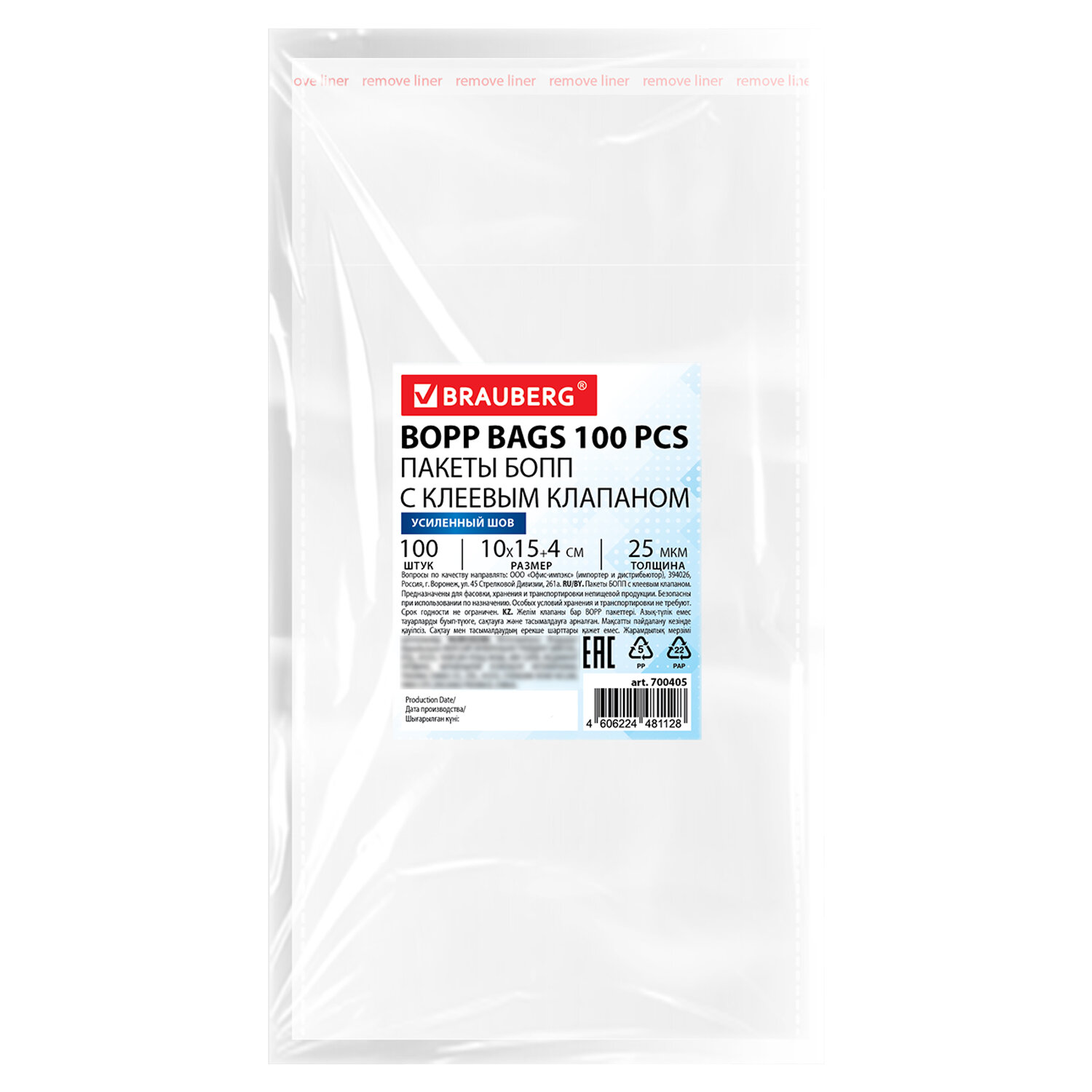 Пакеты БОПП с клеевым клапаном, КОМПЛЕКТ 100 штук, 10х15 + 4 см, 25 мкм, с усиленным швом, BRAUBERG