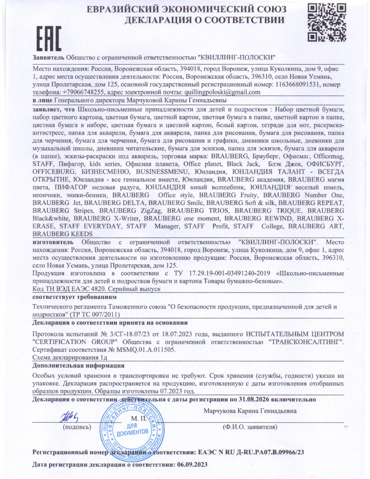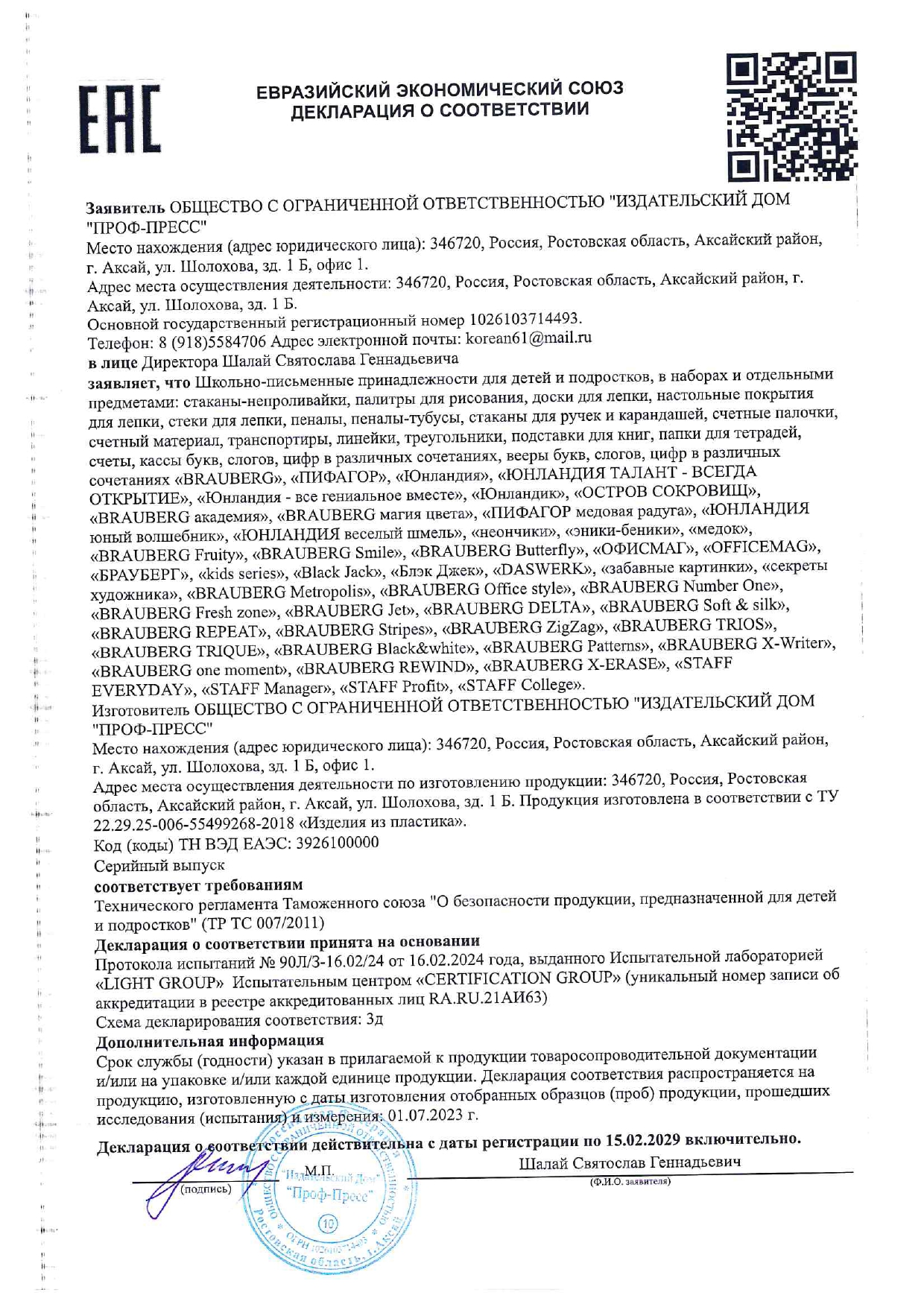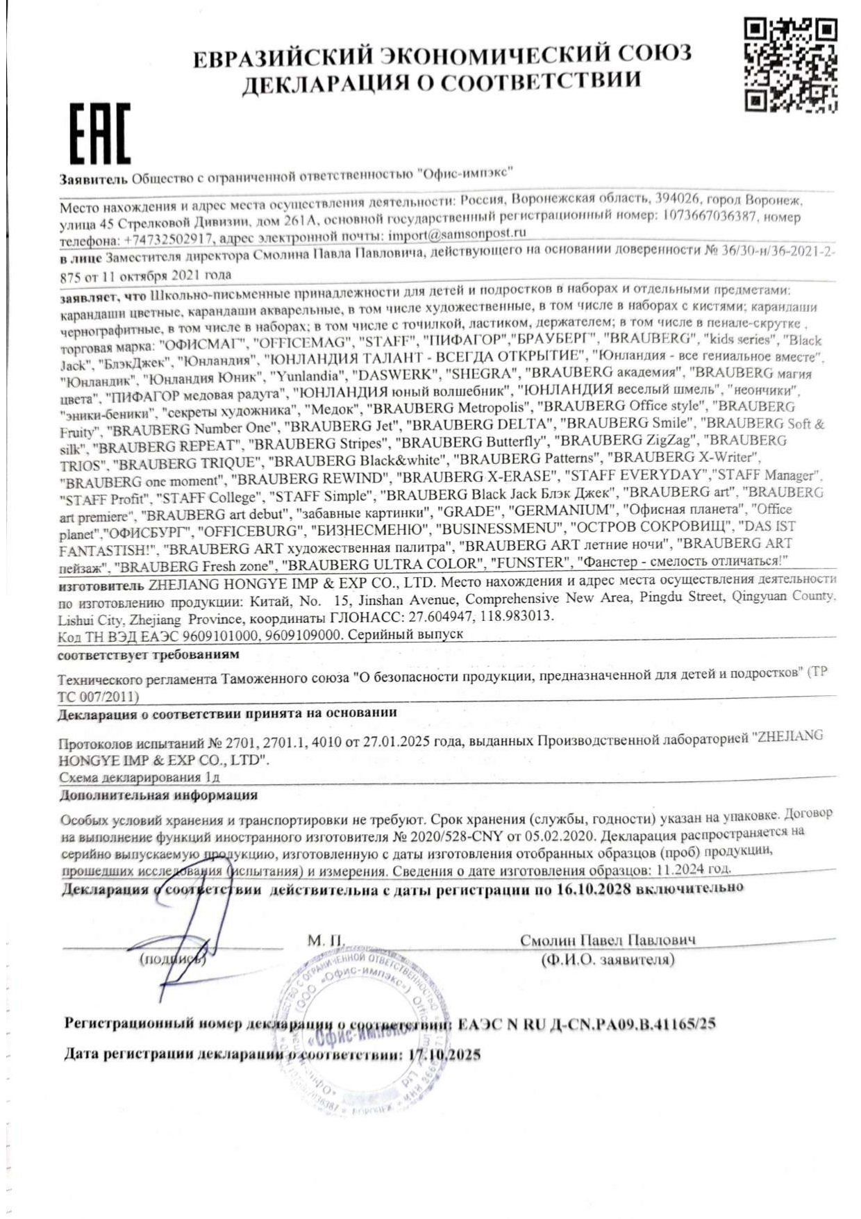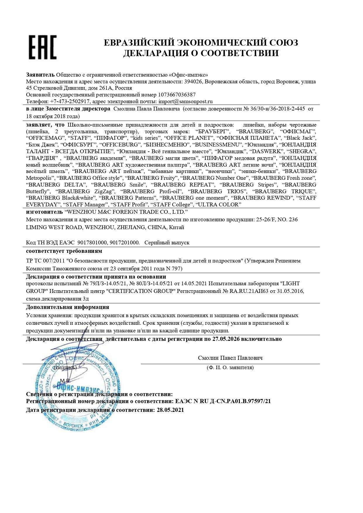 Набор школьных принадлежностей в подарочной коробке BRAUBERG "ШКОЛЬНЫЙ УНИВЕРСАЛЬНЫЙ", 50 предметов Код товара: 880123 1 319,66 ₽ Купить Производитель:BRAUBERG Набор канцелярских принадлежностей BRAUBERG "УНИВЕРСАЛЬНЫЙ" для выпускников детского сада и учеников начальной школы в красочной упаковке. Скомплектован на основе рекомендаций учителей. Все самые необходимые школьные принадлежности упакованы в удобный чемоданчик с ручкой. Состав набора: - ручка шариковая синяя - 5 шт.; - ручка шариковая зеленая - 1 шт.; - ручка шариковая черная - 1 шт.; - ручка шариковая красная - 1 шт.; - карандаш чернографитный – 4 шт.; - ластик - 1 шт.; - точилка - 1 шт.; - карандаши цветные 12 цветов - 1 шт.; - тетради в клетку 12 л. - 5 шт.; - тетради в линейку 12 л. - 5 шт.; - обложки для тетрадей - 10 шт.; - цветная бумага 10 цветов - 1 шт.; - картон цветной 12 цветов - 1 шт.; - картон белый 8 л. - 1 шт.; - ножницы, 130 мм. - 1 шт.; - клей-карандаш - 1 шт.; - альбом для рисования 20 л. - 1 шт.; - краски акварельные 12 цветов - 1 шт.; - фломастеры 12 цветов - 1 шт.; - папка-конверт, А5 - 1 шт.; - набор чертежный - 1 шт.; - набор кистей из 3 шт. - 1 шт.; - стакан-непроливайка - 1 шт.; - блокнот 60 л. - 1 шт.; - закладки клейкие 5 цветов - 1 шт.; - циркуль - 1 шт.; - короб подарочный - 1 шт. Набор представляет собой подарочную коробку-чемоданчик из плотного картона с красочным дизайном и наполнением. Короб дополнительно упакован в термоусадку. Состав набора разработан на основе рекомендаций учителей и пожеланий родителей таким образом, чтобы обеспечить школьника всем необходимым. В состав набора входят только сертифицированные отечественные и импортные школьные принадлежности, соответствующие требованиям безопасности детских товаров законодательства РФ.Производство: РоссияТип товара: набор школьникаКоличество предметов: 50 шт.Пол ребенка: универсальныйДлина: 33.7 смШирина: 25.7 смГлубина: 7.9 смМатериал упаковки: микрогофрокартонПодарочная упаковка: даСрок годности: 36 месВес: 2,01 кгРазмер упаковки: 10.3 × 34.4 × 28.9 смОбъём: 0.0118 м3Промежуточная упаковка: 4 штТранспортная упаковка: 4 штШтрих-код: 4606224320526 Файлы Сертификат-1.jpg Сертификат-2.jpg Сертификат-3.jpg Сертификат-4.jpg Сертификат-5.jpg Сертификат-6.jpg Сертификат-7.jpg Сертификат-8.jpg Сертификат-9.jpg Сертификат-10.jpg Сертификат-11.jpg Сертификат-12.jpg Сертификат-13.jpg Сертификат-14.jpg Сертификат-15.jpg Сертификат-16.jpg Сертификат-17.jpg Сертификат-18.jpg Сертификат-19.jpg Сертификат-20.jpg Сертификат-21.jpg Сертификат-22.jpg Сертификат-23.jpg Сертификат-24.jpg Сертификат-25.jpg Сертификат-26.jpg Сертификат-27.jpg Сертификат-28.jpg