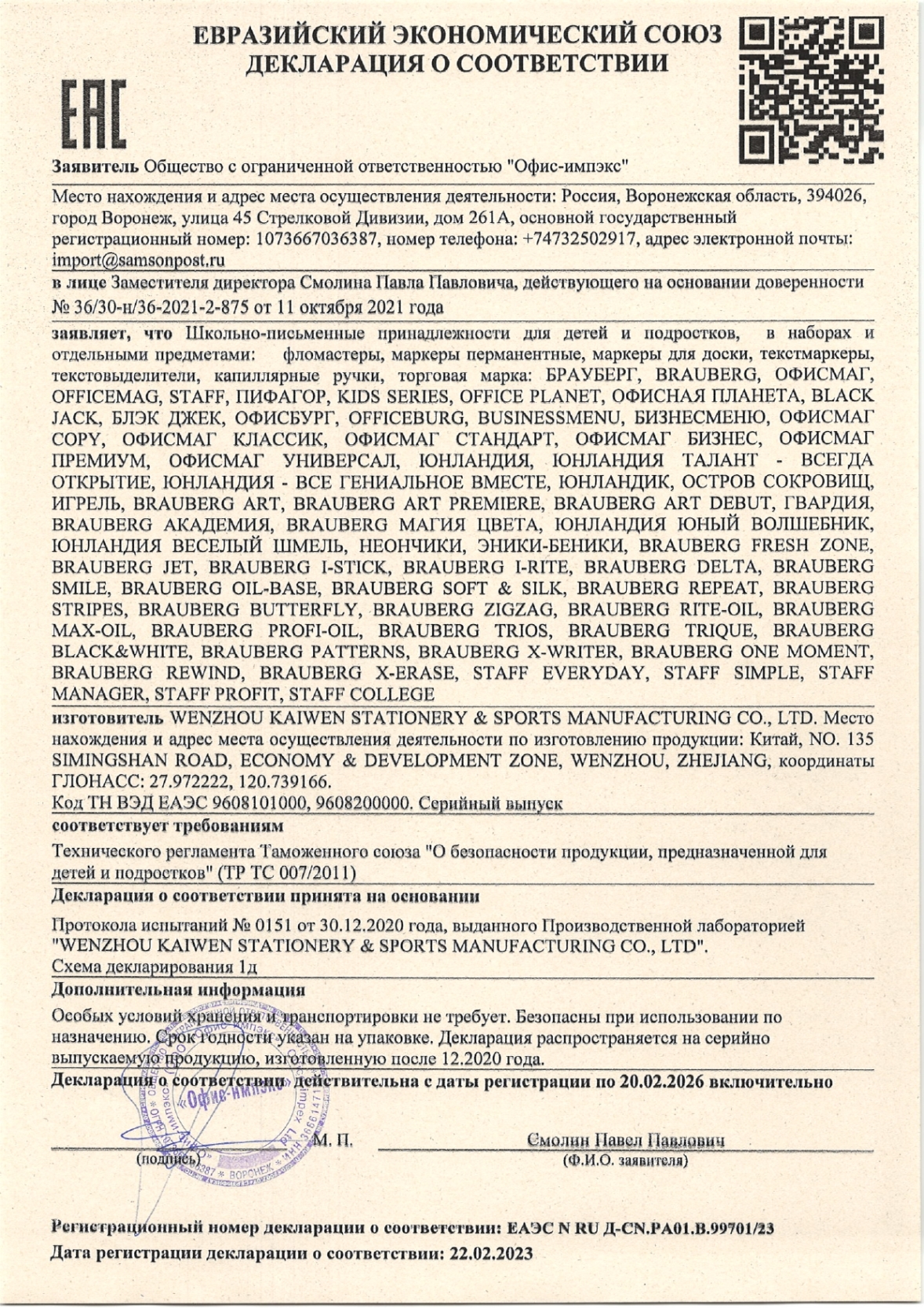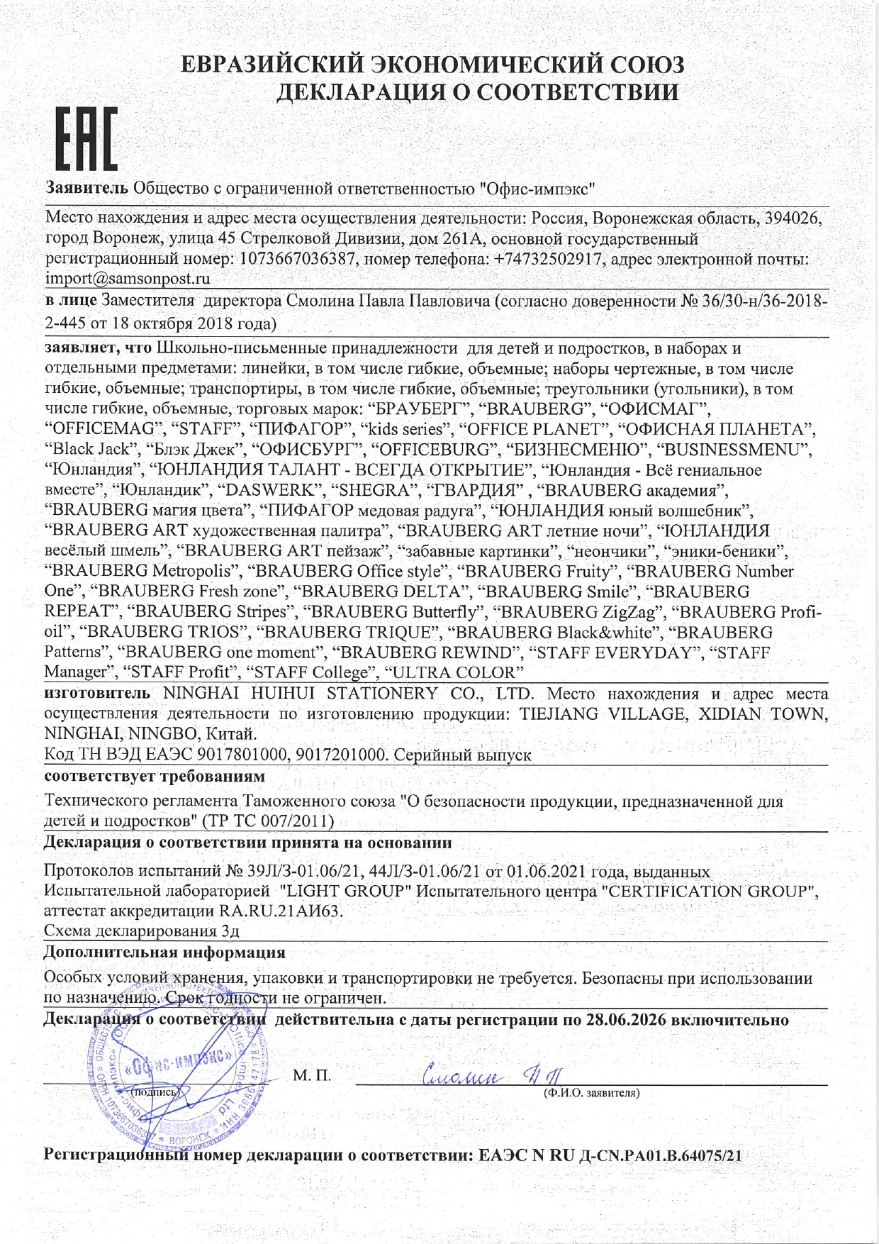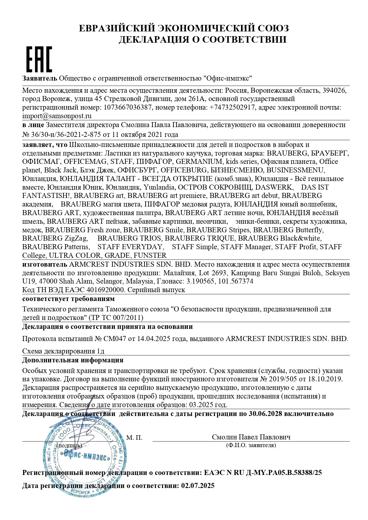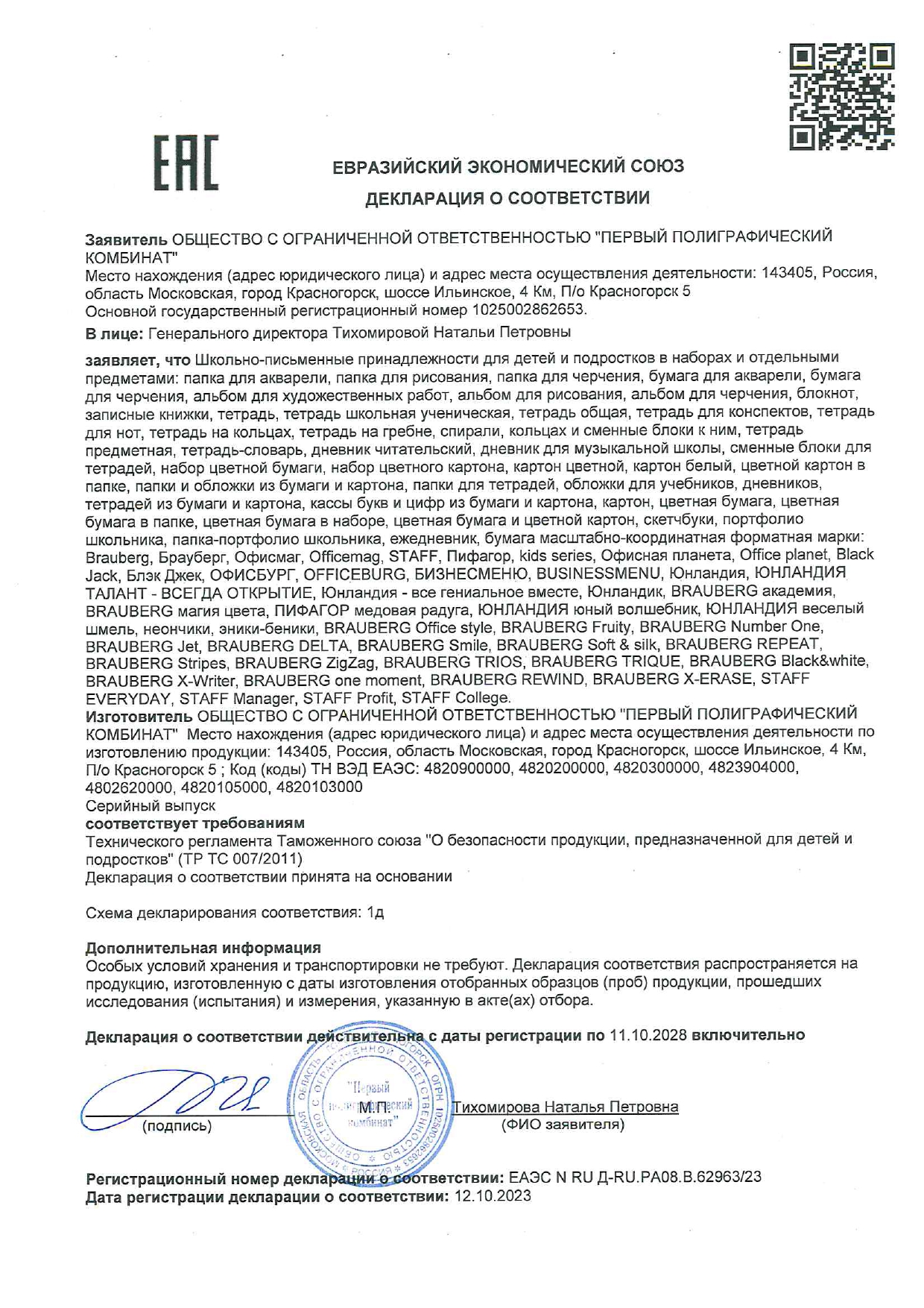 Набор школьных принадлежностей в подарочной коробке BRAUBERG "ШКОЛЬНЫЙ УНИВЕРСАЛЬНЫЙ", 50 предметов Код товара: 880123 1 319,66 ₽ Купить Производитель:BRAUBERG Набор канцелярских принадлежностей BRAUBERG "УНИВЕРСАЛЬНЫЙ" для выпускников детского сада и учеников начальной школы в красочной упаковке. Скомплектован на основе рекомендаций учителей. Все самые необходимые школьные принадлежности упакованы в удобный чемоданчик с ручкой. Состав набора: - ручка шариковая синяя - 5 шт.; - ручка шариковая зеленая - 1 шт.; - ручка шариковая черная - 1 шт.; - ручка шариковая красная - 1 шт.; - карандаш чернографитный – 4 шт.; - ластик - 1 шт.; - точилка - 1 шт.; - карандаши цветные 12 цветов - 1 шт.; - тетради в клетку 12 л. - 5 шт.; - тетради в линейку 12 л. - 5 шт.; - обложки для тетрадей - 10 шт.; - цветная бумага 10 цветов - 1 шт.; - картон цветной 12 цветов - 1 шт.; - картон белый 8 л. - 1 шт.; - ножницы, 130 мм. - 1 шт.; - клей-карандаш - 1 шт.; - альбом для рисования 20 л. - 1 шт.; - краски акварельные 12 цветов - 1 шт.; - фломастеры 12 цветов - 1 шт.; - папка-конверт, А5 - 1 шт.; - набор чертежный - 1 шт.; - набор кистей из 3 шт. - 1 шт.; - стакан-непроливайка - 1 шт.; - блокнот 60 л. - 1 шт.; - закладки клейкие 5 цветов - 1 шт.; - циркуль - 1 шт.; - короб подарочный - 1 шт. Набор представляет собой подарочную коробку-чемоданчик из плотного картона с красочным дизайном и наполнением. Короб дополнительно упакован в термоусадку. Состав набора разработан на основе рекомендаций учителей и пожеланий родителей таким образом, чтобы обеспечить школьника всем необходимым. В состав набора входят только сертифицированные отечественные и импортные школьные принадлежности, соответствующие требованиям безопасности детских товаров законодательства РФ.Производство: РоссияТип товара: набор школьникаКоличество предметов: 50 шт.Пол ребенка: универсальныйДлина: 33.7 смШирина: 25.7 смГлубина: 7.9 смМатериал упаковки: микрогофрокартонПодарочная упаковка: даСрок годности: 36 месВес: 2,01 кгРазмер упаковки: 10.3 × 34.4 × 28.9 смОбъём: 0.0118 м3Промежуточная упаковка: 4 штТранспортная упаковка: 4 штШтрих-код: 4606224320526 Файлы Сертификат-1.jpg Сертификат-2.jpg Сертификат-3.jpg Сертификат-4.jpg Сертификат-5.jpg Сертификат-6.jpg Сертификат-7.jpg Сертификат-8.jpg Сертификат-9.jpg Сертификат-10.jpg Сертификат-11.jpg Сертификат-12.jpg Сертификат-13.jpg Сертификат-14.jpg Сертификат-15.jpg Сертификат-16.jpg Сертификат-17.jpg Сертификат-18.jpg Сертификат-19.jpg Сертификат-20.jpg Сертификат-21.jpg Сертификат-22.jpg Сертификат-23.jpg Сертификат-24.jpg Сертификат-25.jpg Сертификат-26.jpg Сертификат-27.jpg Сертификат-28.jpg