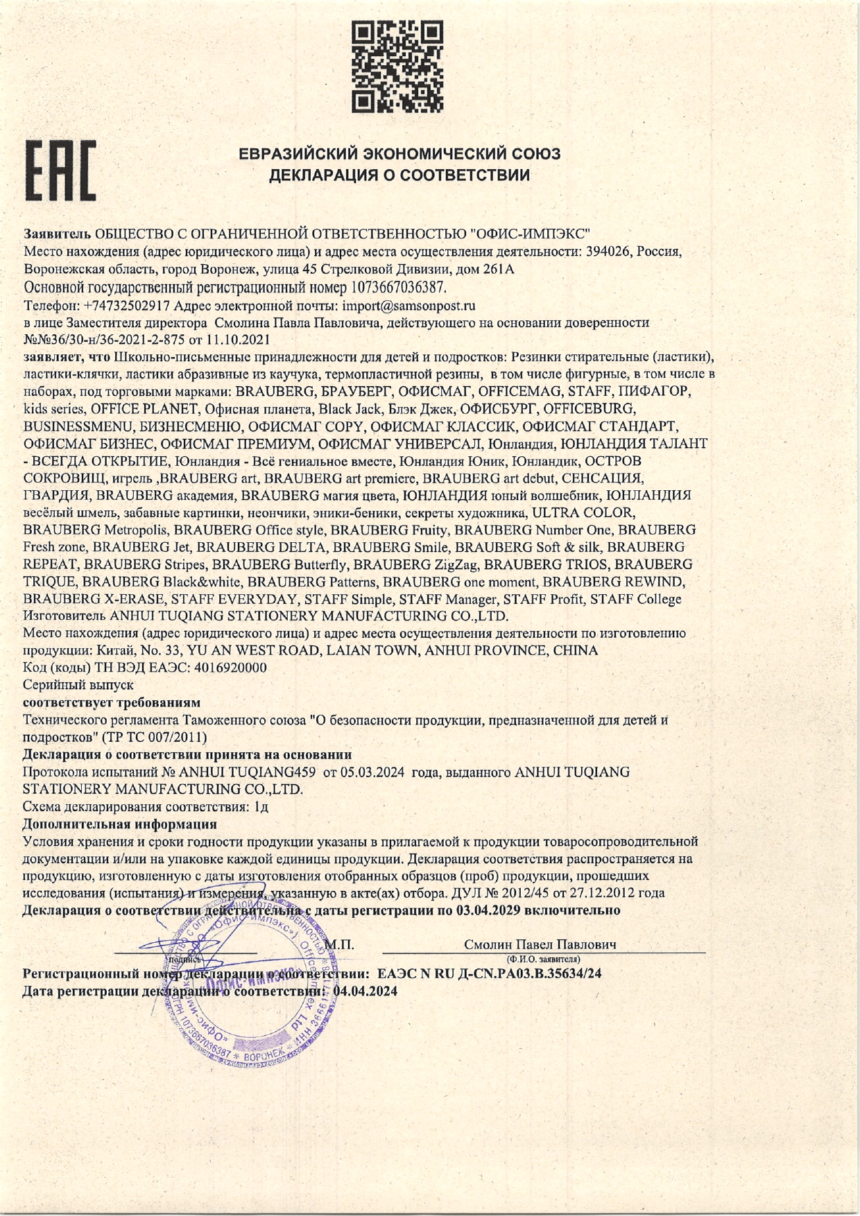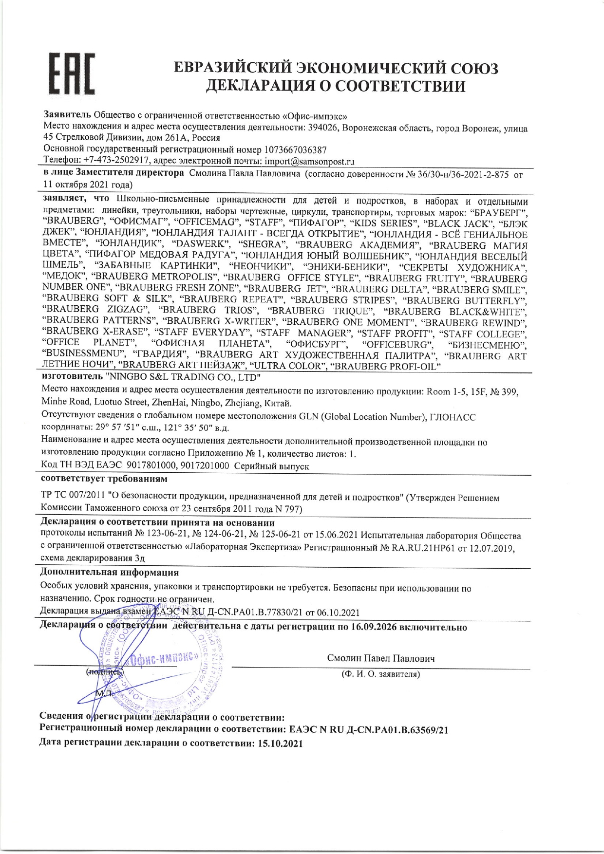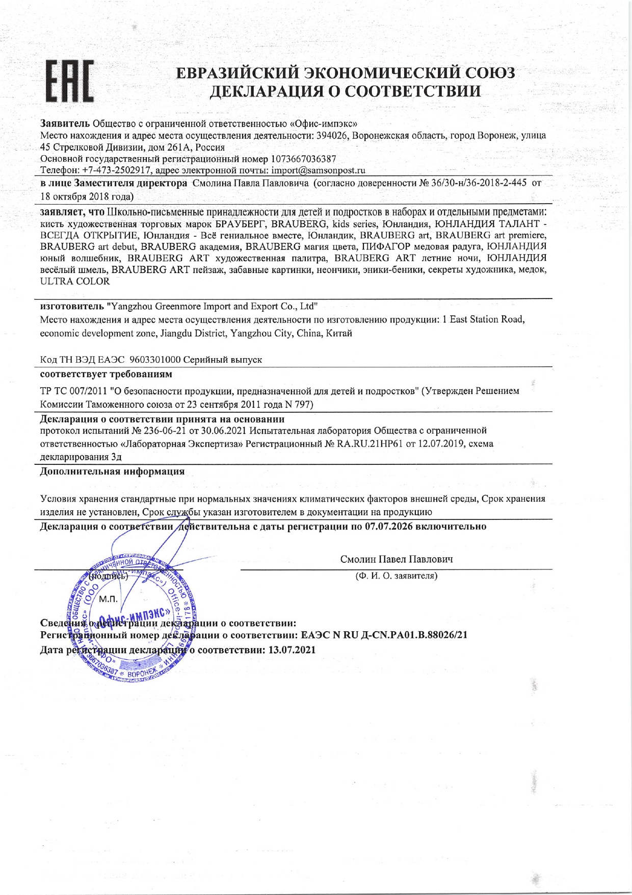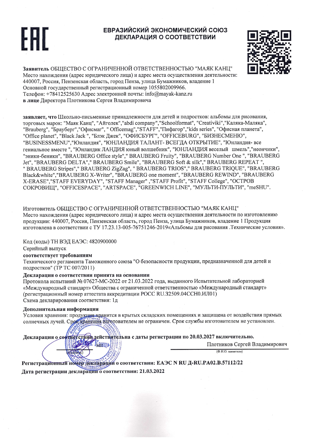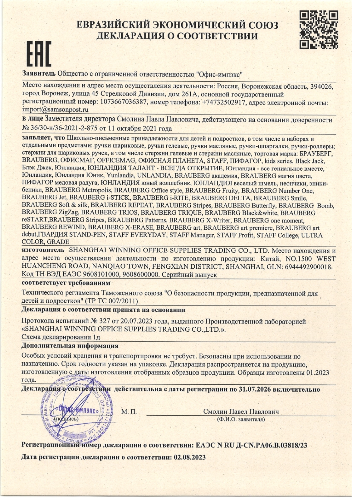 Набор школьных принадлежностей в подарочной коробке BRAUBERG "ШКОЛЬНЫЙ УНИВЕРСАЛЬНЫЙ", 50 предметов Код товара: 880123 1 319,66 ₽ Купить Производитель:BRAUBERG Набор канцелярских принадлежностей BRAUBERG "УНИВЕРСАЛЬНЫЙ" для выпускников детского сада и учеников начальной школы в красочной упаковке. Скомплектован на основе рекомендаций учителей. Все самые необходимые школьные принадлежности упакованы в удобный чемоданчик с ручкой. Состав набора: - ручка шариковая синяя - 5 шт.; - ручка шариковая зеленая - 1 шт.; - ручка шариковая черная - 1 шт.; - ручка шариковая красная - 1 шт.; - карандаш чернографитный – 4 шт.; - ластик - 1 шт.; - точилка - 1 шт.; - карандаши цветные 12 цветов - 1 шт.; - тетради в клетку 12 л. - 5 шт.; - тетради в линейку 12 л. - 5 шт.; - обложки для тетрадей - 10 шт.; - цветная бумага 10 цветов - 1 шт.; - картон цветной 12 цветов - 1 шт.; - картон белый 8 л. - 1 шт.; - ножницы, 130 мм. - 1 шт.; - клей-карандаш - 1 шт.; - альбом для рисования 20 л. - 1 шт.; - краски акварельные 12 цветов - 1 шт.; - фломастеры 12 цветов - 1 шт.; - папка-конверт, А5 - 1 шт.; - набор чертежный - 1 шт.; - набор кистей из 3 шт. - 1 шт.; - стакан-непроливайка - 1 шт.; - блокнот 60 л. - 1 шт.; - закладки клейкие 5 цветов - 1 шт.; - циркуль - 1 шт.; - короб подарочный - 1 шт. Набор представляет собой подарочную коробку-чемоданчик из плотного картона с красочным дизайном и наполнением. Короб дополнительно упакован в термоусадку. Состав набора разработан на основе рекомендаций учителей и пожеланий родителей таким образом, чтобы обеспечить школьника всем необходимым. В состав набора входят только сертифицированные отечественные и импортные школьные принадлежности, соответствующие требованиям безопасности детских товаров законодательства РФ.Производство: РоссияТип товара: набор школьникаКоличество предметов: 50 шт.Пол ребенка: универсальныйДлина: 33.7 смШирина: 25.7 смГлубина: 7.9 смМатериал упаковки: микрогофрокартонПодарочная упаковка: даСрок годности: 36 месВес: 2,01 кгРазмер упаковки: 10.3 × 34.4 × 28.9 смОбъём: 0.0118 м3Промежуточная упаковка: 4 штТранспортная упаковка: 4 штШтрих-код: 4606224320526 Файлы Сертификат-1.jpg Сертификат-2.jpg Сертификат-3.jpg Сертификат-4.jpg Сертификат-5.jpg Сертификат-6.jpg Сертификат-7.jpg Сертификат-8.jpg Сертификат-9.jpg Сертификат-10.jpg Сертификат-11.jpg Сертификат-12.jpg Сертификат-13.jpg Сертификат-14.jpg Сертификат-15.jpg Сертификат-16.jpg Сертификат-17.jpg Сертификат-18.jpg Сертификат-19.jpg Сертификат-20.jpg Сертификат-21.jpg Сертификат-22.jpg Сертификат-23.jpg Сертификат-24.jpg Сертификат-25.jpg Сертификат-26.jpg Сертификат-27.jpg Сертификат-28.jpg