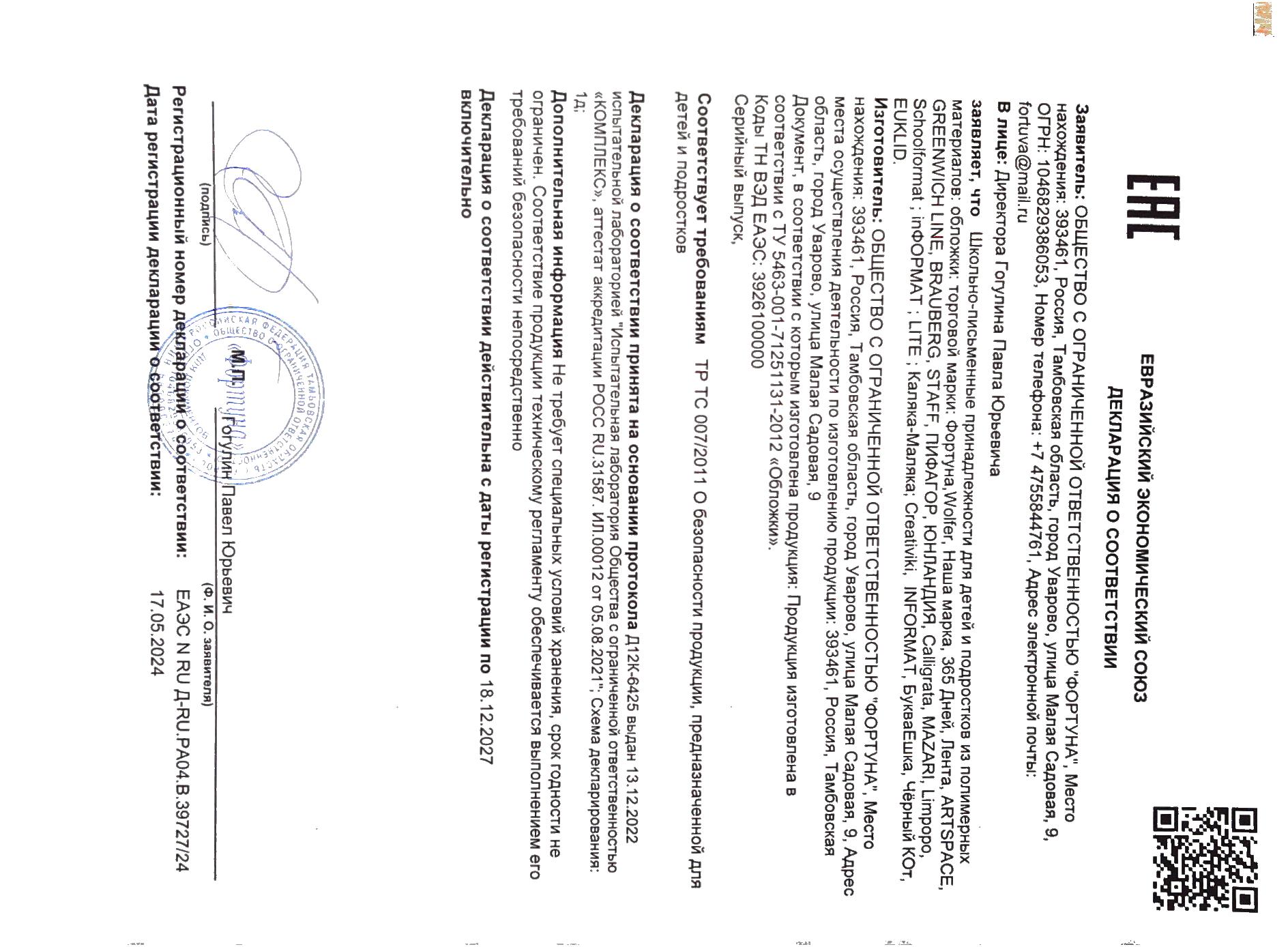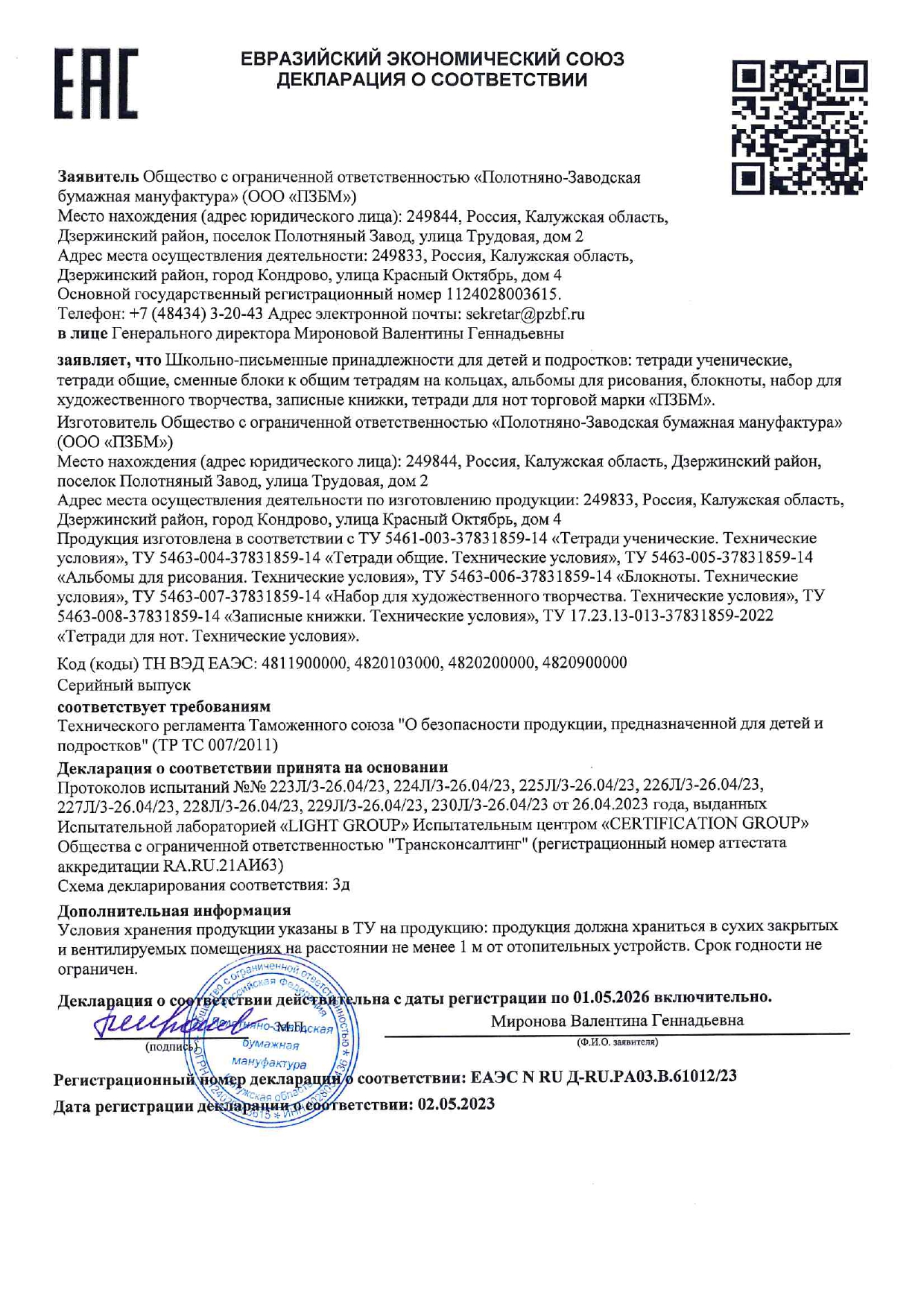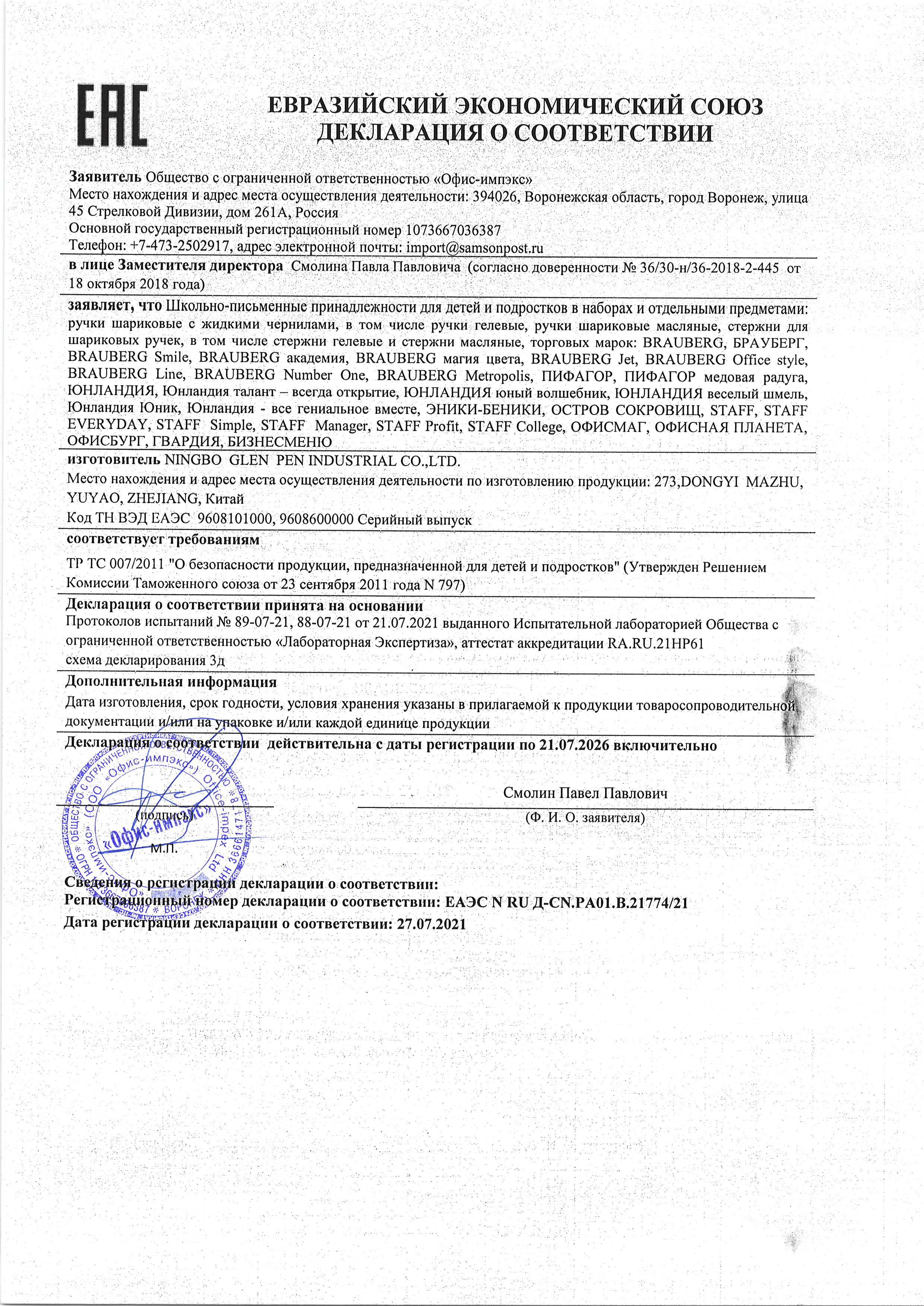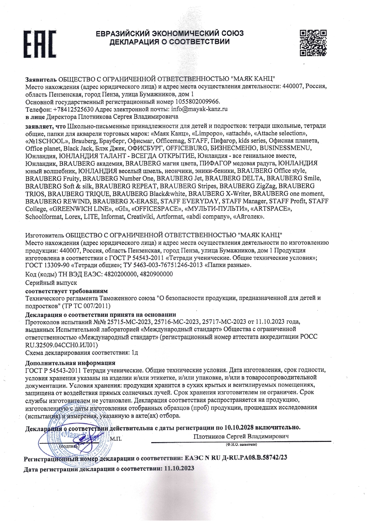 Набор школьных принадлежностей в подарочной коробке BRAUBERG "ШКОЛЬНЫЙ УНИВЕРСАЛЬНЫЙ", 50 предметов Код товара: 880123 1 319,66 ₽ Купить Производитель:BRAUBERG Набор канцелярских принадлежностей BRAUBERG "УНИВЕРСАЛЬНЫЙ" для выпускников детского сада и учеников начальной школы в красочной упаковке. Скомплектован на основе рекомендаций учителей. Все самые необходимые школьные принадлежности упакованы в удобный чемоданчик с ручкой. Состав набора: - ручка шариковая синяя - 5 шт.; - ручка шариковая зеленая - 1 шт.; - ручка шариковая черная - 1 шт.; - ручка шариковая красная - 1 шт.; - карандаш чернографитный – 4 шт.; - ластик - 1 шт.; - точилка - 1 шт.; - карандаши цветные 12 цветов - 1 шт.; - тетради в клетку 12 л. - 5 шт.; - тетради в линейку 12 л. - 5 шт.; - обложки для тетрадей - 10 шт.; - цветная бумага 10 цветов - 1 шт.; - картон цветной 12 цветов - 1 шт.; - картон белый 8 л. - 1 шт.; - ножницы, 130 мм. - 1 шт.; - клей-карандаш - 1 шт.; - альбом для рисования 20 л. - 1 шт.; - краски акварельные 12 цветов - 1 шт.; - фломастеры 12 цветов - 1 шт.; - папка-конверт, А5 - 1 шт.; - набор чертежный - 1 шт.; - набор кистей из 3 шт. - 1 шт.; - стакан-непроливайка - 1 шт.; - блокнот 60 л. - 1 шт.; - закладки клейкие 5 цветов - 1 шт.; - циркуль - 1 шт.; - короб подарочный - 1 шт. Набор представляет собой подарочную коробку-чемоданчик из плотного картона с красочным дизайном и наполнением. Короб дополнительно упакован в термоусадку. Состав набора разработан на основе рекомендаций учителей и пожеланий родителей таким образом, чтобы обеспечить школьника всем необходимым. В состав набора входят только сертифицированные отечественные и импортные школьные принадлежности, соответствующие требованиям безопасности детских товаров законодательства РФ.Производство: РоссияТип товара: набор школьникаКоличество предметов: 50 шт.Пол ребенка: универсальныйДлина: 33.7 смШирина: 25.7 смГлубина: 7.9 смМатериал упаковки: микрогофрокартонПодарочная упаковка: даСрок годности: 36 месВес: 2,01 кгРазмер упаковки: 10.3 × 34.4 × 28.9 смОбъём: 0.0118 м3Промежуточная упаковка: 4 штТранспортная упаковка: 4 штШтрих-код: 4606224320526 Файлы Сертификат-1.jpg Сертификат-2.jpg Сертификат-3.jpg Сертификат-4.jpg Сертификат-5.jpg Сертификат-6.jpg Сертификат-7.jpg Сертификат-8.jpg Сертификат-9.jpg Сертификат-10.jpg Сертификат-11.jpg Сертификат-12.jpg Сертификат-13.jpg Сертификат-14.jpg Сертификат-15.jpg Сертификат-16.jpg Сертификат-17.jpg Сертификат-18.jpg Сертификат-19.jpg Сертификат-20.jpg Сертификат-21.jpg Сертификат-22.jpg Сертификат-23.jpg Сертификат-24.jpg Сертификат-25.jpg Сертификат-26.jpg Сертификат-27.jpg Сертификат-28.jpg