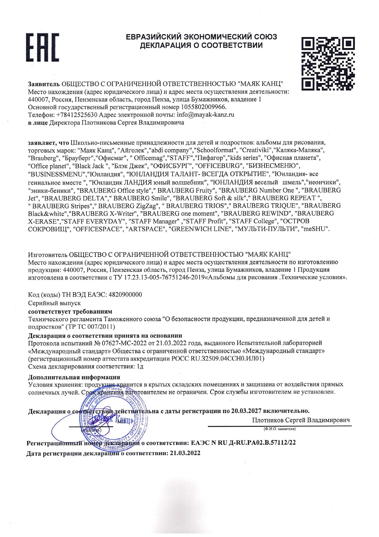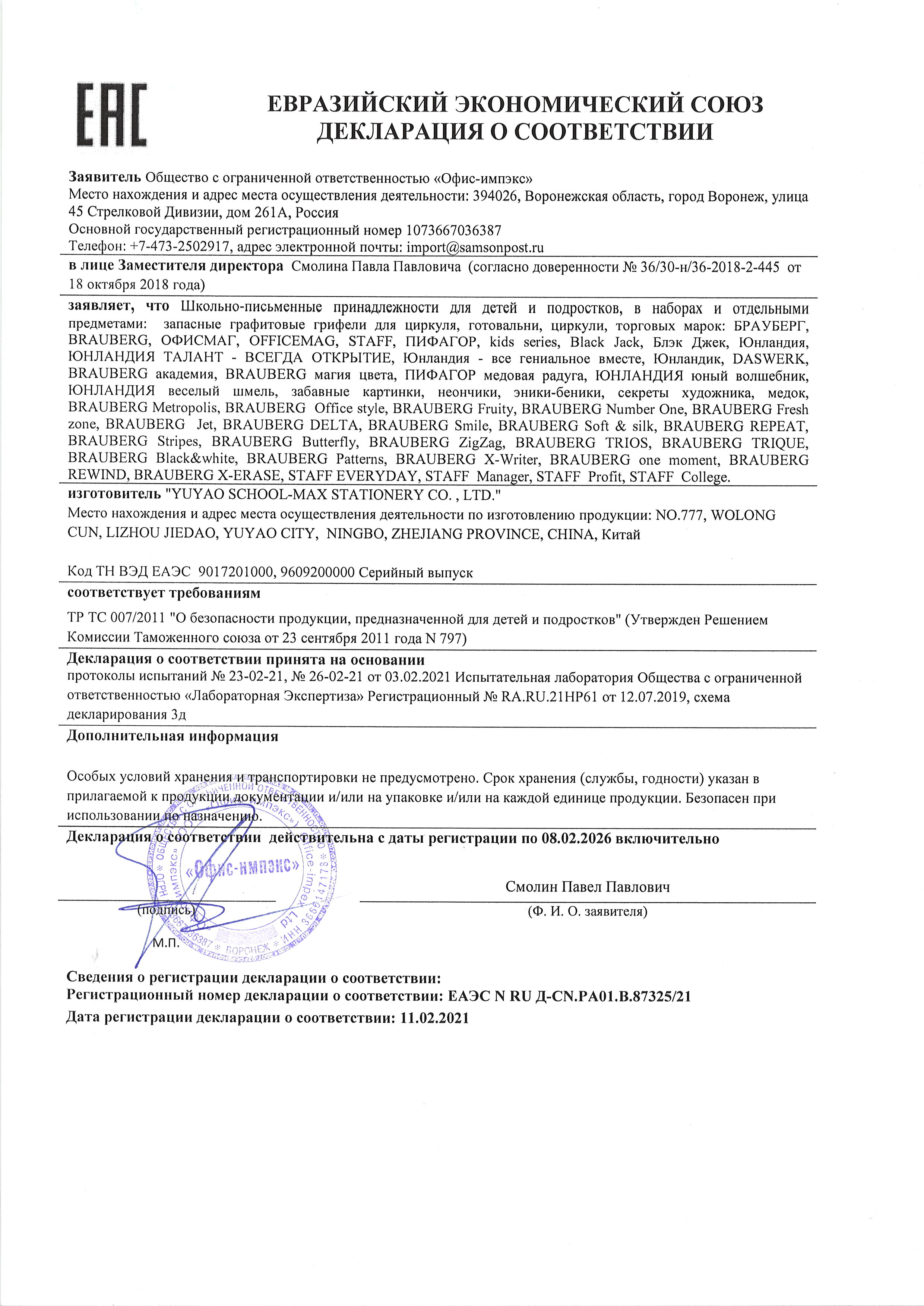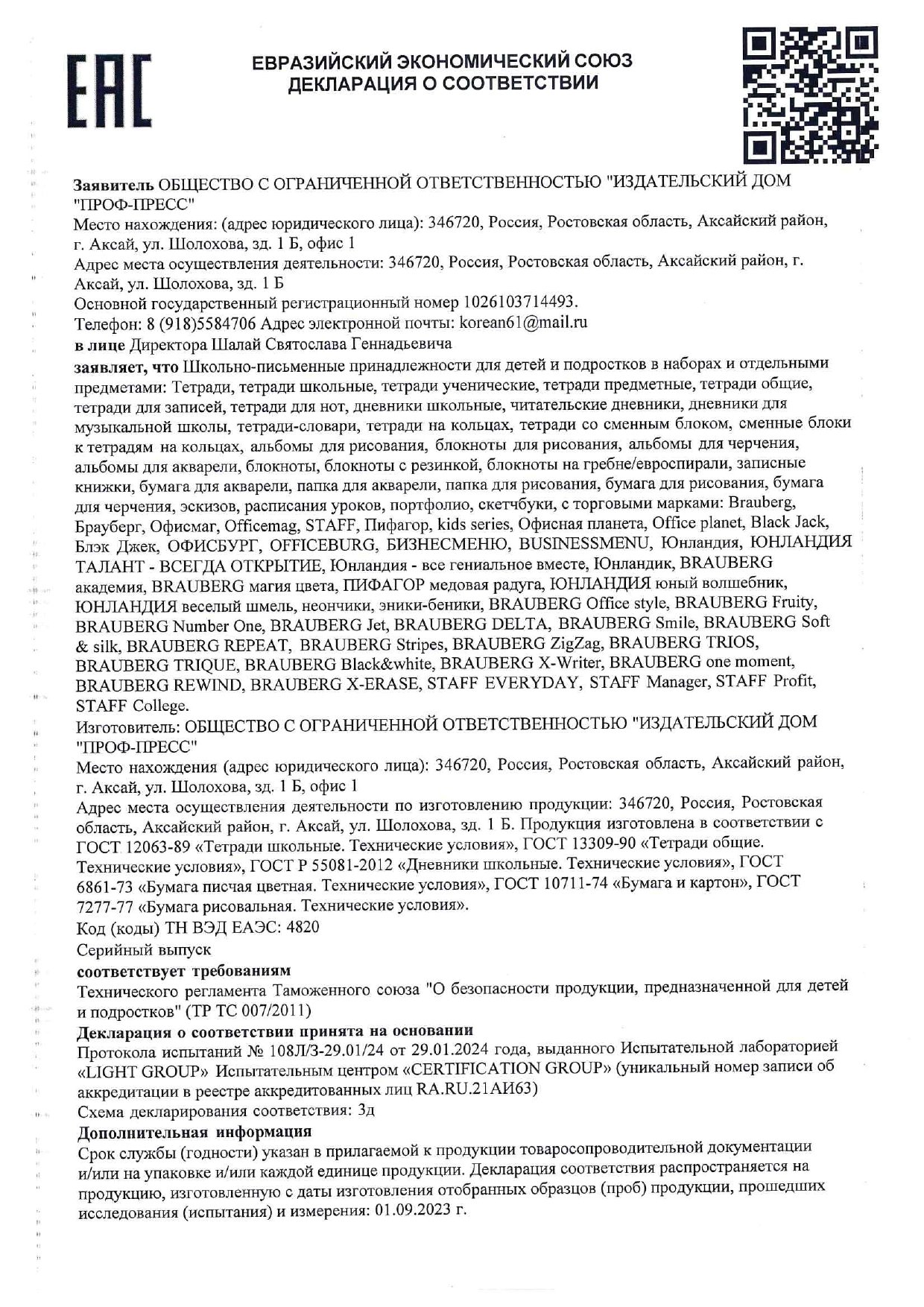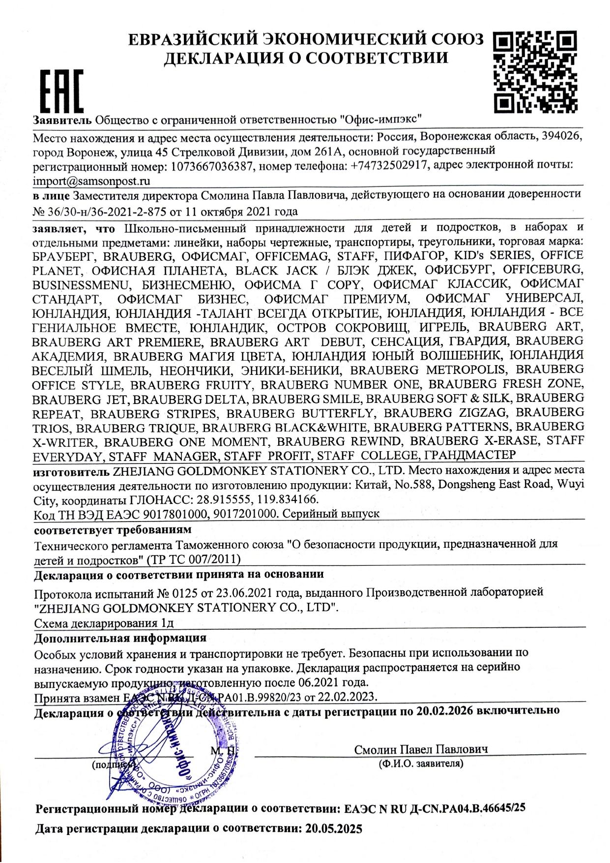 Набор школьных принадлежностей в подарочной коробке BRAUBERG "ШКОЛЬНЫЙ УНИВЕРСАЛЬНЫЙ", 65 предметов Код товара: 881133 1 526,05 ₽ Купить Производитель:BRAUBERG Набор канцелярских принадлежностей BRAUBERG "УНИВЕРСАЛЬНЫЙ" для выпускников детского сада и учеников начальной школы в красочной упаковке. Скомплектован на основе рекомендаций учителей. Все самые необходимые школьные принадлежности упакованы в удобный чемоданчик с ручкой. Состав набора: • ручка шариковая синяя – 5 шт.; • ручка шариковая зеленая – 1 шт.; • ручка шариковая черная – 1 шт.; • ручка шариковая красная – 1 шт.; • карандаш чернографитный – 4 шт.; • ластик – 2 шт.; • точилка – 1 шт.; • карандаши цветные в наборе – 1 шт.; • тетради в клетку 12 л. – 7 шт.; • тетради в линейку 12 л. – 7 шт.; • обложки для тетрадей – 14 шт.; • цветная бумага в наборе – 1 шт.; • картон цветной в наборе – 1 шт.; • картон белый в наборе – 1 шт.; • ножницы – 1 шт.; • клей-карандаш – 1 шт.; • альбом для рисования – 1 шт.; • краски акварельные – 1 шт.; • фломастеры в наборе – 1 шт.; • папка-конверт А5 – 1 шт.; • набор чертежный – 1 шт.; • кисти для рисования – 3 шт.; • стакан-непроливайка – 1 шт.; • блокнот – 1 шт.; • закладки клейкие в наборе – 1 шт.; • циркуль – 1 шт.; • расписание уроков А4 – 4 шт.; • короб подарочный – 1 шт. Набор представляет собой подарочную коробку-чемоданчик из плотного картона с красочным дизайном и наполнением. Подарочный короб дополнительно упакован в бурый гофрокороб. Состав набора разработан на основе рекомендаций учителей и пожеланий родителей таким образом, чтобы обеспечить школьника всем необходимым. В состав набора входят только сертифицированные отечественные и импортные школьные принадлежности, соответствующие требованиям безопасности детских товаров законодательства РФ.Производство: РоссияТип товара: набор школьникаКоличество предметов: 65 шт.Пол ребенка: универсальныйДлина: 33.7 смШирина: 25.7 смГлубина: 7.9 смМатериал упаковки: микрогофрокартонПодарочная упаковка: даСрок годности: 36 месВес: 2,01 кгРазмер упаковки: 10.2 × 34.4 × 28.8 смОбъём: 0.0118 м3Промежуточная упаковка: 4 штТранспортная упаковка: 4 штШтрих-код: 4606224473987 Файлы Сертификат-1.jpg Сертификат-2.jpg Сертификат-3.jpg Сертификат-4.jpg Сертификат-5.jpg Сертификат-6.jpg Сертификат-7.jpg Сертификат-8.jpg Сертификат-9.jpg Сертификат-10.jpg Сертификат-11.jpg Сертификат-12.jpg Сертификат-13.jpg Сертификат-14.jpg Сертификат-15.jpg Сертификат-16.jpg Сертификат-17.jpg Сертификат-18.jpg Сертификат-19.jpg Сертификат-20.jpg Сертификат-21.jpg Сертификат-22.jpg Сертификат-23.jpg Сертификат-24.jpg Сертификат-25.jpg Сертификат-26.jpg