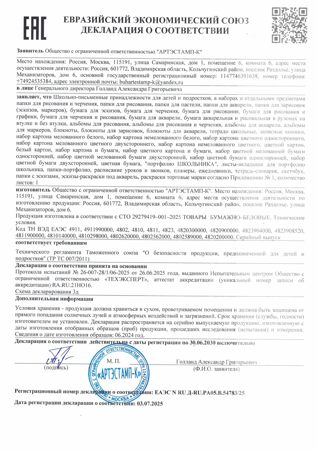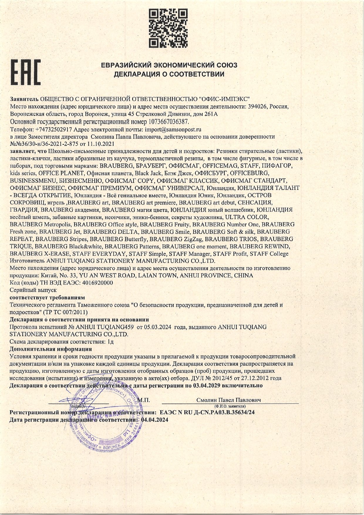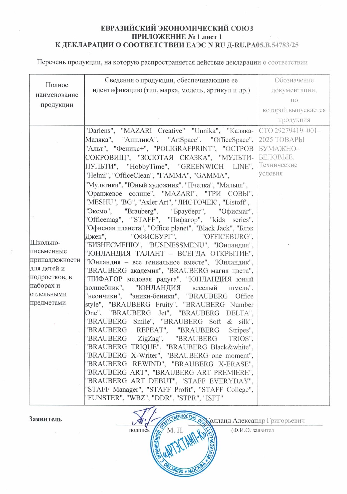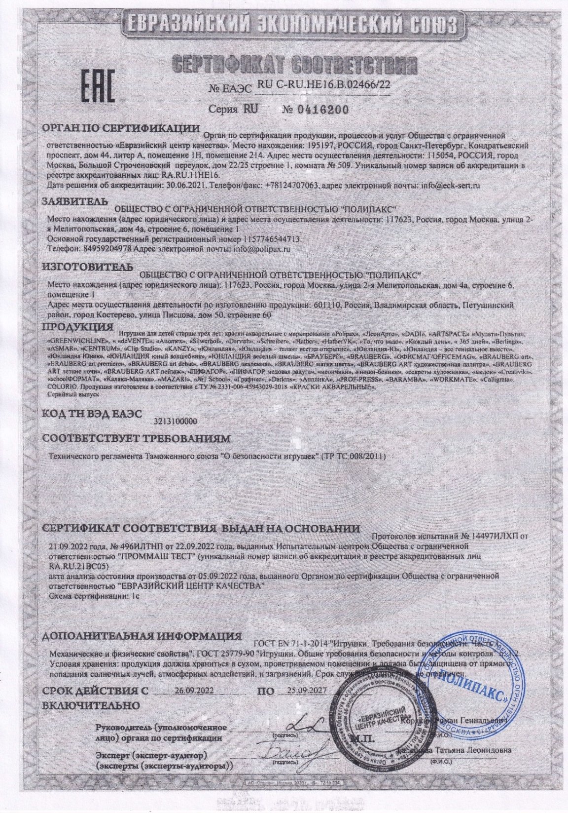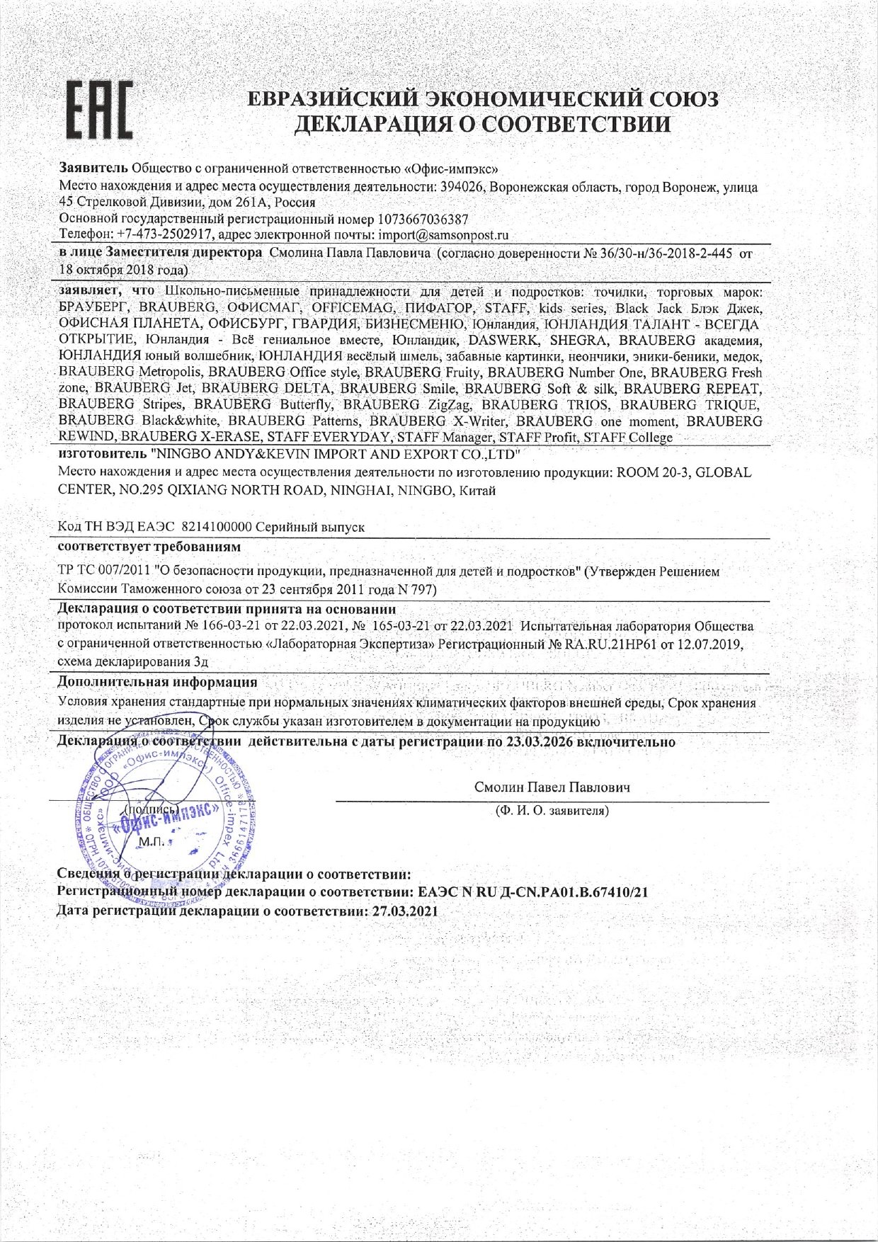 Набор школьных принадлежностей в подарочной коробке BRAUBERG "ШКОЛЬНЫЙ УНИВЕРСАЛЬНЫЙ", 65 предметов Код товара: 881133 1 526,05 ₽ Купить Производитель:BRAUBERG Набор канцелярских принадлежностей BRAUBERG "УНИВЕРСАЛЬНЫЙ" для выпускников детского сада и учеников начальной школы в красочной упаковке. Скомплектован на основе рекомендаций учителей. Все самые необходимые школьные принадлежности упакованы в удобный чемоданчик с ручкой. Состав набора: • ручка шариковая синяя – 5 шт.; • ручка шариковая зеленая – 1 шт.; • ручка шариковая черная – 1 шт.; • ручка шариковая красная – 1 шт.; • карандаш чернографитный – 4 шт.; • ластик – 2 шт.; • точилка – 1 шт.; • карандаши цветные в наборе – 1 шт.; • тетради в клетку 12 л. – 7 шт.; • тетради в линейку 12 л. – 7 шт.; • обложки для тетрадей – 14 шт.; • цветная бумага в наборе – 1 шт.; • картон цветной в наборе – 1 шт.; • картон белый в наборе – 1 шт.; • ножницы – 1 шт.; • клей-карандаш – 1 шт.; • альбом для рисования – 1 шт.; • краски акварельные – 1 шт.; • фломастеры в наборе – 1 шт.; • папка-конверт А5 – 1 шт.; • набор чертежный – 1 шт.; • кисти для рисования – 3 шт.; • стакан-непроливайка – 1 шт.; • блокнот – 1 шт.; • закладки клейкие в наборе – 1 шт.; • циркуль – 1 шт.; • расписание уроков А4 – 4 шт.; • короб подарочный – 1 шт. Набор представляет собой подарочную коробку-чемоданчик из плотного картона с красочным дизайном и наполнением. Подарочный короб дополнительно упакован в бурый гофрокороб. Состав набора разработан на основе рекомендаций учителей и пожеланий родителей таким образом, чтобы обеспечить школьника всем необходимым. В состав набора входят только сертифицированные отечественные и импортные школьные принадлежности, соответствующие требованиям безопасности детских товаров законодательства РФ.Производство: РоссияТип товара: набор школьникаКоличество предметов: 65 шт.Пол ребенка: универсальныйДлина: 33.7 смШирина: 25.7 смГлубина: 7.9 смМатериал упаковки: микрогофрокартонПодарочная упаковка: даСрок годности: 36 месВес: 2,01 кгРазмер упаковки: 10.2 × 34.4 × 28.8 смОбъём: 0.0118 м3Промежуточная упаковка: 4 штТранспортная упаковка: 4 штШтрих-код: 4606224473987 Файлы Сертификат-1.jpg Сертификат-2.jpg Сертификат-3.jpg Сертификат-4.jpg Сертификат-5.jpg Сертификат-6.jpg Сертификат-7.jpg Сертификат-8.jpg Сертификат-9.jpg Сертификат-10.jpg Сертификат-11.jpg Сертификат-12.jpg Сертификат-13.jpg Сертификат-14.jpg Сертификат-15.jpg Сертификат-16.jpg Сертификат-17.jpg Сертификат-18.jpg Сертификат-19.jpg Сертификат-20.jpg Сертификат-21.jpg Сертификат-22.jpg Сертификат-23.jpg Сертификат-24.jpg Сертификат-25.jpg Сертификат-26.jpg