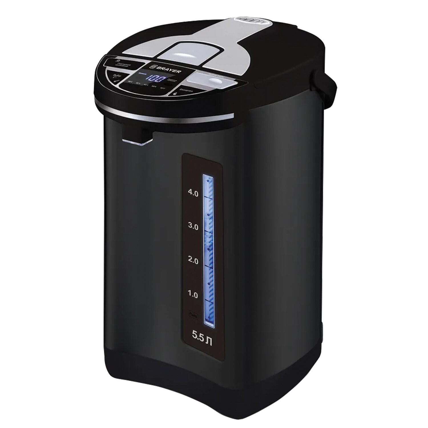 Термопот на 5,5 литров, 2 режима подачи воды, BRAYER BR1091, 1450 Вт, 5 температурных режимов Код товара: 456079 7 619,12 ₽ Купить Производитель:BRAYER Термопот BRAYER BR1091 – это идеальное решение для тех, кто ценит комфорт и функциональность. Этот прибор обеспечивает горячей водой 24 часа в сутки, что делает его незаменимым помощником в большой семье. Вместительный объём 5,5 литров и мощность 1450 Вт позволяют быстро нагревать воду и поддерживать её температуру на нужном уровне. Корпус и внутренняя колба термопота выполнены из высококачественной нержавеющей стали, что обеспечивает долговечность и надёжность. Устройство оснащено LCD-дисплеем, на котором отображается текущая температура воды, что позволяет легко контролировать процесс нагрева. Термопот предлагает два удобных способа подачи воды: автоматический и с помощью нажатия чашкой на клапан. Вы можете выбрать одну из пяти температурных режимов (45/55/65/85/98 °C), что особенно важно для заваривания разных сортов чая или приготовления детского питания. Безопасность использования обеспечивается функцией автоотключения при отсутствии воды, защитой от перегрева и блокировкой подачи воды. Вращающийся корпус на 360° делает использование термопота максимально удобным. Производитель оставляет за собой право без предварительного уведомления вносить изменения в технические характеристики, комплектацию и конструкцию, не ухудшающие эксплуатационные характеристики изделия.Производство: КитайОбъем: 5.5 лМощность: 1450 ВтПанель управления: механическаяИндикатор уровня воды: даВыставляемые температуры: даФункция повторного кипячения: даАвтоотключение при закипании: даОтключение при отсутствии воды: даПоддержание температуры воды: даВид нагревательного элемента: закрытыйТип насоса: электрический Дисплей: даПодсветка: даРучка для переноски: даДлина шнура: 1.2 мМатериал корпуса: пластикЦвет: черныйСерия: BR1091Ширина: 255 ммВысота: 425 ммГлубина: 330 ммВес: 3.4 кгРазмер упаковки: 25.5 × 43.8 × 32.8 смОбъём: 0.0421 м3Промежуточная упаковка: 4 штТранспортная упаковка: 4 штШтрих-код: 9120099331340 Файлы Приложение-1.pdf Сертификат-1.jpg Сертификат-2.jpg Сертификат-3.jpg Сертификат-4.jpg Сертификат-5.jpg Сертификат-6.jpg Сертификат-7.jpg Сертификат-8.jpg Сертификат-9.jpg