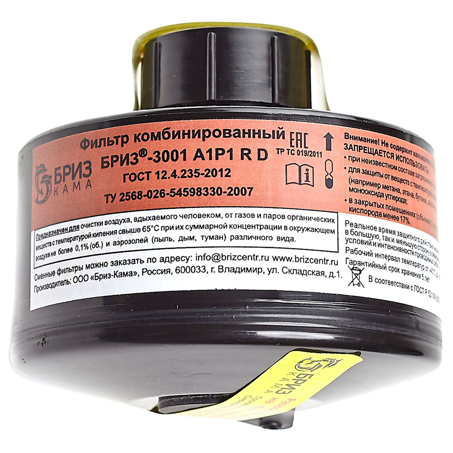 Фильтр противогазовый комбинированный БРИЗ-3001, органические газы и пары, аэрозоли, класса А1Р1 Код товара: 610957 989,6 ₽ Купить Производитель:Бриз-Кама Фильтр комбинированный серии БРИЗ-3001 A1P1 R D применяется для очистки выдыхаемого загрязненного воздуха от паров и газов органических веществ с температурой кипения выше 65 °С. Применяется для очистки выдыхаемого загрязненного воздуха от циклогексана, бензола, ксилола, толуола, ацетонитрила, нитробензола, тетраэтилсвинца, фенола, фурфурола и других химических соединений, включая аерозоли. Фильтр A1P1 R D первого класса защиты предназначен для использования совместно с масками серии БРИЗ-4301 (ППМ) или лицевыми частями ШМП-1 в составе промышленного противогаза БРИЗ-3301 (ППФ), а также с любыми другими лицевыми частями с соединительной резьбой по ГОСТ 8762-75. Время защитного действия по по циклогексану при С0=3500 мг/м3 – 70 минут. Фильтр применяется при объемной доле свободного кислорода не менее 17%. Корпус фильтра изготовлен из специальной пластмассы. Соединительная резьба соответствует ГОСТ 8762-75 (40х4 мм). Характеристики: 1) марка фильтра – A1P1; 2) масса – не более 280 г; 3) проницаемость фильтра – не более 20% Соответствует – ТР ТС 019/2011 и ТУ 2568-022-54598330-2006.Производство: РоссияТип товара: расходные материалыВид: фильтрСтепень защиты до: органические газы и пары с t кипения >65°C, аэрозолиКласс фильтра: А1Р1 R DСоответствие стандартам: ТР ТС 019/2011 и ТУ 2568-022-54598330-2006Количество в упаковке: 1 шт.Способ крепления: резьбовойВес: 381 грРазмер упаковки: 11 × 10.8 × 10.9 смОбъём: 0.0017 м3Промежуточная упаковка: 30 штТранспортная упаковка: 30 штШтрих-код: 4631149575447 Сертификат-1.jpg Сертификат-2.jpg