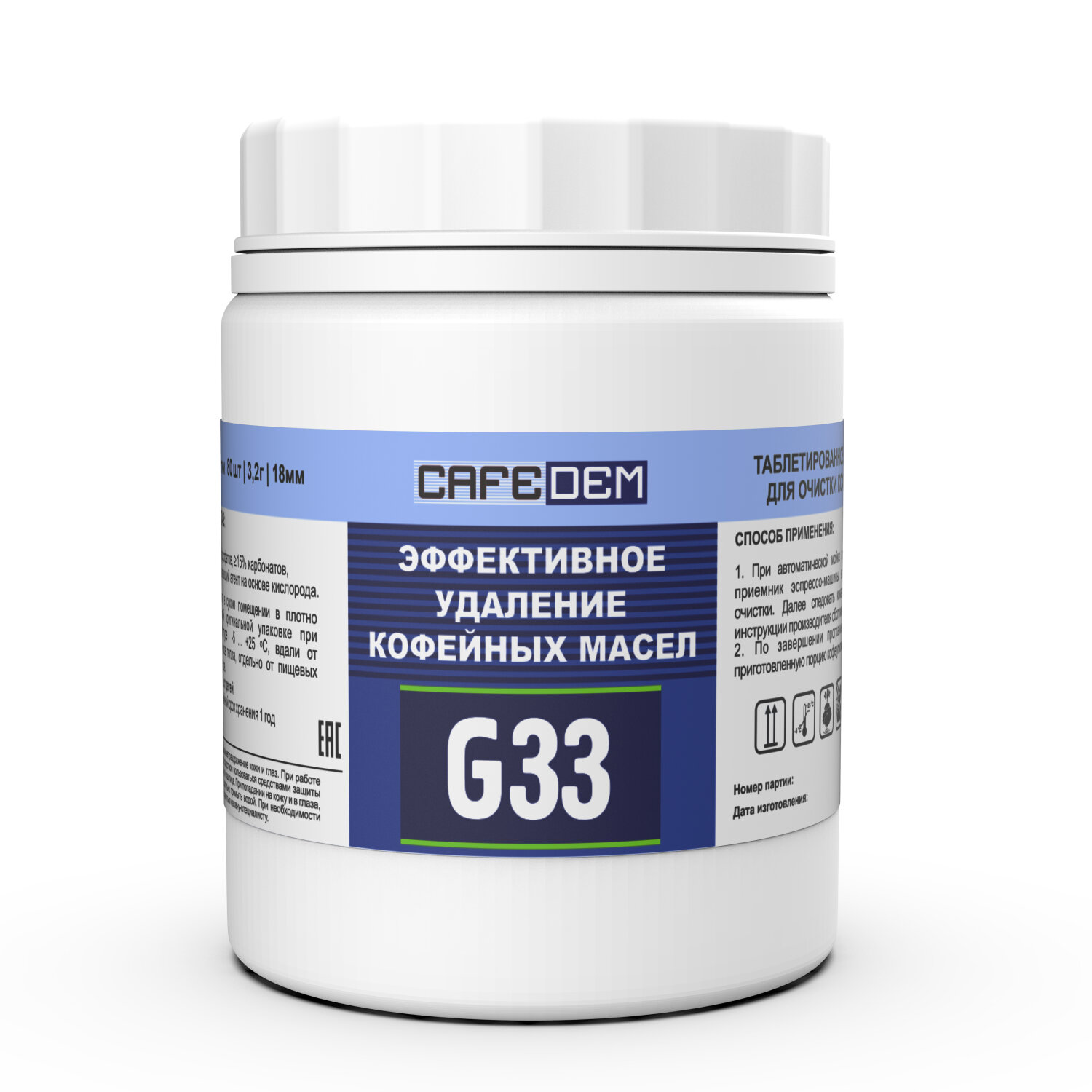 Таблетки для очистки кофемашин всех типов от кофейных масел CAFEDEM G33, 80 шт., 30784 Код товара: 456890 1 526,95 ₽ Купить Производитель:CAFEDEM Таблетированное щелочное моющее средство CAFEDEM G33 предназначено для мойки автоматических кофемашин и различных дозирующих аппаратов. Средство обладает хорошими моющими и обезжиривающими свойствами. Высокоэффективная формула таблеток CAFEDEM с активным кислородом позволяет удалять труднорастворимые загрязнения (остатки кофе, кофейных и эфирных масел, воска и танинов), оседающие на внутренних поверхностях блока заваривания кофеварок и кофемашин. Таблетки продлевают срок службы аппарата, препятствуют возникновению поломок, в том числе из-за засоров фильтра. Средство подходит для кофемашин марок FAEMA (X20 и X30), SAECO, JURA, FRANKE, BOSCH, DELONGHI, KAFFIT, KRUPS, MELITTA и других. Ограничения по материалам: алюминиевые поверхности обрабатывать с осторожностью. Комплектация: 1 пластиковая банка с закручивающейся крышкой и защитной мембраной содержит 80 таблеток, каждая весом 3,2 г, диаметром 18 мм и толщиной 7 мм. Производитель оставляет за собой право изменять характеристики товара, его внешний вид и комплектность без предварительного уведомления продавца.Производство: РоссияНазначение: удаление кофейных маселПрименение для: кофемашиныДействие: очисткаФорма: таблеткиКонцентрат: даОбъем/Вес: 256 мл/гРазрешено для детских учреждений: даОбласть применения: бытовое использование, государственные учреждения, пищевая промышленность, предприятия общественного питания, производственные компании, санаторно-курортные учреждения, сфера услуг, торговые учрежденияСерия: G33Упаковка: банкаСрок годности: 36 месРазмер упаковки: 7 × 9 × 7 смОбъём: 0.0006 м3Промежуточная упаковка: 6 штТранспортная упаковка: 6 штШтрих-код: 4603739230784 Сертификат-1.jpg Сертификат-2.jpg