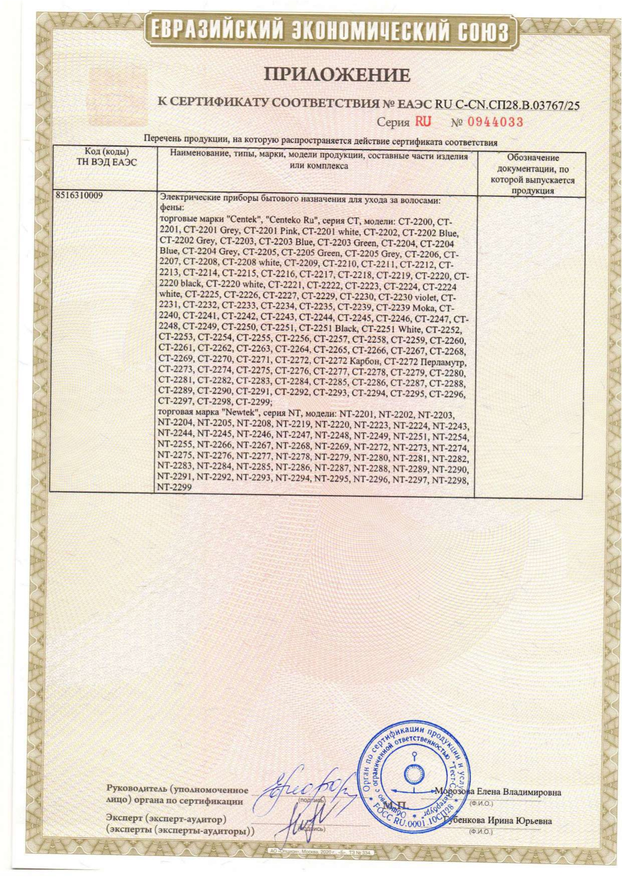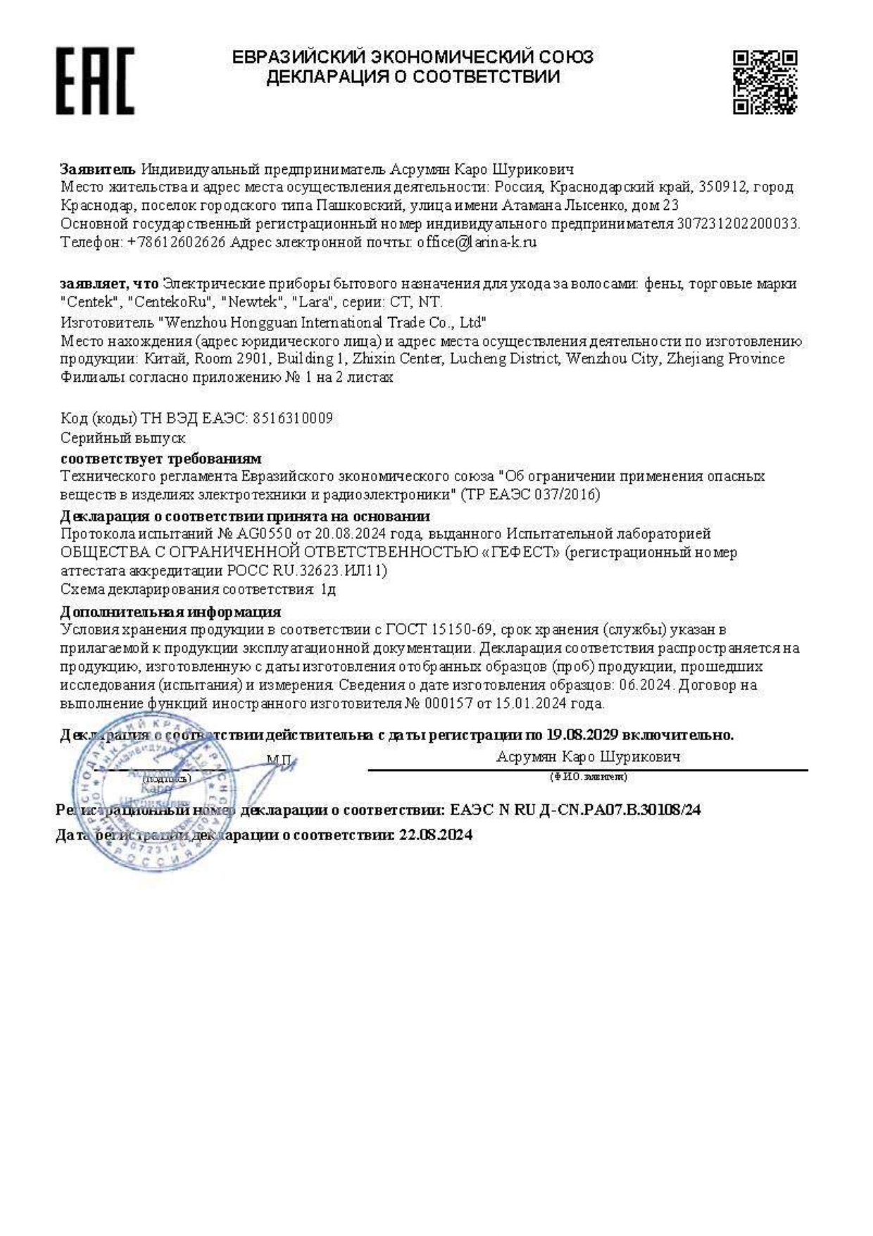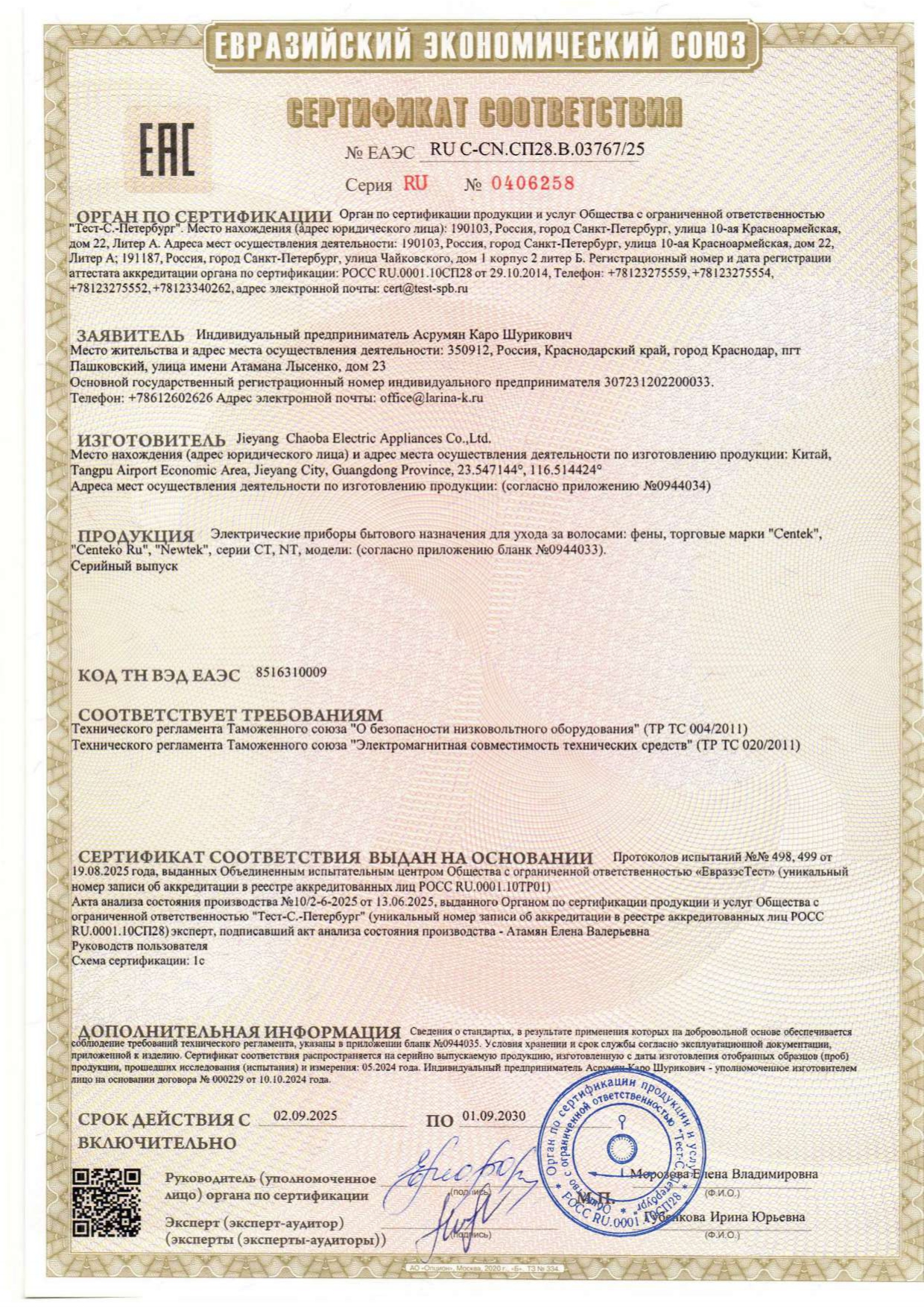 Фен CENTEK CT-2242, 2000 Вт, 2 скорости, 3 температурных режима, черный/розовый Код товара: 457620 1 916,78 ₽ Купить Производитель:CENTEK Фен CENTEK CT-2242 – это удобный и стильный прибор для ухода за вашими волосами. Обладая мощностью в 2000 Вт, фен обеспечивает быстрое и эффективное высушивание волос без повреждения их структуры. Фен CENTEK CT-2242 — это стильный и функциональный помощник для создания идеальной укладки. С мощностью 2000 Вт он быстро и бережно высушивает волосы любой длины, а два режима интенсивности подачи воздуха и три режима нагрева позволяют легко подобрать оптимальные настройки для любого типа волос. Режим фиксируемого холодного обдува закрепляет укладку, придавая ей долговечность и блеск. Корпус из термостойкого пластика с покрытием Soft Touch не только выглядит элегантно, но и приятен на ощупь, обеспечивая комфортное использование. Фен оснащен петлей для подвешивания, что делает его хранение удобным, а в комплекте идут две насадки: диффузор для создания прикорневого объема и концентратор для точной укладки отдельных прядей. Эти аксессуары помогут вам экспериментировать с образами и добиваться профессионального результата в домашних условиях. Производитель оставляет за собой право без предварительного уведомления вносить изменения в технические характеристики, комплектацию и конструкцию, не ухудшающие эксплуатационные характеристики изделия.Производство: КитайТип фена: бытовойМощность: 2000 ВтРегулировка возд. потока (кол-во скоростей): 2Регулировка температуры (кол-во режимов): 3Серия: CT-2242Количество насадок: 1 шт.Концентратор: даФункция ''холодный воздух'': даОтключение при перегреве: даПрорезиненное покрытие корпуса: даПрорезиненная ручка: даПетелька для хранения: даДлина сетевого шнура: 1.8 мМатериал корпуса: пластикЦвет корпуса: черный/розовыйВес: 650 гДизайн: CT-2242Размер упаковки: 9.8 × 28.7 × 24.3 смОбъём: 0.0078 м3Промежуточная упаковка: 10 штТранспортная упаковка: 10 штШтрих-код: 4680353006087 Файлы Приложение-1.pdf Сертификат-1.jpg Сертификат-2.jpg Сертификат-3.jpg Сертификат-4.jpg Сертификат-5.jpg Сертификат-6.jpg Сертификат-7.jpg Сертификат-8.jpg Сертификат-9.jpg