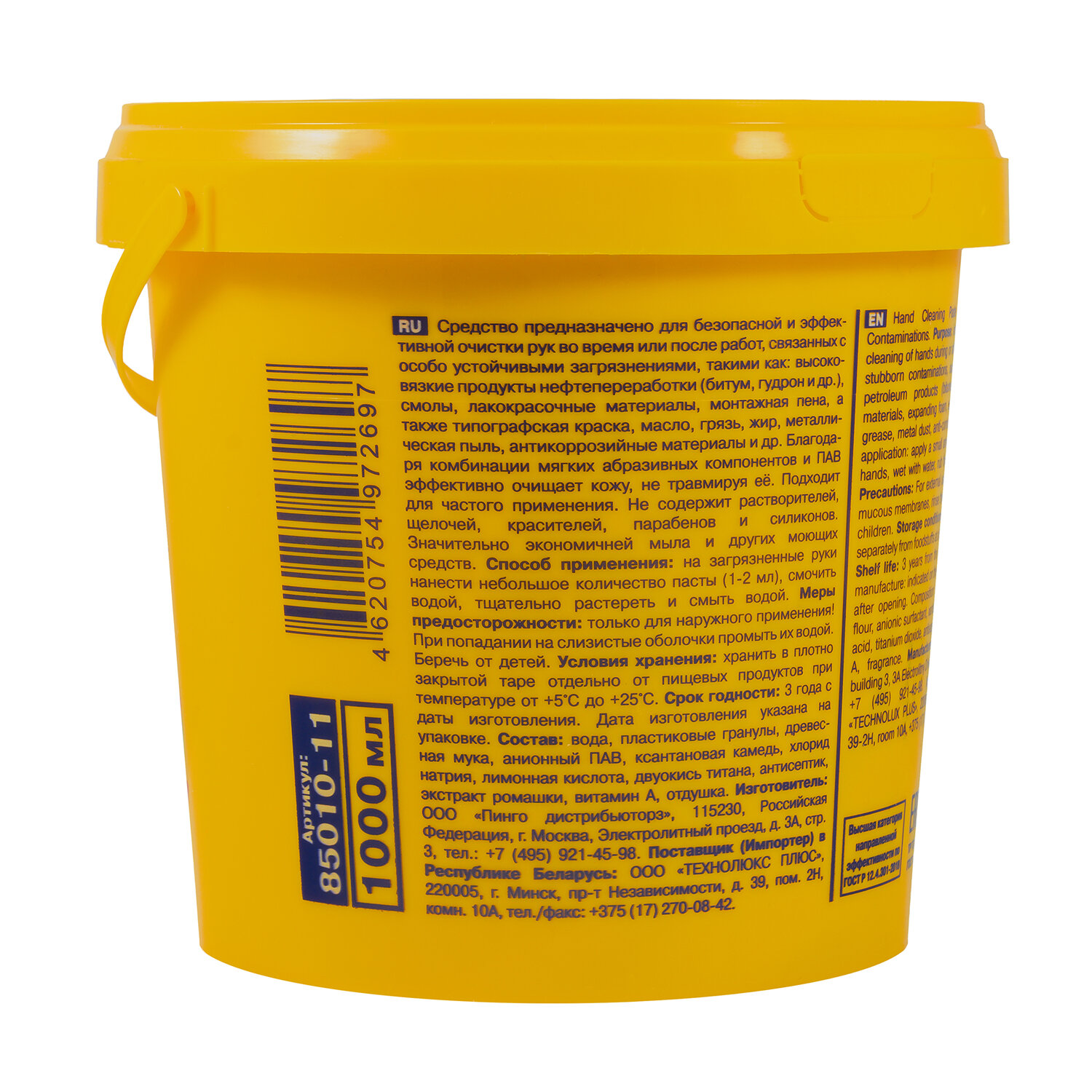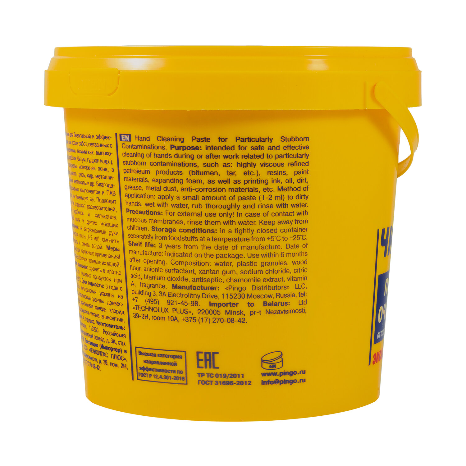 Паста очищающая средство для рук, 1000 мл, PINGO (Пинго), ЧИСТАЯ ЗВЕЗДА, от самых стойких загрязнений, банка Код товара: 700892 245,35 ₽ Купить Производитель:ЧИСТАЯ ЗВЕЗДА Паста ЧИСТАЯ ЗВЕЗДА – нейтральное средство для эффективной очистки кожи рук от масла, смазок, монтажной пены, типографской краски, графита, плиточного клея, битума, сажи, антикоррозийных материалов, производственной пыли, грязи и других загрязнений. Поверхностно-активные вещества, содержащиеся в пасте, эффективно расщепляют масложировые загрязнения, превосходя по действию обычное мыло. При этом паста не раздражает кожу и содержит увлажняющие компоненты. Паста экологически безопасна и не содержит неразлагаемых компонентов. Абразивные гранулы размером 0,03–0,1 мм легко смываются с рук, не засоряя канализацию. Средство обладает антисептическим действием и не вызывает аллергических реакций. Применение: смочите руки водой, возьмите 2–3 г пасты (шарик диаметром примерно 2 см) и с легким усилием разотрите по поверхности рук до устранения загрязнений, затем смойте под струей воды. Грязь эффективно удаляется даже после однократного применения пасты. Состав: поверхностно-активные вещества, консерванты, абразивные биологически разлагаемые гранулы, отдушка. Плотность при 20 °C - 0,88 г/мл. Значение pH - 6,5.Производство: РоссияФорма выпуска: пастаОбъем: 1000 млТип ДСИЗ: очищениеНазначение: для рук, универсальныйВид средства: очищающееВид абразива: искусственныйЭффект от использования: очищениеНаличие абразивных частиц: даpH: 7Соответствует требованиям стандарта: ГОСТ 31696-2012, ТР ТС 019/2011Тип крышки: крышкаУпаковка: контейнерСрок годности: 36 месВес: 705 грРазмер упаковки: 12.5 × 13.3 × 13.3 смОбъём: 0.0025 м3Промежуточная упаковка: 12 штТранспортная упаковка: 12 штШтрих-код: 4620754972697 Сертификат-1.jpg Сертификат-2.jpg Сертификат-3.jpg