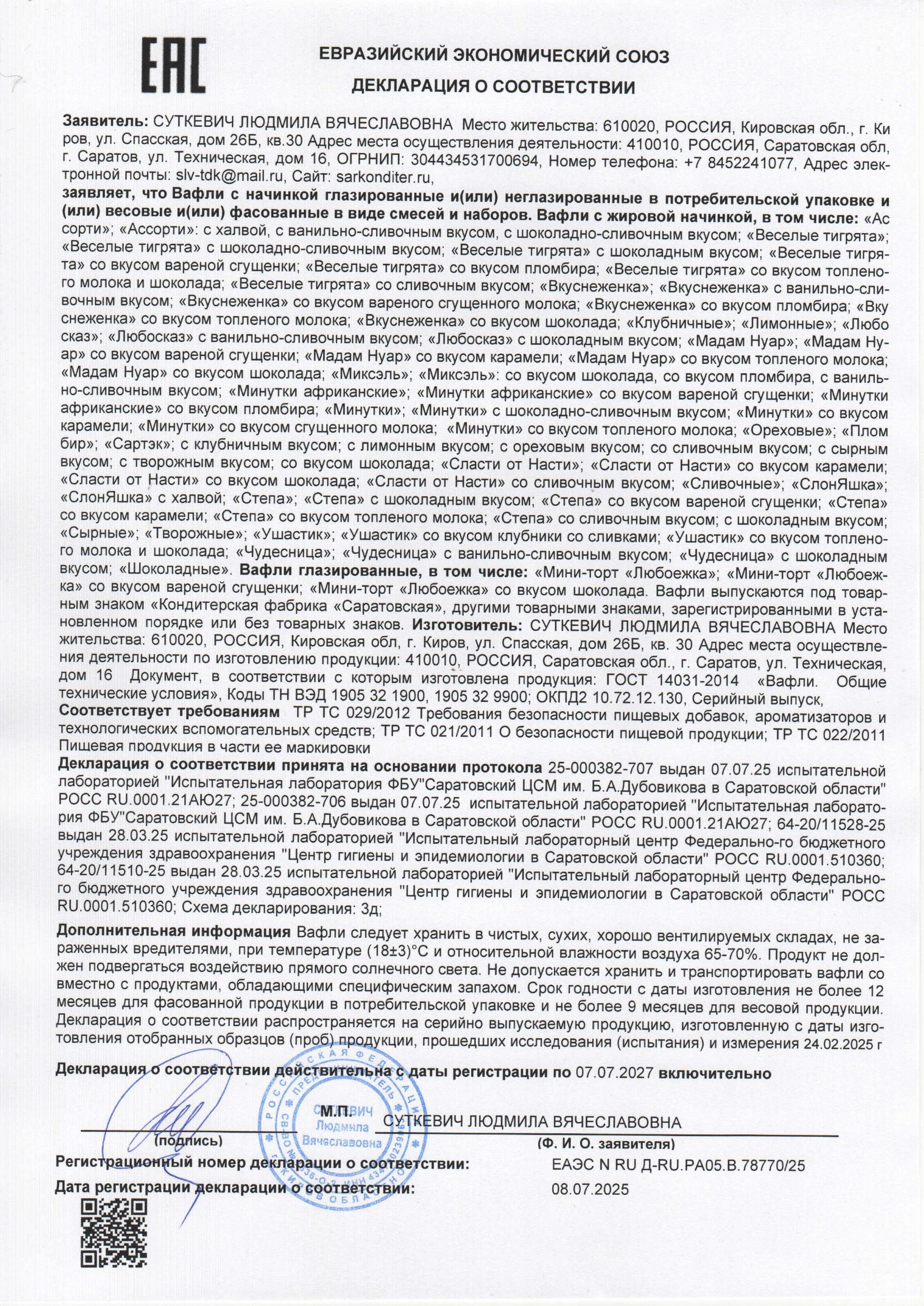 Состав: вафельный лист (мука пшеничная общего назначения М 55-23, вода питьевая, краситель сахарный колер Е 150d, яичный порошок, эмульгатор лецитин Е 322, масло подсолнечное рафинированное дезодорированное, соль поваренная пищевая, разрыхлитель гидрокарбонат натрия Е500ii), сахар, жир кондитерский (рафинированные дезодорированные масла: пальмовое, подсолнечное, антиокислители Е 300, Е 307), масло кокосовое, масло подсолнечное рафинированное дезодорированное, масло пальмовое (масло пальмовое рафинированное дезодорированное отбеленное, антиокислители Е320, Е321), сыворотка молочная сухая, эмульгатор лецитин Е 322, масло какао, какао тертое, какао-порошок, ароматизаторы ("Сгущенное молоко", "Вареное сгущенное молоко", "Фундук", "Ванилин").