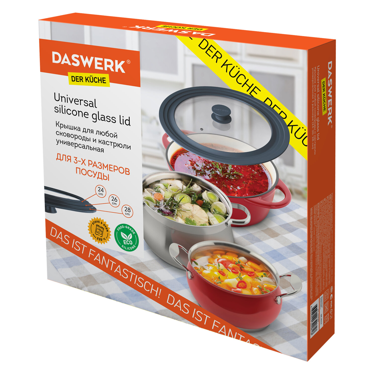 Крышка для любой сковороды и кастрюли универсальная 3 размера (24-26-28 см) антрацит, DASWERK (ДАСВЕРК) Код товара: 607589 620,21 ₽ Купить Производитель:DASWERK Универсальная крышка DASWERK, выполненная из силикона и стекла, позволит сэкономить не только время, но и пространство на кухне: одну крышку можно использовать для посуды разных размеров: 24 см, 26 см и 28 см в диаметре. Крышка DASWERK изготовлена из термостойкого стекла, что позволяет контролировать процесс приготовления без потери тепла. Ободок из экологичного жаропрочного силикона выдерживает температуру до 220 °С. Преимущества: - не выделяет вредных веществ; - легко моется и не впитывает запахи; - можно использовать крышку для приготовления в духовке; - силиконовые части крышки надежно защищают стекло при падении. Больше не нужно хранить гору стеклянных крышек разного размера, универсальная крышка DASWERK существенно сэкономит место на кухне.Производство: КитайДиаметр: 24-26-28 смНазначение для: воки, жаровни, кастрюли, ковши, сковороды, сотейникиСерия: KucheМатериал: стекло, силиконЦвет: антрацитовыйВес: 872 грРазмер упаковки: 6 × 29.9 × 30.6 смОбъём: 0.0066 м3Промежуточная упаковка: 8 штТранспортная упаковка: 8 штШтрих-код: 4606224320618 Сертификат-1.jpg Сертификат-2.jpg Сертификат-3.jpg