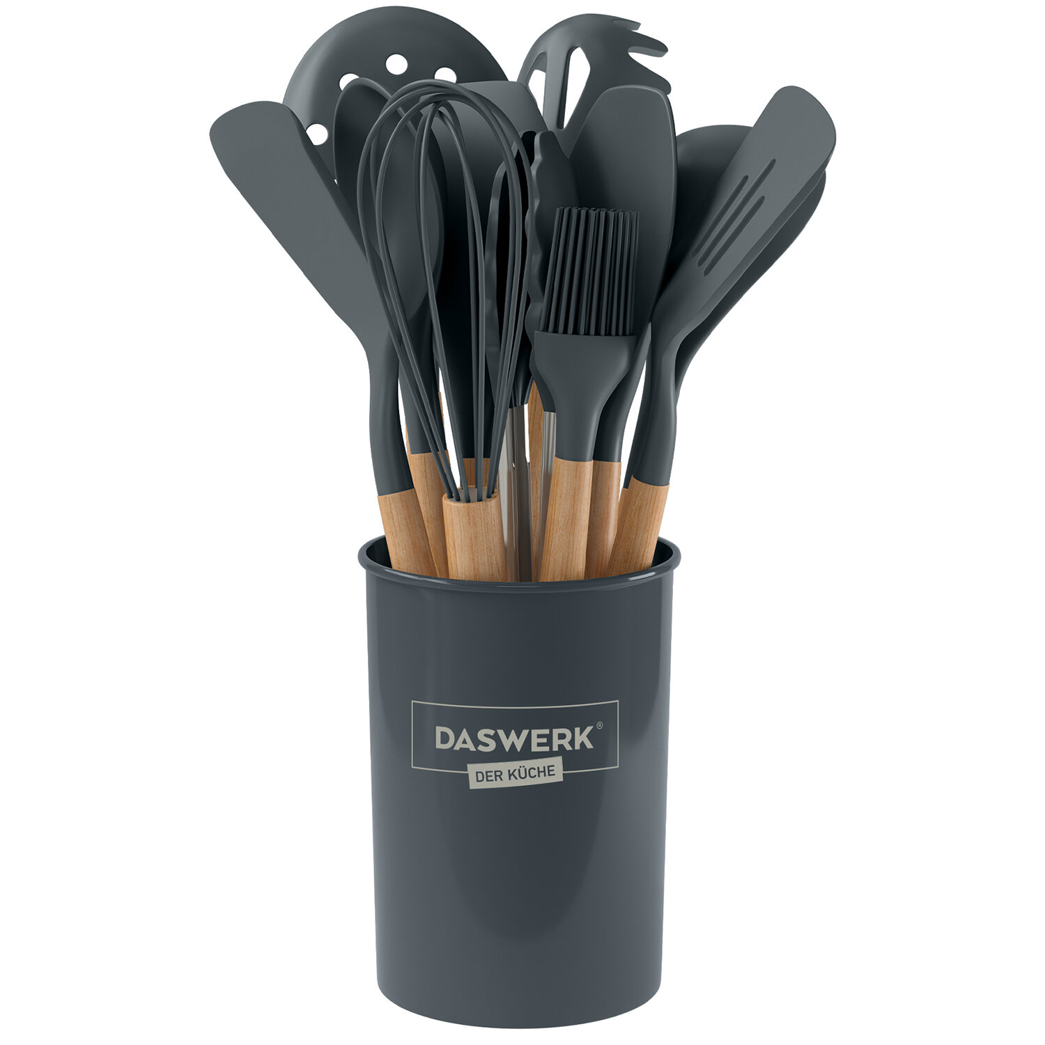Набор силиконовых кухонных принадлежностей с деревянными ручками 12 в 1, серый, DASWERK (ДАСВЕРК) Код товара: 608194 1 126,95 ₽ Купить Производитель:DASWERK Стильный и функциональный набор силиконовых кухонных принадлежностей DASWERK с подставкой. Станет незаменимым помощником для всех, кто умеет и любит готовить. В набор входят 11 самых необходимых аксессуаров для кухни и подставка: • удобная лопатка для жарки (длина – 32 см), • шпатель (длина – 32 см), • венчик (длина – 25 см), • щипцы (длина – 23 см), • плоская ложка для выпечки (длина – 32 см), • лопатка с отверстиями для слива масла (длина – 32 см), • половник (длина – 32 см), • ложка для салата (длина – 32 см), • кисточка для масла (длина – 26,8 см), • ложка для спагетти (длина – 32 см), • шумовка (длина – 33,5 см), • подставка из пластика. Рабочая часть кухонных принадлежностей изготовлена из пищевого силикона, а ручки – из дерева (бук). Силикон с антипригарным покрытием выдерживает высокие температурные нагрузки, не впитывает запахи, легко моется и полностью безопасен для здоровья. Меры предосторожности: чтобы не повредить лаковое покрытие, кухонные принадлежности не рекомендуется мыть в посудомоечной машине. Для устранения заводского запаха перед первым использованием набор необходимо хорошо промыть с моющим средством. Кисточка для масла имеет съемную ручку. С набором кухонных принадлежностей DASWERK готовить легко и приятно!Производство: КитайКоличество в комплекте предметов: 12 шт.Особенности: нескользящая рукояткаСостав набора: лопатка для жарки, шпатель, венчик, щипцы, плоская ложка для выпечки, лопатка с отверстиями для слива масла, половник, ложка для салата, кисточка для масла, ложка для спагетти и шумовкаМатериал: силиконМатериал ручки: букЦвет: темно-серыйСерия: DER KUCHEНазначение: для приготовления пищиВес: 1,2 кгРазмер упаковки: 12.8 × 33.7 × 12.8 смОбъём: 0.0065 м3Промежуточная упаковка: 16 штТранспортная упаковка: 16 штШтрих-код: 4606224371993 Сертификат-1.jpg Сертификат-2.jpg Сертификат-3.jpg