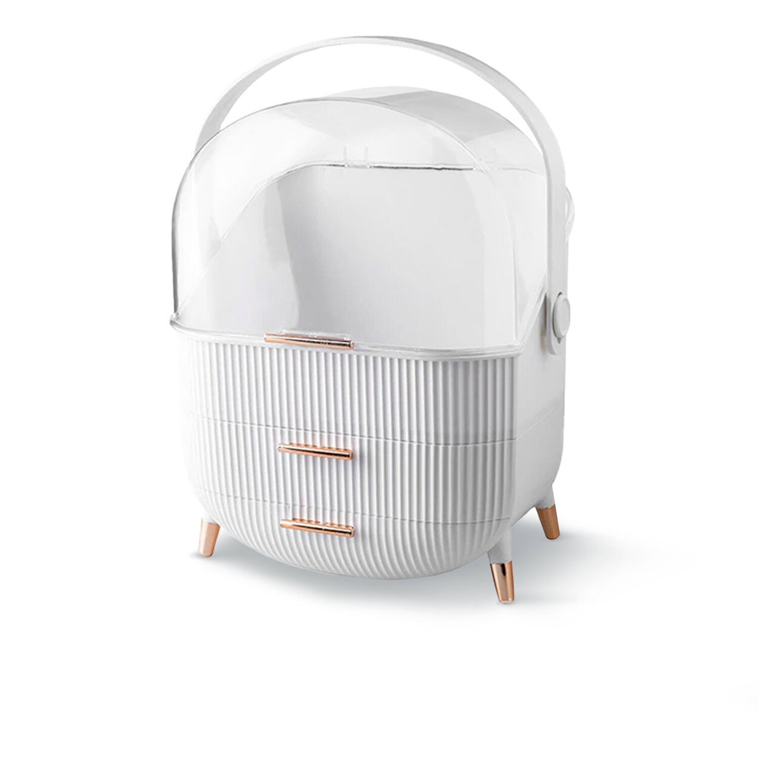 Стильный органайзер оснащен двумя выдвижными ящиками и откидной прозрачной крышкой, которая позволит уберечь средства личной гигиены от попадания на них пыли и влаги, что позволяет его хранить не только в спальне на туалетном столике или комоде, а также и в ванной комнате.