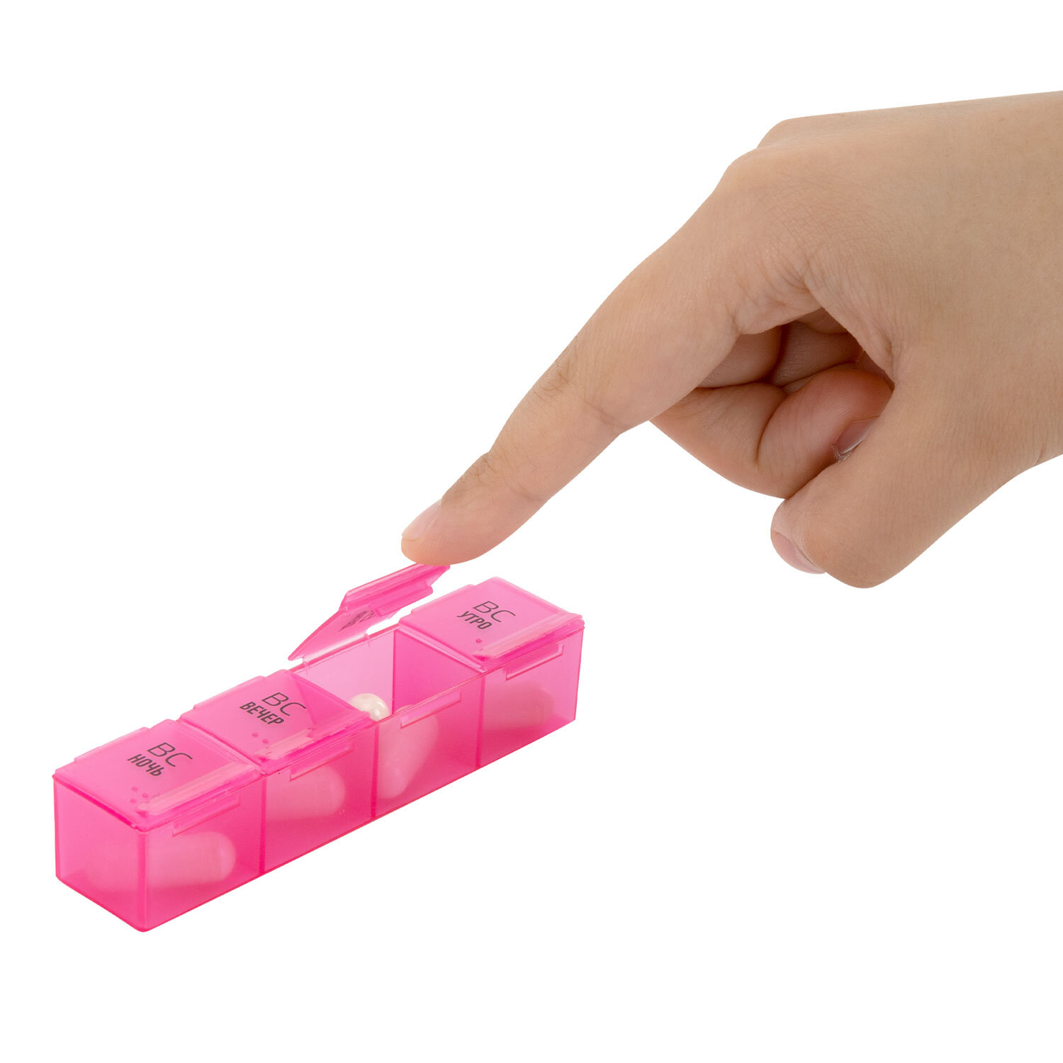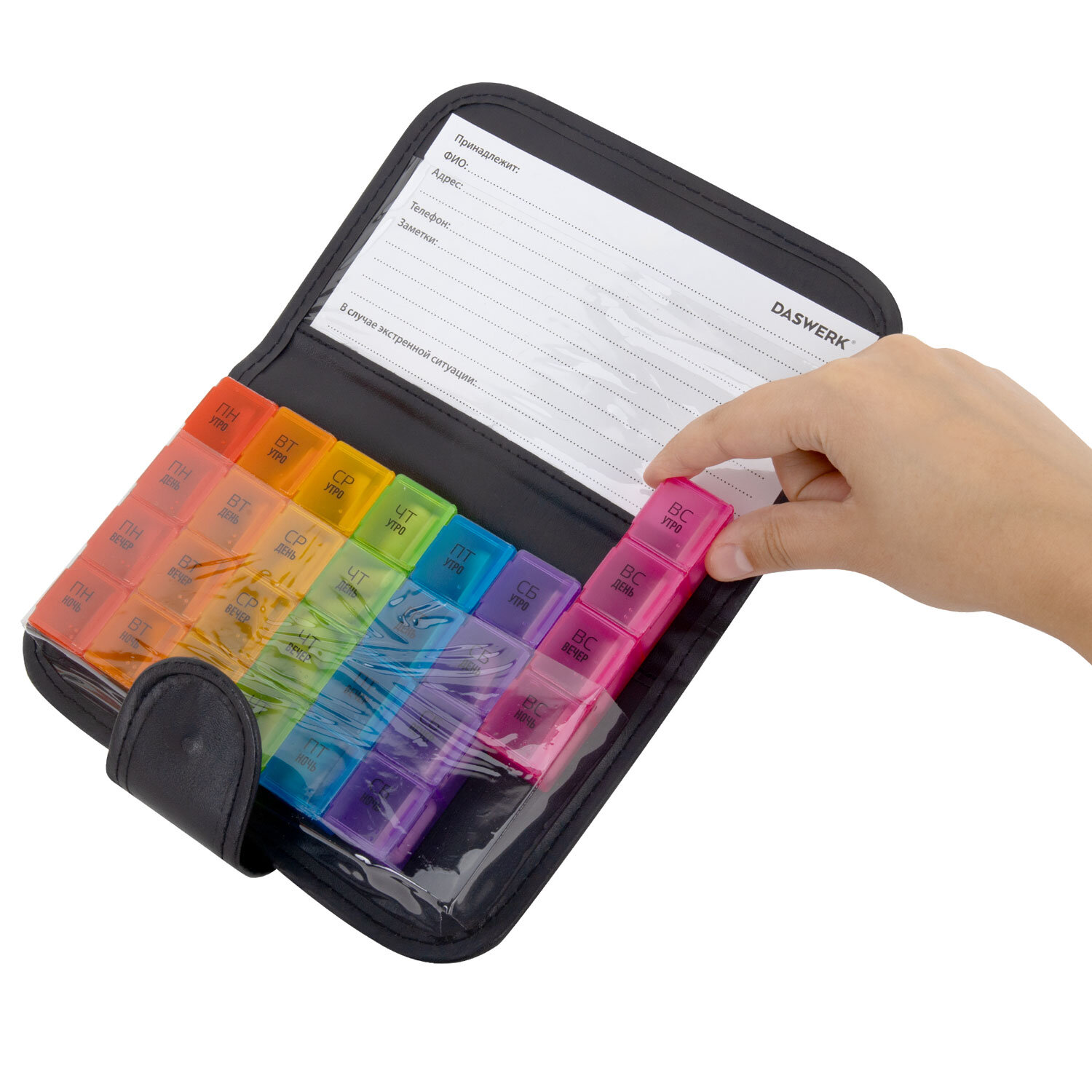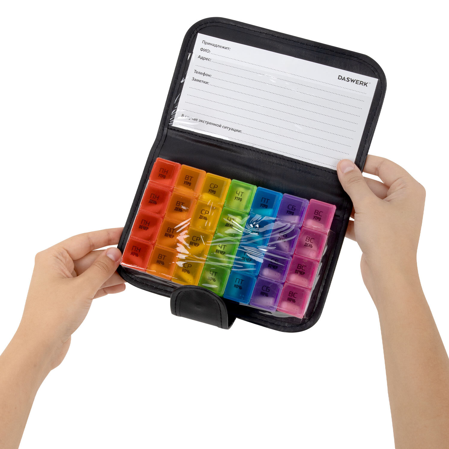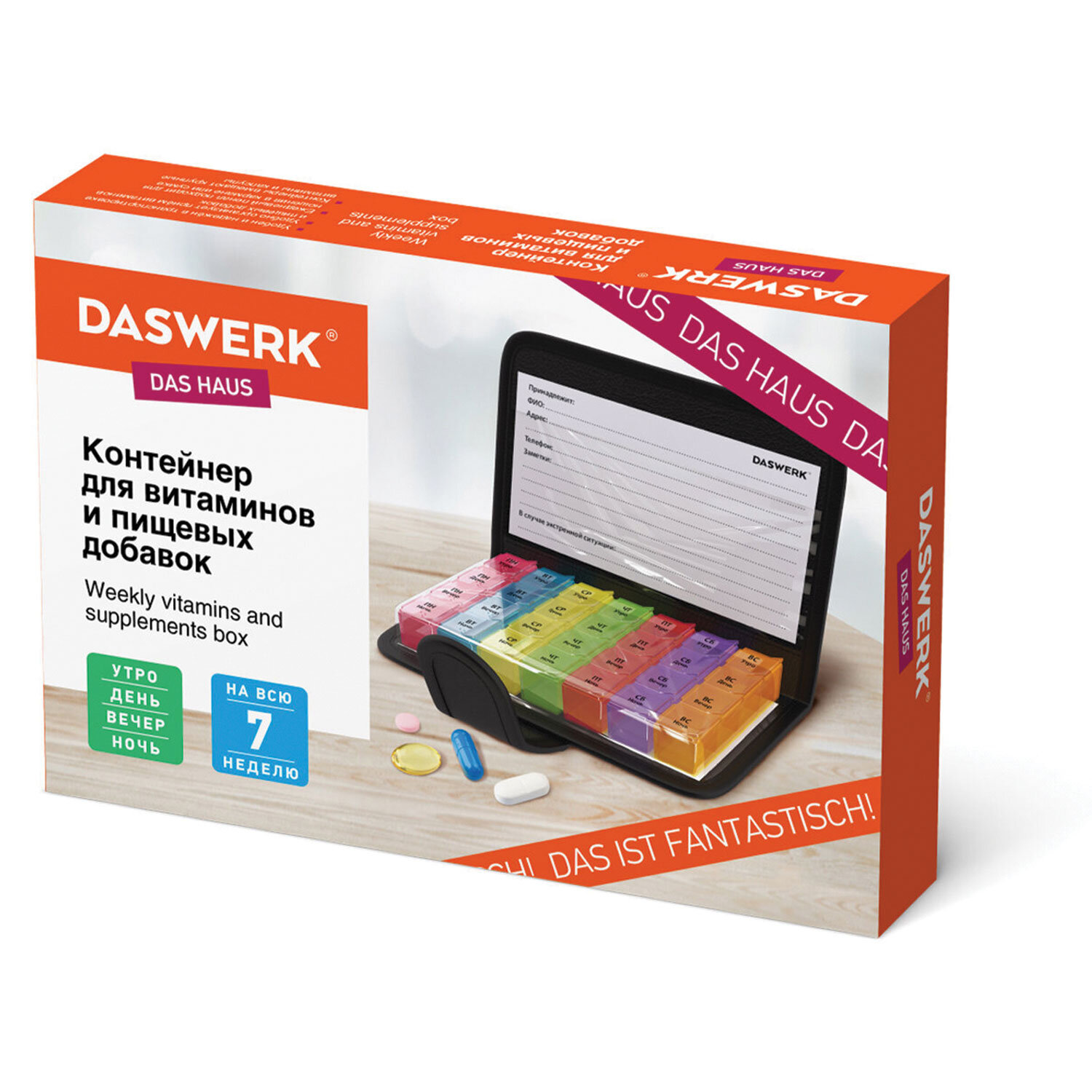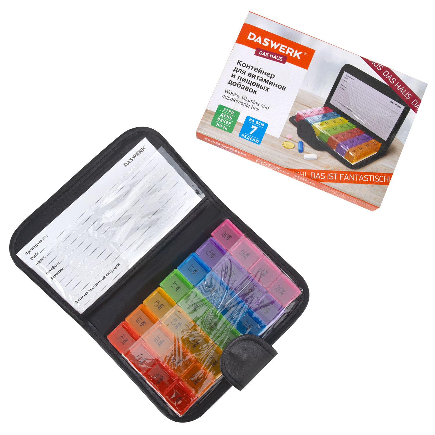 ТАБЛЕТНИЦА / Контейнер-органайзер для лекарств и витаминов, 7 дней/4 приема в чехле на кнопке, DASWERK (ДАСВЕРК) Код товара: 630842 401,21 ₽ Купить Производитель:DASWERK Таблетница DASWERK предназначена для надежного хранения лекарств, витаминов и пищевых добавок. Контейнер из легкого и прочного пластика, а также удобный чехол на кнопке, гарантируют удобство и безопасность в использовании. Таблетница представляет собой 7 съемных ежедневных контейнеров, каждый из которых разделен на 4 отделения: утро, день, вечер, ночь. Это позволяет носить с собой как всю таблетницу в удобном и стильном чехле с застежкой, так и отдельные, более компактные, контейнеры на один день. Дома, на работе, в путешествии - упорядоченный прием лекарств и витаминов станет проще с таблетницей-органайзером. Контейнер содержит маркировку на русском языке, нанесенную при помощи специальной УФ печати. Надписи не сотрутся от длительного и частого использования. Каждому из дней недели соответствует разный цвет. Чехол, выполненный из черной искусственной кожи, надежно закрывается на кнопку-застежку. Каждый из мини-контейнеров также плотно закрывается крышкой, предотвращая рассыпание содержимого. Перед первым использованием рекомендуется промыть контейнеры теплой водой с мылом и тщательно высушить.Производство: КитайКоличество дней: 7Количество ячеек: 28 шт.Окно для маркировки: даДлина: 195 ммШирина: 120 ммВысота: 30 ммСерия: DAS HAUSМатериал: пластик, искусственная кожаВес: 236 грРазмер упаковки: 3.8 × 19.9 × 13.9 смОбъём: 0.0013 м3Промежуточная упаковка: 50 штТранспортная упаковка: 50 штШтрих-код: 4606224332260 Сертификат-1.jpg Сертификат-2.jpg Сертификат-3.jpg