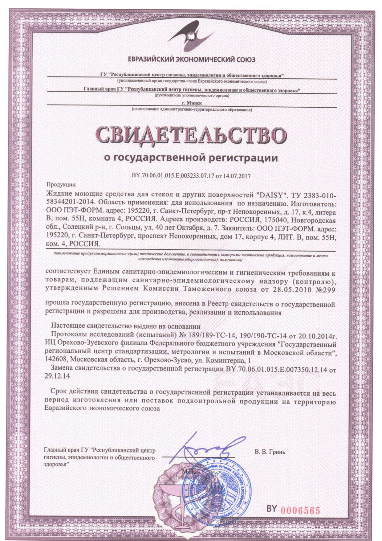 Средство для мытья стекол и зеркал 500 мл DAYSI (Дэйзи), распылитель Код товара: 608110 66,51 ₽ Купить Производитель:DAISY Средство для стекол и других поверхностей DAISY эффективно очищает от пыли, грязи, жира, не оставляет следов и разводов. Идеально подходит для окон, зеркал, автомобильных стекол, кафеля, панелей бытовых электроприборов и других поверхностей. Состав: более 30% вода очищенная, менее 5% бутиловый эфир пропиленгликоля, менее 5% АПАВ, менее 5% цитрат натрия, менее 5% ароматизатор, менее 5% краситель, менее 5% консервант. Допускается замерзание жидкости после оттаивания при температуре не выше +15°С, средство восстанавливает внешний вид и цвет. ТУ 2383-010-58344201-2014 Это товар эконом-сегмента, поэтому он отличается привлекательной ценой. Товар обладает базовым набором характеристик и простой упаковкой, при этом полностью соответствует основным требованиям потребителей.Производство: РоссияОбъем: 500 млСерия: Нет данныхНаличие распылителя: даОбрабатываемая поверхность: зеркало, кафель, стеклоЭффект от использования: защищает от пыли, не оставляет разводовОтдушка: нет отдушкиТовар относится к сегменту ЭКОНОМ: даСрок годности: 36 месВес: 525 грРазмер упаковки: 23.4 × 10 × 6 смОбъём: 0.0013 м3Промежуточная упаковка: 10 штТранспортная упаковка: 10 штШтрих-код: 4607933330080 Файлы Приложение-1.pdf Приложение-2.pdf Сертификат-1.jpg Сертификат-2.jpg Сертификат-3.jpg Сертификат-4.jpg Сертификат-5.jpg Сертификат-6.jpg Сертификат-7.jpg Сертификат-8.jpg Сертификат-9.jpg Сертификат-10.jpg Сертификат-11.jpg Сертификат-12.jpg Сертификат-13.jpg Сертификат-14.jpg Сертификат-15.jpg Сертификат-16.jpg Сертификат-17.jpg Сертификат-18.jpg Сертификат-19.jpg Сертификат-20.jpg Сертификат-21.jpg Сертификат-22.jpg Сертификат-23.jpg Сертификат-24.jpg Сертификат-25.jpg