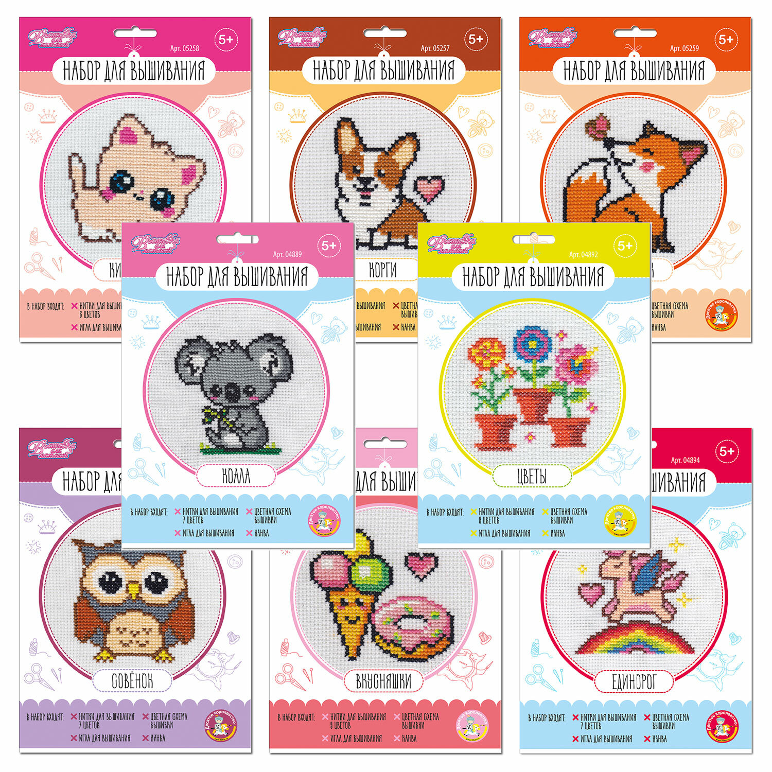Набор для вышивания, конверт, АССОРТИ, 10КОР Код товара: 666326 111,45 ₽ Купить Производитель:ДЕСЯТОЕ КОРОЛЕВСТВО Набор для вышивания станет прекрасным подарком для вашего ребенка. С помощью можно вышить замечательную картинку, которая украсит любой интерьер. Состав набора: • игла пластиковая – 1 шт. • белая канва – 1 шт. (26 х 26 см) • нитки мулине • цветная схема вышивки – 1 шт. Размер готовой вышивки – 10х10 см В транспортной упаковке содержится несколько дизайнов без возможности выбора.Производство: РоссияТип набора: для вышиванияКомплектация: безопасная игла, канва, картинка-основа, ниткиВозраст от: 5 летФорма: Без пялецУпаковка: картонный конвертВес: 49 грРазмер упаковки: 1 × 24 × 17 смОбъём: 0.0003 м3Промежуточная упаковка: 40 штТранспортная упаковка: 40 шт Сертификат-1.jpg Сертификат-2.jpg Сертификат-3.jpg