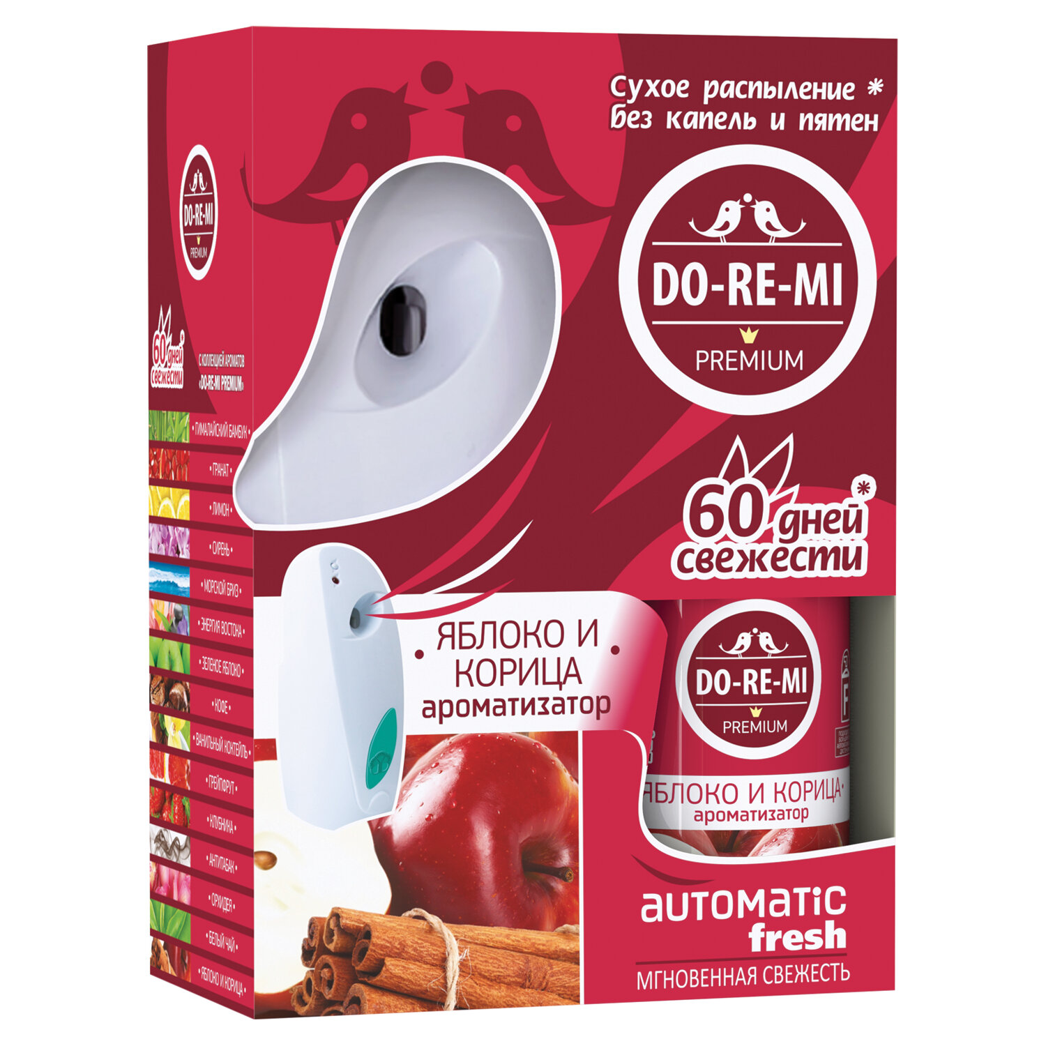 Освежитель воздуха автоматический со сменным баллоном 250 мл, DO-RE-MI "Яблоко и корица", СИБИАР Код товара: 701271 959,01 ₽ Купить Производитель:Do-re-mi Автоматический диспенсер с освежителем воздуха DO-RE-MI "Яблоко и корица" подарит вашему дому комфорт, уют, свежесть яблока и аромат корицы. Автоматический диспенсер + 2 батарейки. Действует до 60 дней при интервале распыления 30 минут. Применять при температуре не ниже +10 °С. Способ применения. • Замена баллона: переведите переключатель в положение OFF, извлеките пустой баллон из устройства согласно инструкции по эксплуатации. Вставьте сменный баллон носиком наружу. Не направляйте в лицо при включении или установке интервала распыления. • Переведите переключатель в положение ON, выбрав желаемый интервал распыления. Первое распыление начнется автоматически через несколько секунд. Универсальный сменный аэрозольный баллон можно использовать без автоматического устройства, как обычный аэрозольный освежитель воздуха. Состав: углеводородный пропеллент (бутан/ пропан/изобутан смесь) не менее 30%, спирт этиловый денатурированный не менее 30%, пропиленгликоль 5-15%, отдушка 5–15%, аллергены: лимонен, линалоол, циннамаль, эвгенол.Производство: РоссияТип товара: аэрозольныйОтдушка: Яблоко и корицаСерия: DO-RE-MIСухое распыление: даОбъем/вес: 250 мл/гСрок годности: 36 месВес: 682 грРазмер упаковки: 8.9 × 21.7 × 15.3 смОбъём: 0.0038 м3Промежуточная упаковка: 4 штТранспортная упаковка: 4 штШтрих-код: 4600171532759 Сертификат-1.jpg Сертификат-2.jpg Сертификат-3.jpg