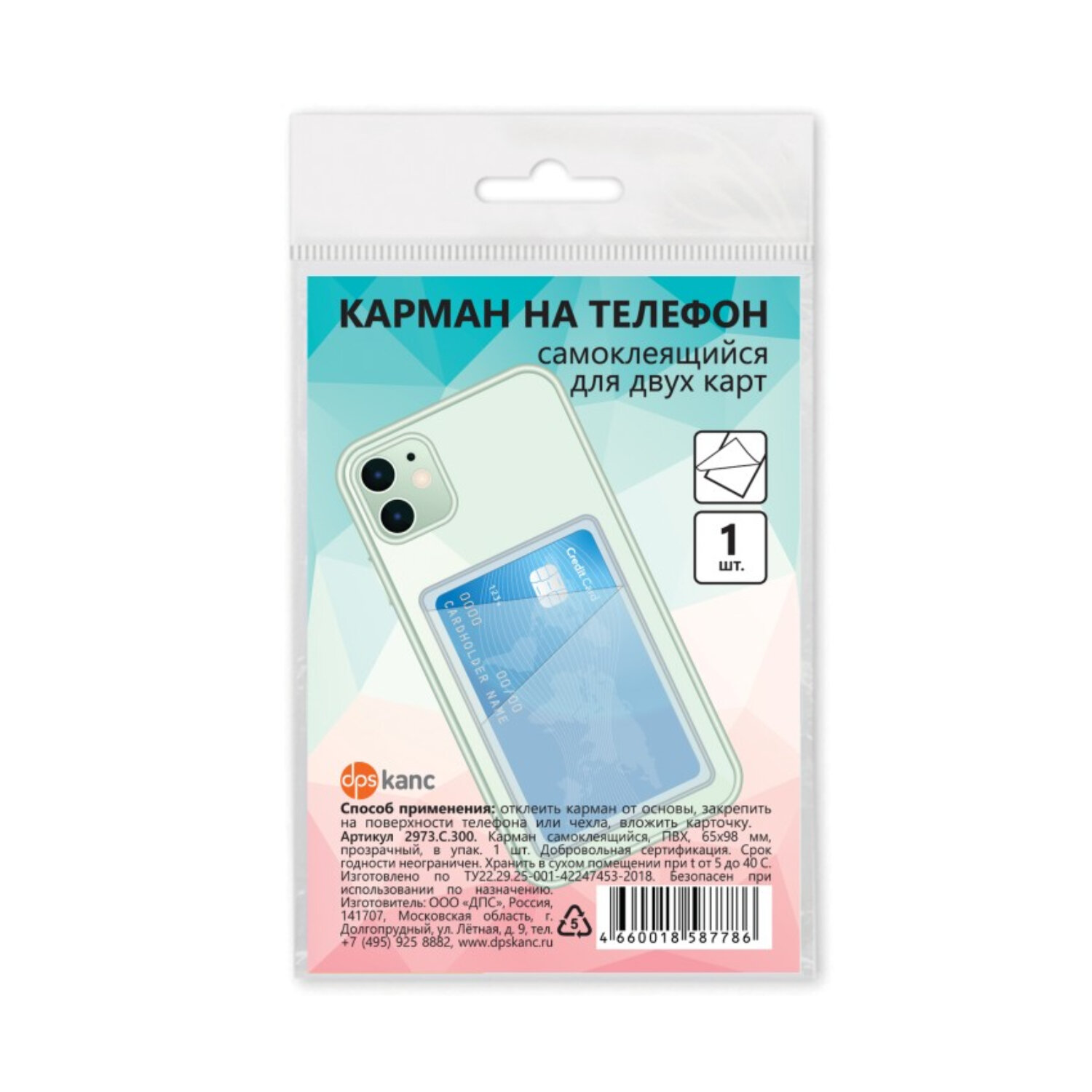 Карман для двух карт/картхолдер на телефон самоклеящийся прозрачный, 65х98 мм, ДПС Код товара: 239047 74,35 ₽ Купить Производитель:ДПС Карман для карт и одновременно картхолдер на телефон самоклеящийся ДПС надежно защитит карты от загрязнений и мелких царапин. Обложка имеет два кармана для карт и клеевую основу на оборотной стороне, которая позволит приклеить картхолдер к корпусу мобильного телефона или на его чехол. Обложка выполнена из плотного ПВХ и имеет размер 65х98 мм.Производство: РоссияВид документа: Проездной билет, карта, пропускТип обложки: мягкаяМатериал: ПВХПоверхность обложки: гладкаяТиснение: нетСерия: нетКоличество карманов: 2 шт.Количество кармашков для пластиковых карт: 2 шт.Длина: 98 ммШирина: 65 ммТолщина: 1 ммЦвет: прозрачныйВес: 11 грРазмер упаковки: 0.2 × 11.1 × 8.5 смПромежуточная упаковка: 10 штТранспортная упаковка: 280 штШтрих-код: 4660018587786 Сертификат-1.jpg Сертификат-2.jpg Сертификат-3.jpg