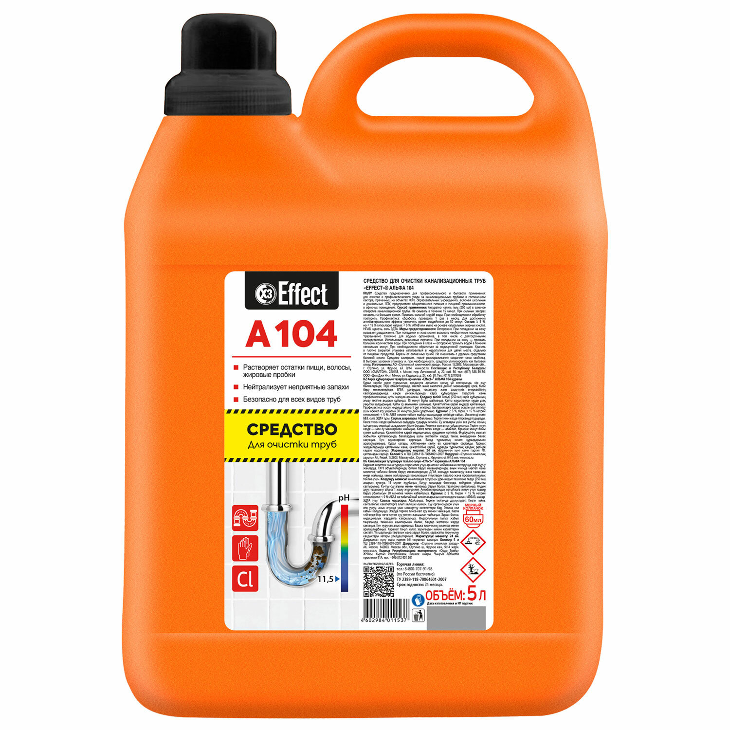 Средство для прочистки канализационных труб 5 л, EFFECT "Alfa 104", содержит хлор 5-15% Код товара: 604211 630,06 ₽ Купить Производитель:EFFECT Предназначено для очистки и профилактического ухода за канализационными трубами. Эффективно растворяет в стоках волосы, остатки пищи, жир и другие загрязнения. Нейтрализует неприятные запахи. Средство безопасно для всех видов труб, в т.ч. пластиковых. Способ применения: Аккуратно налить гель (250 мл) в сливное отверстие канализационной трубы. Не смывать в течение 5-15 мин. При сильных засорах оставить на большее время. Промыть сильной струёй воды. При необходимости обработку повторить. Профилактика: обработку проводить 1 раз в месяц. Дозировка: использовать без разведения. Внешний вид: Прозрачная однородная загущенная жидкость светло-желтого цвета со специфическим запахом; pH (1%-ный р-р) - 11,5; Плотность - 1,090 г/см3. Состав: 5%, но < 15% гипохлорит натрия, < 5%: АПАВ и НПАВ, мыло на основе натуральных жирных кислот, гидроксид натрия, соль ЭДТА. Область применения: для очистки канализационных труб. Средство может быть использовано в гостиницах, ресторанах, офисах, на объектах пищевой промышленности, предприятиях общественного питания, в лечебно-профилактических, санитарно-курортных, детских, дошкольных и других аналогичных учреждениях.Производство: РоссияФорма выпуска: гельОбъем/вес: 5000 мл/гСерия: Нет данныхМатериал труб: универсальныйЭффект от использования: устраняет засоры, устраняет неприятный запахЭффективен в холодной воде: даРазрешено для детских учреждений: даОбласть применения: бытовое использование, государственные учреждения, пищевая промышленность, предприятия общественного питания, санаторно-курортные учреждения, сфера услуг, торговые учреждения, учреждения образования (школьные, дошкольные, средние, высшие)Упаковка: канистраСрок годности: 24 месВес: 5,5 кгРазмер упаковки: 28.4 × 18.3 × 12.9 смОбъём: 0.0089 м3Промежуточная упаковка: 2 штТранспортная упаковка: 2 штШтрих-код: 4602984011537 Файлы Приложение-1.pdf Приложение-2.pdf Сертификат-1.jpg Сертификат-2.jpg Сертификат-3.jpg Сертификат-4.jpg Сертификат-5.jpg Сертификат-6.jpg Сертификат-7.jpg Сертификат-8.jpg Сертификат-9.jpg Сертификат-10.jpg Сертификат-11.jpg Сертификат-12.jpg Сертификат-13.jpg Сертификат-14.jpg Сертификат-15.jpg Сертификат-16.jpg Сертификат-17.jpg Сертификат-18.jpg Сертификат-19.jpg Сертификат-20.jpg Сертификат-21.jpg Сертификат-22.jpg Сертификат-23.jpg Сертификат-24.jpg Сертификат-25.jpg Сертификат-26.jpg