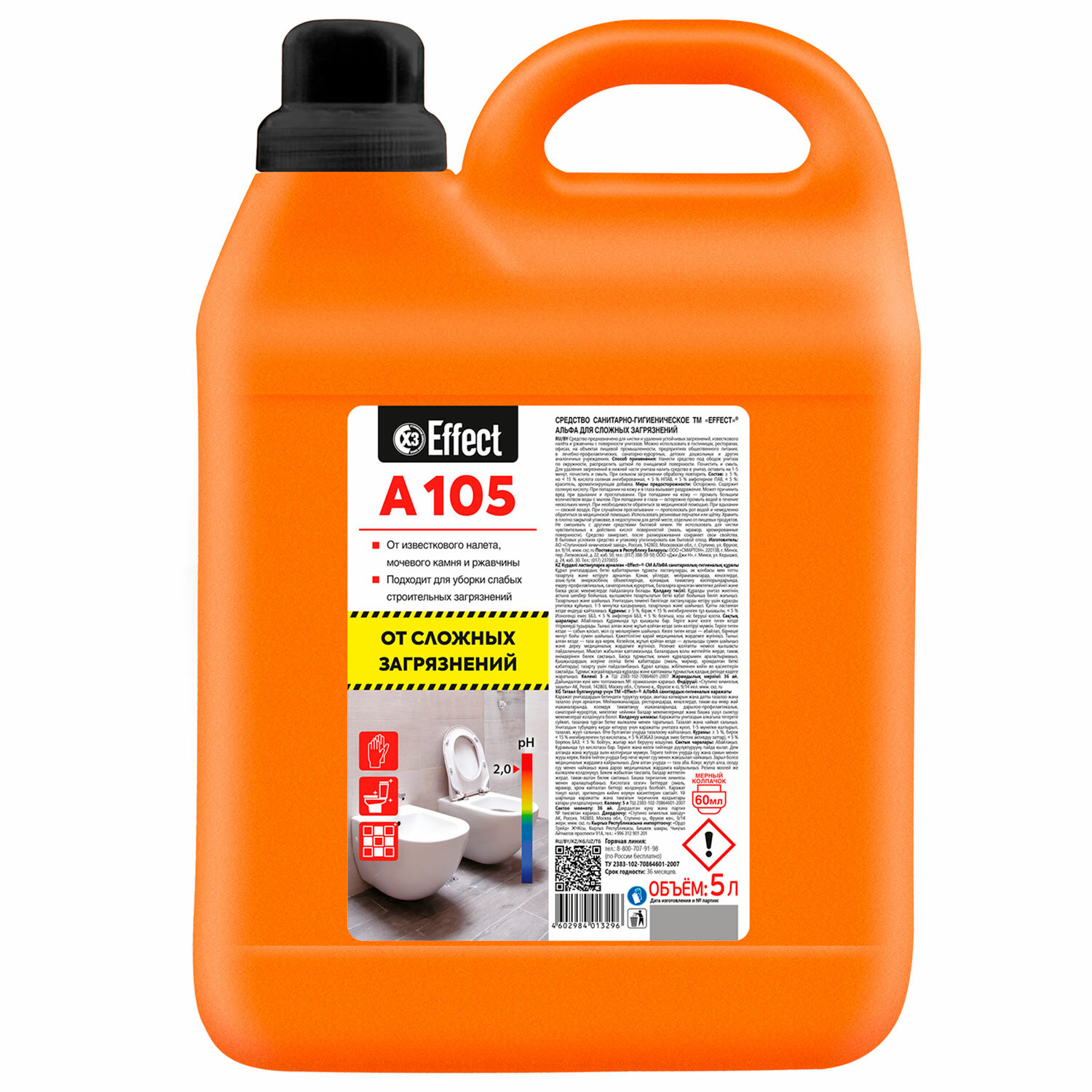 Средство для удаления сложных загрязнений, известкового налета и ржавчины 5 л, EFFECT "Alfa 105" Код товара: 700247 589,45 ₽ Купить Производитель:EFFECT Средство EFFECT "Alfa 105" предназначено для чистки и удаления устойчивых загрязнений, известкового налета, мочевого камня и ржавчины с поверхности унитазов и плитки. Можно использовать в гостиницах, ресторанах, офисах, на объектах пищевой промышленности, предприятиях общественного питания, в лечебно-профилактических, санаторно-курортных, детских, дошкольных и других аналогичных учреждениях. Рекомендации по применению: нанесите средство под ободок унитаза по окружности, распределить щеткой по очищаемой поверхности. Для удаления загрязнений в нижней части унитаза налейте средство в воду и оставьте на 1 минуту, затем смойте. Плотно закрутите колпачок. При сильном загрязнении обработку повторите. Используйте регулярно для поддержания чистоты и свежести туалета. Для ежедневной уборки полов, стен, керамических поверхностей в ванной комнате используйте 0,5-3% раствор. Состав: более 30% вода, более 5%, но менее 15% кислота соляная ингибированная, менее 5% НПАВ, менее 5% амфотерное ПАВ, менее 5%: краситель, ароматизирующая добавка. Значение pH – 2. Меры предосторожности: будьте осторожны! Средство раздражает глаза, органы дыхания и кожу. Следует избегать контакта средства с кожей и глазами. В случае попадания в глаза немедленно промыть их большим количеством воды и обратиться за медицинской помощью. При контакте с кожей немедленно смыть большим количеством мыльного раствора. При вдыхании выйти на свежий воздух. При работе использовать щетку и резиновые перчатки. Не глотать! При случайном проглатывании выпить большое количество воды и немедленно обратиться к врачу. Не применять для чистки чувствительных к действию кислот поверхностей (мрамор, акрил, эмаль). Не смешивать с другими средствами. Условия хранения: хранить в плотно закрытой упаковке, отдельно от пищевых продуктов, в недоступных для детей местах. Средство замерзает, после размораживания сохраняет свои свойства. Срок годности – 24 месяца. По истечении срока годности средство утилизируют как бытовой отход.Производство: РоссияОбъем/Вес: 5000 мл/гСерия: ALFA 105Эффективно удаляет: водный камень, известковый налет, ржавчинуПодходит для: фаянсаФорма выпуска: жидкостьРазрешено для детских учреждений: даОбласть применения: бытовое использование, пищевая промышленность, предприятия общественного питания, санаторно-курортные учреждения, сфера услуг, учреждения образования (школьные, дошкольные, средние, высшие)Содержит: соляную кислотуpH: 2Дозатор: отсутствуетУпаковка: канистраСрок годности: 36 месРазмер упаковки: 28.6 × 18.8 × 13.2 смОбъём: 0.0087 м3Промежуточная упаковка: 2 штТранспортная упаковка: 2 штШтрих-код: 4602984013296 Файлы Сертификат-1.jpg Сертификат-2.jpg Сертификат-3.jpg Сертификат-4.jpg Сертификат-5.jpg Сертификат-6.jpg Сертификат-7.jpg Сертификат-8.jpg Сертификат-9.jpg Сертификат-10.jpg Сертификат-11.jpg Сертификат-12.jpg Сертификат-13.jpg Сертификат-14.jpg Сертификат-15.jpg Сертификат-16.jpg Сертификат-17.jpg Сертификат-18.jpg Сертификат-19.jpg Сертификат-20.jpg Сертификат-21.jpg Сертификат-22.jpg Сертификат-23.jpg Сертификат-24.jpg Сертификат-25.jpg Сертификат-26.jpg Сертификат-27.jpg
