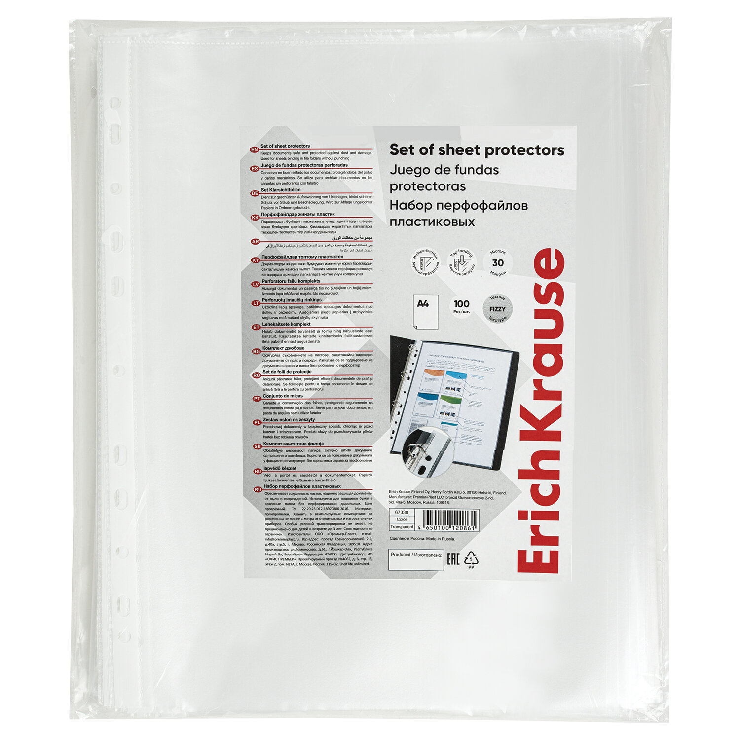 Папки-файлы перфорированные А4 ERICH KRAUSE "Fizzy Clear", КОМПЛЕКТ 100 шт., матовые, 30 мкм Код товара: 272912 289,42 ₽ Купить Производитель:ERICH KRAUSE Перфорированные папки-файлы ERICH KRAUSE обеспечивают сохранность листов, надежно защищая документы от пыли и повреждений. Используется для подшивки бумаг в архивные папки без перфорирования дыроколом. Перфофайлы формата А4 из высококачественного прозрачного пластика. Имеют текстуру поверхности "апельсиновая корка", на которой не видно отпечатков пальцев и мелких царапин. Один перфофайл вмещает до 50 бумажных листов. Размер – 235х305х0,03 мм, толщина – 30 мкм. В пакете – 100 шт.Производство: РоссияФормат: А4Количество в комплекте: 100 шт.Толщина пленки: 30 мкмОриентация: вертикальнаяФактура: "апельсиновая корка"Серия: ClearЦвет: прозрачныйВес: 405 грРазмер упаковки: 1.5 × 31.2 × 26.3 смОбъём: 0.0011 м3Промежуточная упаковка: 14 штТранспортная упаковка: 14 штШтрих-код: 4650100120861 Файлы Сертификат-1.jpg Сертификат-2.jpg Сертификат-3.jpg Сертификат-4.jpg Сертификат-5.jpg Сертификат-6.jpg