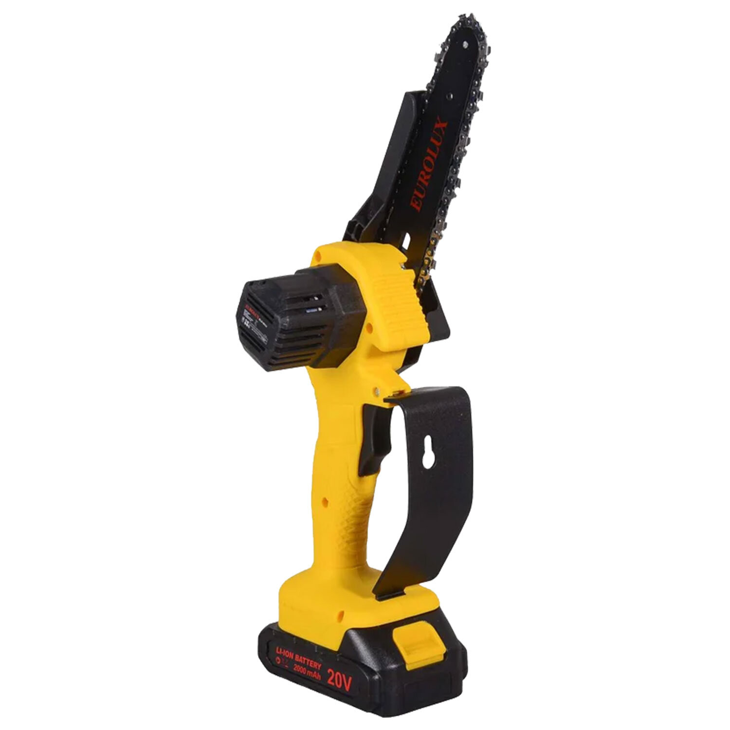 Пила цепная аккумуляторная EUROLUX ELS-20-Li, 20В, 150мм, Li-ion 2 Ач Код товара: 671574 2 382,98 ₽ Купить Производитель:EUROLUX Аккумуляторная цепная пила EUROLUX ELS-20-Li (20 В, шина 150 мм, Li-ion 2 Ач) — мобильный инструмент для дачи и сада. Обрезает ветки, заготавливает дрова, подходит для строительных работ. Лёгкая (3,2 кг), тихая, без выхлопов и проводов! Цепная аккумуляторная пила EUROLUX ELS-20-Li (70/10/56) предназначена для обрезки сучьев, спиливания небольших деревьев, заготовки дров и несложных строительных работ на даче, в саду или на участке. Подходит для частных пользователей и мастеров. Ключевые характеристики: напряжение аккумулятора: 20 В; ёмкость аккумулятора: 2 Ач, Li-Ion; длина шины: 150 мм (6"); шаг цепи: 1/4"; количество звеньев цепи: 36 шт.; скорость пиления: 6 м/с; максимальный диаметр распиливаемого дерева: до 100 мм; вес: 3,2 кг (с аккумулятором); тип тормоза цепи: электронный; система смазки цепи: автоматическая; габариты упаковки: 0,45х0,22х0,20 м. Комплектация: цепная пила; шина; цепь; защитный чехол шины; аккумулятор (20 В / 2 Ач); зарядное устройство; универсальный ключ; инструкция. Преимущества: аккумуляторное питание — мобильность, независимость от электросети; Li-Ion аккумулятор — быстрый заряд, отсутствие «эффекта памяти», стабильная мощность до полного разряда; электронный тормоз цепи — мгновенная остановка для безопасности оператора; автоматическая смазка цепи — продление срока службы инструмента; лёгкий вес (3,2 кг) — удобство при длительной работе и транспортировке; низкий уровень шума — комфорт для пользователя и соседей; экологичность — отсутствие выхлопов, возможность работы в закрытых помещениях; компактный размер — удобство хранения и работы в стеснённых условиях; эргономичная рукоятка с противоскользящим покрытием — надёжный хват и снижение усталости; простота обслуживания — минимум операций для подготовки к работе; гарантия: 1 год. Вся информация на сайте о товарах носит справочный характер и не является публичной офертой в соответствии с пунктом 2 статьи 437 ГК РФ. Производитель оставляет за собой право изменять характеристики товара, его внешний вид и комплектность без предварительного уведомления продавца.Производство: КитайТип товара: пилаДлина шины: 15 смКоличество звеньев: 36 шт.Шаг цепи: 0.375 дюймСкорость вращения цепи: 6.5 м/сек.Тип аккумулятора: Li-IonНапряжение аккумулятора: 20 ВКоличество аккумуляторов в комплекте: 1 шт.Емкость аккумулятора: 2 АчДлина: 130 смШирина: 390 смВысота: 125 смВес нетто: 1.8Серия: ELSВес: 2 кгРазмер упаковки: 12.5 × 13 × 39 смОбъём: 0.0097 м3Промежуточная упаковка: 6 штТранспортная упаковка: 6 штШтрих-код: 4606059055389 Файлы