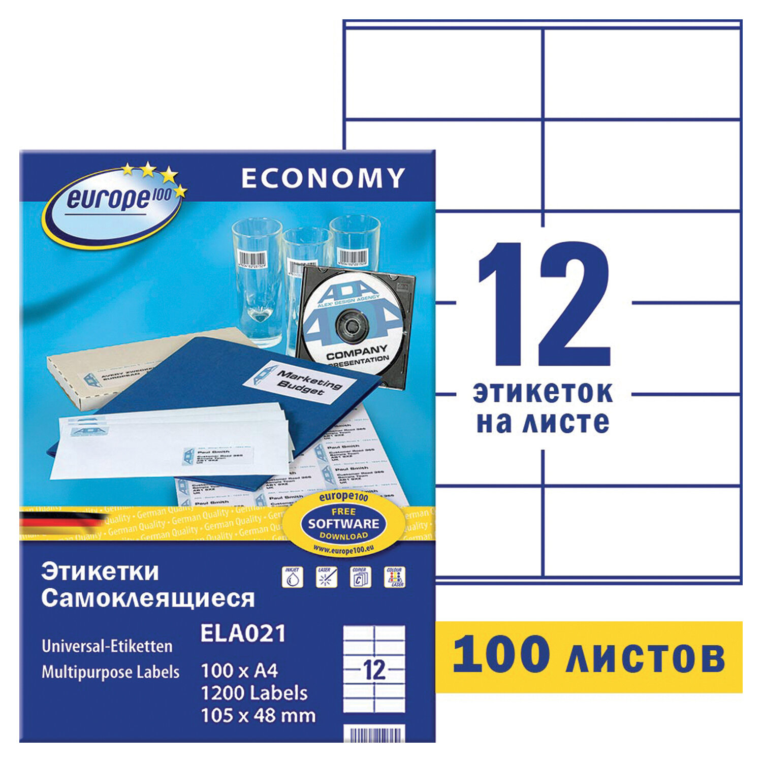 Этикетка самоклеящаяся 105х48 мм, 12 этикеток, белая, 70 г/м2, 100 л., Avery, Европа-100 Код товара: 114313 828 ₽ Купить Производитель:EUROPE 100 Самоклеящиеся этикетки EUROPE 100 позволят быстро и качественно подготовить адресные наклейки, регистрационные номера, аннотации при помощи лазерного или струйного принтера. Универсальные этикетки производятся компанией Avery Zweckform из высококачественного европейского сырья. Отличаются отличной адгезией, четким изображением печати и надежной производительностью принтера. Упаковка содержит 100 листов формата А4, на каждом листе прямоугольной формы — 12 этикеток размером 105х48 мм. Возможность переклеивания отсутствует. Для оформления и печати этикеток можно использовать шаблон. Чтобы увидеть разлиновку шаблона, необходимо в ПО Microsoft Word открыть вкладку «Макет» и щелкнуть «Отобразить сетку».Производство: РоссияКоличество этикеток на листе: 12 шт.Размер этикетки (ДхШ): 105х48 ммФорма: прямоугольнаяКоличество листов в упаковке: 100 шт.Технология печати: для лазерной печати, для струйной печатиСерия: Avery-100Плотность: 70 г/м2Тип поверхности: матоваяЦвет этикетки: белыйСпецэффект цвета: нетШаблон для скачивания: даВес: 980 грРазмер упаковки: 2.3 × 31 × 22 смОбъём: 0.0018 м3Промежуточная упаковка: 5 штТранспортная упаковка: 5 штШтрих-код: 4260167150369 Файлы Приложение-1.doc Сертификат-1.jpg Сертификат-2.jpg Сертификат-3.jpg Сертификат-4.jpg Сертификат-5.jpg Сертификат-6.jpg Сертификат-7.jpg Сертификат-8.jpg Сертификат-9.jpg Сертификат-10.jpg Сертификат-11.jpg Сертификат-12.jpg Сертификат-13.jpg Сертификат-14.jpg Сертификат-15.jpg Сертификат-16.jpg Сертификат-17.jpg Сертификат-18.jpg Сертификат-19.jpg Сертификат-20.jpg Сертификат-21.jpg Сертификат-22.jpg Сертификат-23.jpg Сертификат-24.jpg Сертификат-25.jpg Сертификат-26.jpg