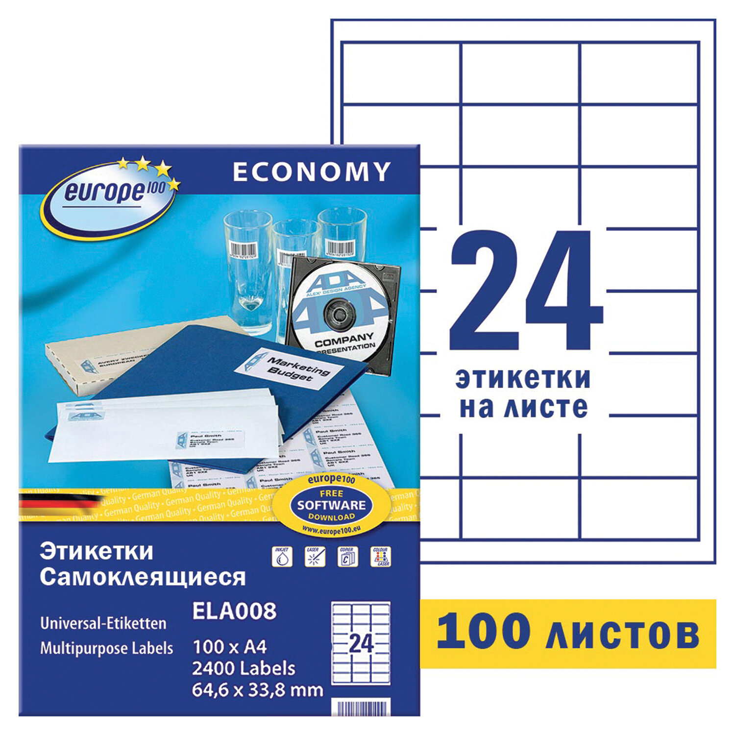 Этикетка самоклеящаяся 64,6х33,8 мм, 24 этикетки, белая, 70 г/м2, 100 л., Avery, Европа-100 Ликвидация Код товара: 114314 810,9 ₽ Купить Производитель:EUROPE 100 Самоклеящиеся этикетки EUROPE 100 позволят быстро и качественно подготовить адресные наклейки, регистрационные номера, аннотации при помощи лазерного или струйного принтера. Универсальные этикетки производятся компанией Avery Zweckform из высококачественного европейского сырья. Отличаются отличной адгезией, четким изображением печати и надежной производительностью принтера. Упаковка содержит 100 листов формата А4, на каждом листе прямоугольной формы — 24 этикетки размером 64,6х33,8 мм. Возможность переклеивания отсутствует. Для оформления и печати этикеток можно использовать шаблон. Чтобы увидеть разлиновку шаблона, необходимо в ПО Microsoft Word открыть вкладку «Макет» и щелкнуть «Отобразить сетку».Производство: РоссияКоличество этикеток на листе: 24 шт.Размер этикетки (ДхШ): 64,6х33,8 ммФорма: прямоугольнаяКоличество листов в упаковке: 100 шт.Технология печати: для лазерной печати, для струйной печатиСерия: Avery-100Плотность: 70 г/м2Тип поверхности: матоваяЦвет этикетки: белыйСпецэффект цвета: нетШаблон для скачивания: даВес: 991 грРазмер упаковки: 2.1 × 31.1 × 22.1 смОбъём: 0.0018 м3Промежуточная упаковка: 5 штТранспортная упаковка: 5 штШтрих-код: 4260167150499 Приложение-1.doc Сертификат-1.jpg Сертификат-2.jpg