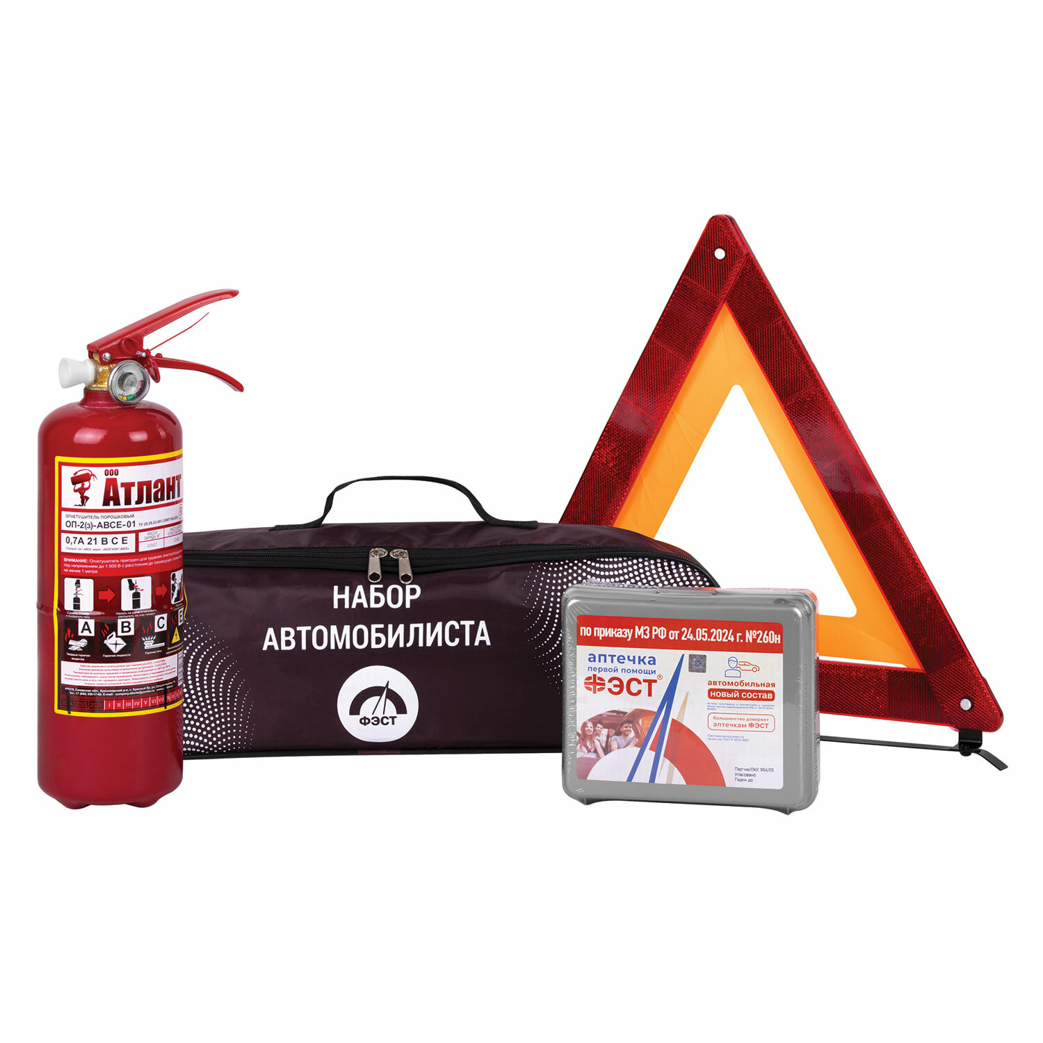 Набор автомобилиста "На техосмотр": аптечка (приказ 260н), огнетушитель ОП-2, знак, сумка Код товара: 611014 2 354,55 ₽ Купить Производитель:ФЭСТ Набор автомобилиста "На техосмотр" предназначен для прохождения техосмотра и использования в аварийных ситуациях на дороге. Дорожный набор включает автоаксессуары, необходимые для выхода из нештатных ситуаций. Основной состав комплекта соответствует требованиям технического осмотра. Все элементы имеют обязательные сертификаты и лицензии. Сумка-футляр изготовлена из прочного, влагостойкого материала, устойчивого к износу. Размеры – 47 см х 13,5 см х 14,5 см.Производство: РоссияТип товара: автомобильный наборКоличество в комплекте: 4 шт.Комплектация: аптечка "ФЭСТ", знак аварийной остановки, огнетушитель металлический с манометром ОП-2(з), сумка-футлярСрок годности: 48 месВес: 3,48 кгРазмер упаковки: 13.6 × 48.1 × 16.9 смОбъём: 0.0141 м3Промежуточная упаковка: 4 штТранспортная упаковка: 4 штШтрих-код: 4607025849476 Сертификат-1.jpg Сертификат-2.jpg Сертификат-3.jpg
