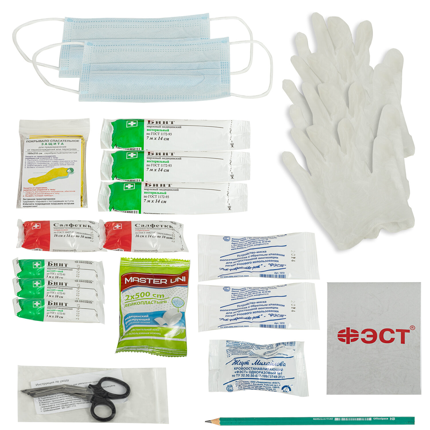 Аптечка первой помощи автомобильная, по приказу № 260н, ФЭСТ, тканевая сумка Код товара: 631423 1 293,69 ₽ Купить Производитель:ФЭСТ Автомобильная аптечка ФЭСТ содержит в себе все необходимое, чтобы остановить поверхностное кровотечение, обработать рану или место ушиба, наложить жгут, сделать искусственное дыхание. Иметь аптечку для оказания само- и взаимопомощи в своей машине обязан каждый водитель. Об этом говорится в Правилах дорожного движения, действующих на территории Российской Федерации. Однако наборы медицинских изделий от различных производителей могут весьма существенно отличаться. Так, цена на автомобильную аптечку первой помощи зависит не только от входящих в ее состав вложений, но и от наценки производителя. Предприятие ФЭСТ предлагает приобрести аналогичный набор для автомобиля по доступной цене без потери в качестве и комплектации. Аптечка ФЭСТ: • Полностью соответствует российскому законодательству. • Рассчитана на помощь в самых распространенных при ДТП повреждениях – в состав аптечки входит все необходимое для предотвращения потери крови у пострадавших. • Долго не требует замены. Автомобильная аптечка ФЭСТ стала долговечней за счет исключения из состава портящихся лекарств – все медикаменты имеют большой срок хранения. • Компактна и проста в использовании – она легко помещается в бардачок автомобиля, при необходимости медицинские средства могут быть быстро извлечены и применены. • Проста при переноске – отличается легкостью и удобной упаковкой. • Заметная – дизайн разработан таким образом, чтобы аптечку можно было найти с первого взгляда, ведь при оказании первой помощи важной бывает каждая секунда. • Максимально сбалансирована по соотношению качества и цены – как и вся продукция ФЭСТ, аптечки рассчитаны на широкий круг потребителей, а потому доступны каждому. Состав: 1. Маска медицинская нестерильная одноразовая (2 шт.). 2. Перчатки медицинские нестерильные размером не менее М (2 пары). 3. Устройство для проведения искусственного дыхания "Рот-Устройство-Рот" (2 шт.). 4. Жгут кровоостанавливающий для остановки артериального кровотечения (1 шт.). 5. Бинт марлевый медицинский размером не менее 5 м х 10 см или бинт фиксирующий эластичный нестерильный размером не менее 2 м х 10 см (3 шт.). 6. Бинт марлевый медицинский размером не менее 7 м х 14 см или бинт фиксирующий эластичный нестерильный размером не менее 2 м х 14 см (3 шт.). 7. Салфетки медицинские стерильные № 10 размером не менее 16х13 см (2 уп.). 8. Лейкопластырь фиксирующий рулонный размером не менее 2х500 см (1 шт.). 9. Покрывало спасательное изотермическое размером не менее 160х210 см (1 шт.). 10. Ножницы для разрезания перевязочного материала и ткани (1 шт.). 11. Инструкция по оказанию первой помощи с использованием аптечки для оказания первой помощи с применением медицинских изделий пострадавшим в дорожно-транспортных происшествиях (1 шт.). 12. Блокнот формата не менее А7 (1 шт.). 13. карандаш (1 шт.). Внешний вид вложений и надписи на аптечке могут отличаться от фото на сайте.Производство: РоссияТип: автомобильнаяНаполнение: по приказу 260нФорма выпуска: текстильный футлярСрок годности: 48 мес.Длина: 17 смШирина: 19 смГлубина: 7 смСрок годности: 48 месВес: 395 грРазмер упаковки: 7.2 × 18.6 × 17.3 смОбъём: 0.0032 м3Промежуточная упаковка: 20 штТранспортная упаковка: 20 штШтрих-код: 4607025848998 Файлы Сертификат-1