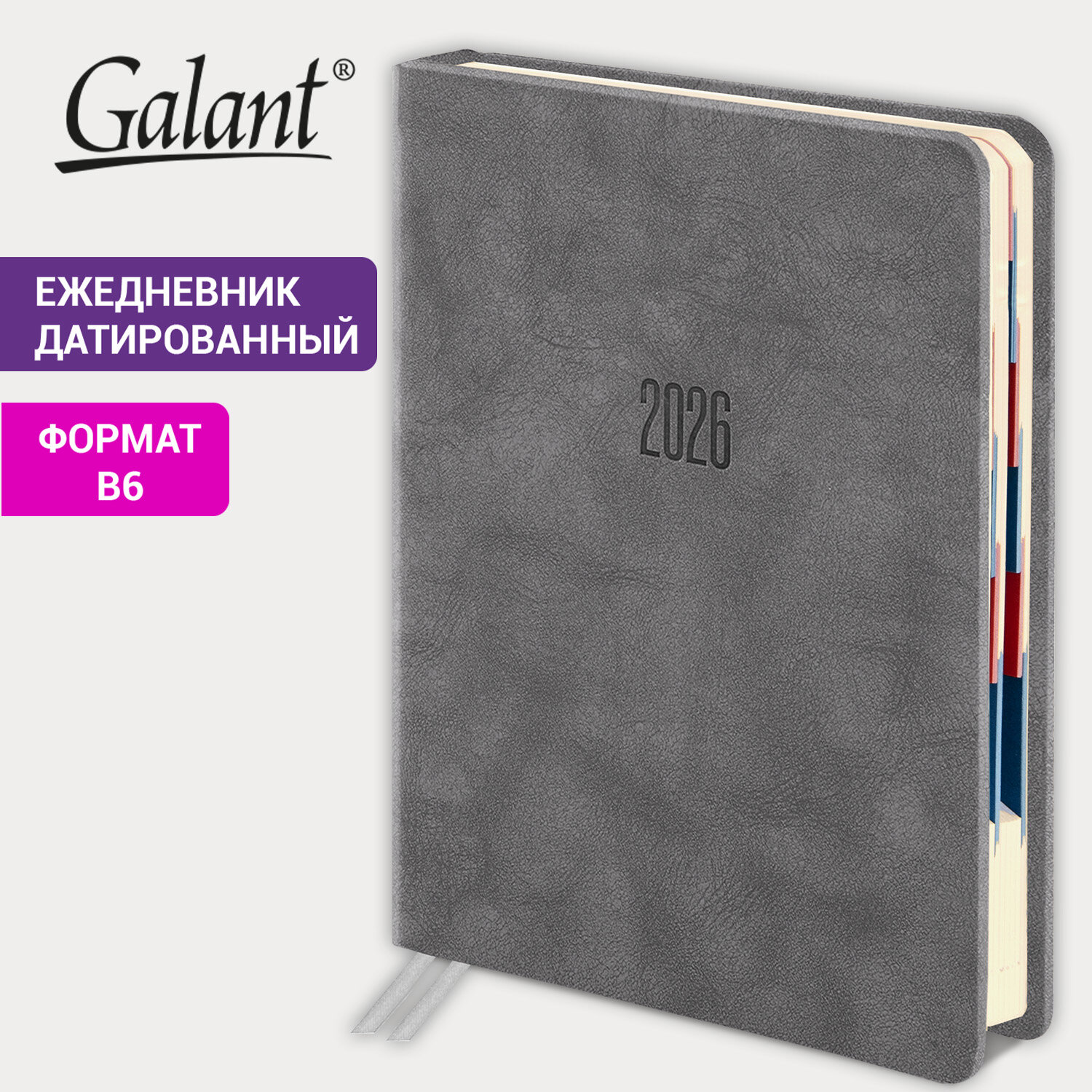 Ежедневник датированный 2026 B6 125х173 мм, GALANT "Vivid", под кожу, серый Код товара: 117410 307,44 ₽ Купить Производитель:GALANT Датированный ежедневник серии "Vivid" от GALANT – надежный спутник делового человека. Внутренний блок включает 168 листов кремовой бумаги плотностью 70 г/м2. Каждая страничка имеет перфорированный угол. Благодаря небольшому формату B6 (125х173 мм) ежедневник удобно использовать как в офисе, так и на выездных деловых встречах. Твердая обложка стилизована под текстурную кожу. Материал обложки подходит для горячего тиснения. Дополнением является закладка-ляссе, с помощью которой при необходимости можно быстро открыть ежедневник на нужной странице, а также вырубка по месяцам. Помимо прочего, ежедневник снабжен обширным справочным материалом. В конце есть 6 страниц для записей и заметок.Производство: КитайТип ежедневника: датированныйФормат: В6Обложка: под фактурную кожуВид обложки: твердаяКоличество листов: 168 шт.Особенности: вырубка блока, закладка-ляссе, перфорация уголков, скругленные углы, справочная информацияСерия: VividГод: 2026Тип застежки: нетОсновной цвет обложки: серыйДополнительный цвет обложки: нетЦвет среза: нетЦвет внутреннего блока: кремовыйПлотность внутреннего блока: 70 г/м2Высота строки для записи: 4 ммТип крепления: сшивкаПечать блока: 2 краскиПодходит для блинтового тиснения: даПодходит для тиснения фольгой: даДлина: 173 ммШирина: 125 ммТолщина: 20 ммВес: 326 грРазмер упаковки: 2.1 × 17.3 × 12.8 смОбъём: 0.0006 м3Промежуточная упаковка: 20 штТранспортная упаковка: 20 штШтрих-код: 4606224489933 Файлы Сертификат-1.jpg Сертификат-2.jpg Сертификат-3.jpg Сертификат-4.jpg Сертификат-5.jpg Сертификат-6.jpg Сертификат-7.jpg Сертификат-8.jpg Сертификат-9.jpg Сертификат-10.jpg Сертификат-11.jpg Сертификат-12.jpg Сертификат-13.jpg Сертификат-14.jpg Сертификат-15.jpg Сертификат-16.jpg Сертификат-17.jpg Сертификат-18.jpg Сертификат-19.jpg Сертификат-20.jpg Сертификат-21.jpg Сертификат-22.jpg Сертификат-23.jpg Сертификат-24.jpg Сертификат-25.jpg Сертификат-26.jpg