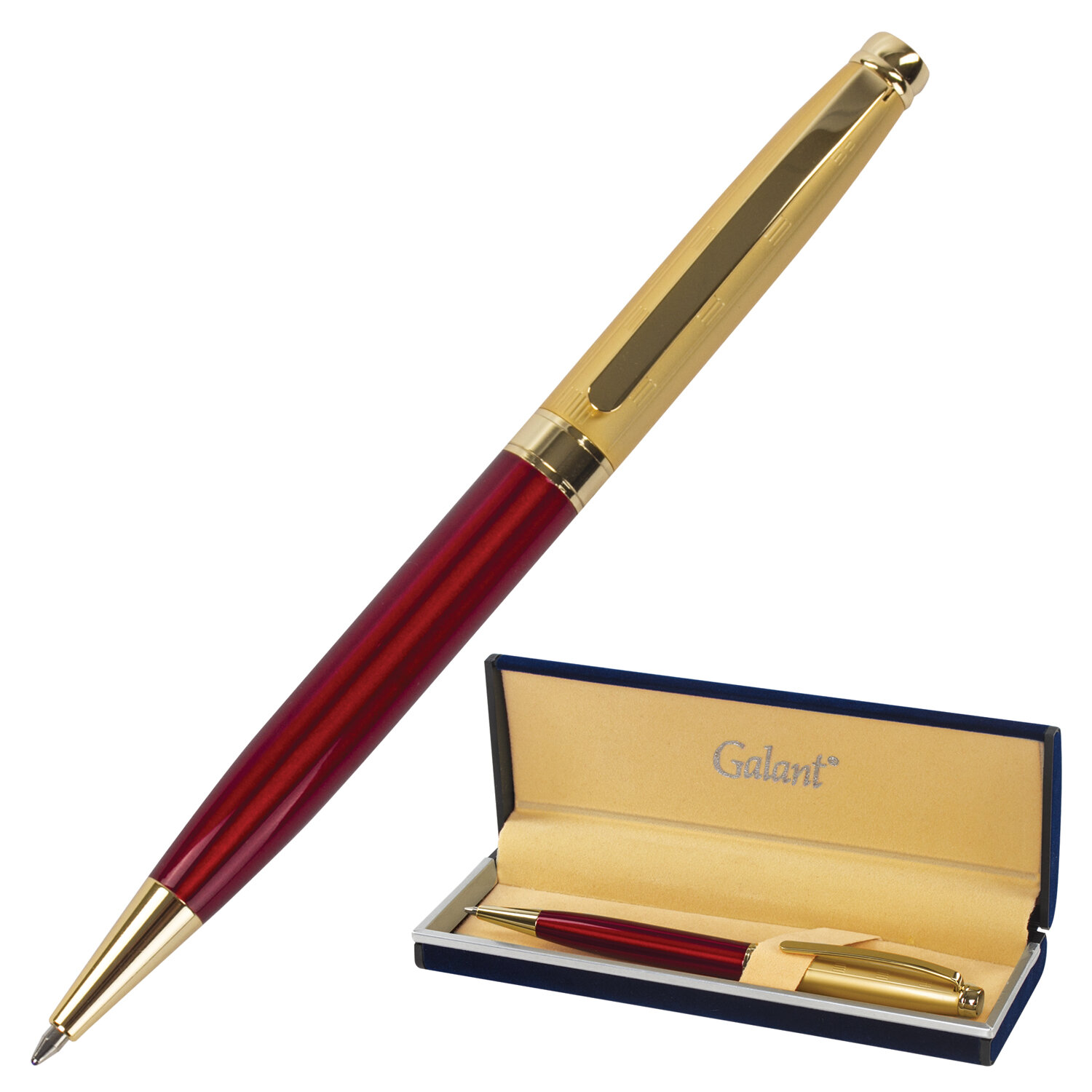 Ручка подарочная шариковая GALANT "Bremen", корпус бордовый с золотистым, золотистые детали, пишущий узел 0,7 мм, синяя Код товара: 141010 1 504,07 ₽ Купить Производитель:GALANT Элегантная ручка GALANT "Bremen" станет отличным подарком к любому празднику или событию, подчеркнет статус и изысканность вкуса владельца. Корпус ручки бордового цвета выполнен из латуни и декорирован позолоченными деталями. Синий цвет чернил, длина стержня составляет 98 мм, а диаметр пишущего узла - 0,7 мм. Поставляется в индивидуальном подарочном футляре. Подходит для гравировки.Производство: Тайвань (Китай)Цвет корпуса: бордовыйМатериал корпуса: латуньПокрытие корпуса: лак/позолотаДекор корпуса: гравировкаМатериал деталей отделки: сплав латуниМеханизм: поворотныйСерия: BremenДлина стержня: 98 ммДиаметр пишущего узла: 0.7 ммЦвет чернил: синийПодарочный футляр: даСрок годности: 60 месВес: 141 грРазмер упаковки: 2.9 × 16.7 × 6.3 смОбъём: 0.0004 м3Промежуточная упаковка: 100 штТранспортная упаковка: 100 штШтрих-код: 4606224040677 Файлы Сертификат-1.jpg Сертификат-2.jpg Сертификат-3.jpg Сертификат-4.jpg Сертификат-5.jpg Сертификат-6.jpg Сертификат-7.jpg Сертификат-8.jpg Сертификат-9.jpg Сертификат-10.jpg Сертификат-11.jpg Сертификат-12.jpg Сертификат-13.jpg Сертификат-14.jpg Сертификат-15.jpg Сертификат-16.jpg Сертификат-17.jpg Сертификат-18.jpg Сертификат-19.jpg Сертификат-20.jpg Сертификат-21.jpg Сертификат-22.jpg Сертификат-23.jpg Сертификат-24.jpg Сертификат-25.jpg Сертификат-26.jpg