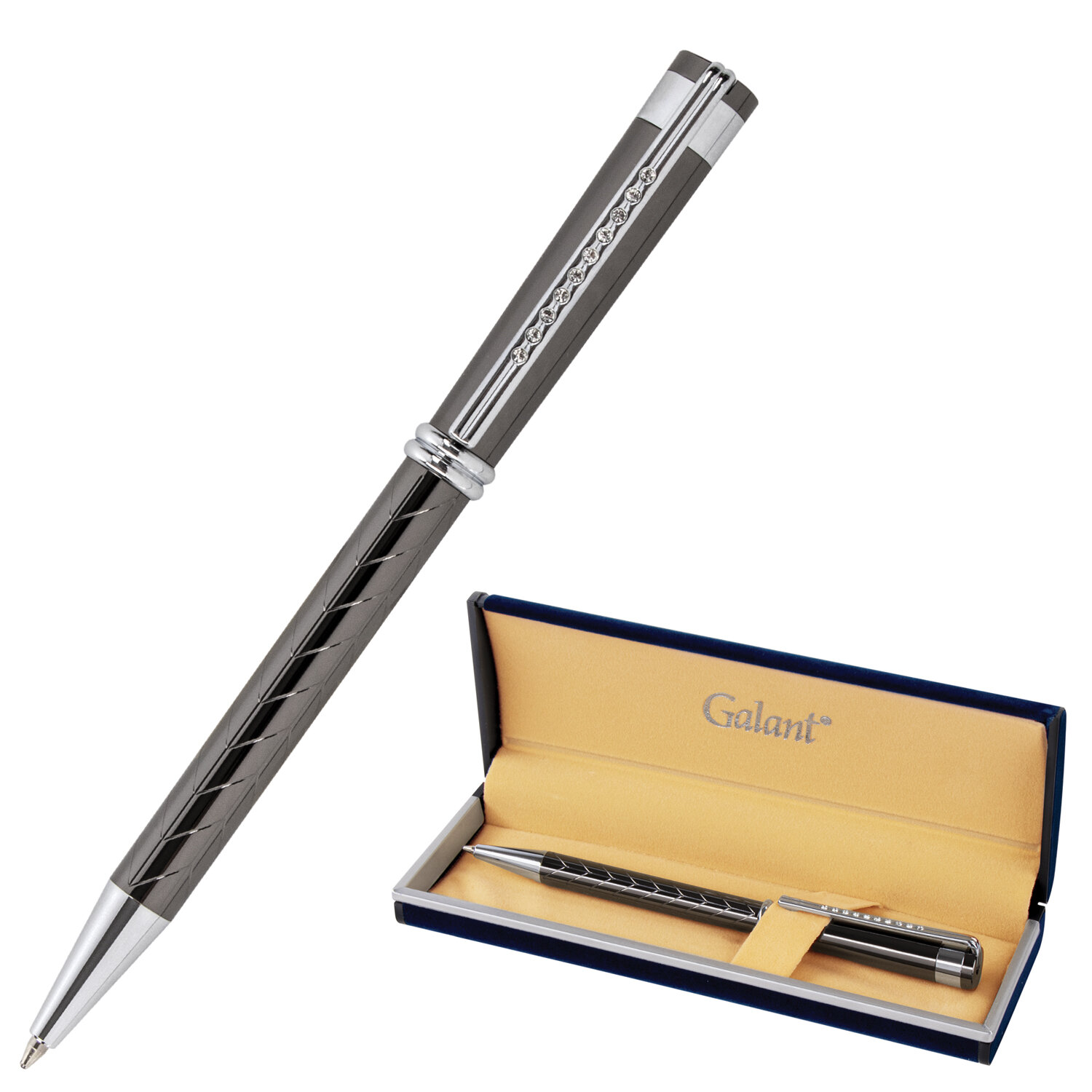 Ручка подарочная шариковая GALANT "MARINUS", корпус оружейный металл, детали хром, узел 0,7 мм, синяя Ликвидация Код товара: 143509 856,18 ₽ Купить Производитель:GALANT Элегантная ручка GALANT "MARINUS" станет отличным подарком к любому празднику или событию, подчеркнет статус и изысканность вкуса владельца. Изящная модель ручки с корпусом из латуни цвета оружейный металл с декоративным узором и серебристыми деталями. Синий цвет чернил; длина стержня составляет 98 мм, а диаметр пишущего узла - 0,7 мм. Поставляется в индивидуальном подарочном футляре. Подходит для гравировки.Производство: Тайвань (Китай)Цвет корпуса: серо-коричневыйМатериал корпуса: латуньПокрытие корпуса: глянцевоеДекор корпуса: чеканный узорМатериал деталей отделки: латуньМеханизм: поворотныйСерия: MarinusДлина стержня: 98 ммДиаметр пишущего узла: 0.7 ммЦвет чернил: синийПодарочный футляр: даСрок годности: 60 месВес: 138 грРазмер упаковки: 2.6 × 16.5 × 6.1 смОбъём: 0.0004 м3Промежуточная упаковка: 100 штТранспортная упаковка: 100 штШтрих-код: 4606224282107 Сертификат-1.jpg Сертификат-2.jpg