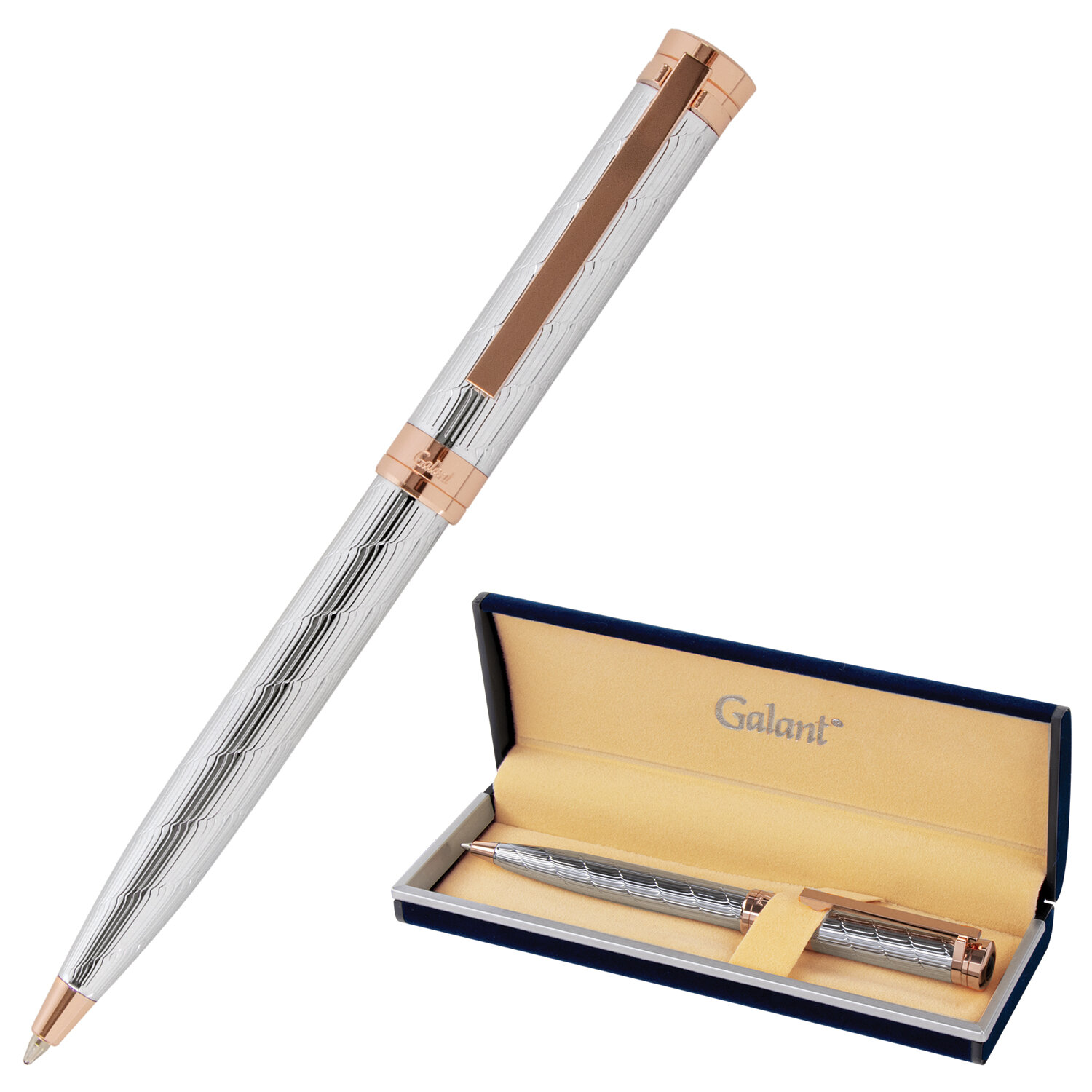 Ручка подарочная шариковая GALANT "ESQUISSE", корпус серебристый, детали розовое золото, узел 0,7 мм, синяя Ликвидация Код товара: 143511 993,46 ₽ Купить Производитель:GALANT Элегантная ручка GALANT "ESQUISSE" станет отличным подарком к любому празднику или событию, подчеркнет статус и изысканность вкуса владельца. Утонченная модель ручки с корпусом из латуни серебристого цвета, золотыми деталями и декоративным узором прекрасно лежит в руке. Синий цвет чернил; длина стержня составляет 98 мм, а диаметр пишущего узла - 0,7 мм. Поставляется в индивидуальном подарочном футляре. Подходит для гравировки.Производство: Тайвань (Китай)Цвет корпуса: серебристыйМатериал корпуса: латуньПокрытие корпуса: глянцевоеДекор корпуса: гравировка/узорМатериал деталей отделки: латуньМеханизм: поворотныйСерия: EsquisseДлина стержня: 98 ммДиаметр пишущего узла: 0.7 ммЦвет чернил: синийПодарочный футляр: даСрок годности: 60 месВес: 147 грРазмер упаковки: 3 × 16.6 × 6.3 смОбъём: 0.0004 м3Промежуточная упаковка: 100 штТранспортная упаковка: 100 штШтрих-код: 4606224282121 Сертификат-1.jpg Сертификат-2.jpg