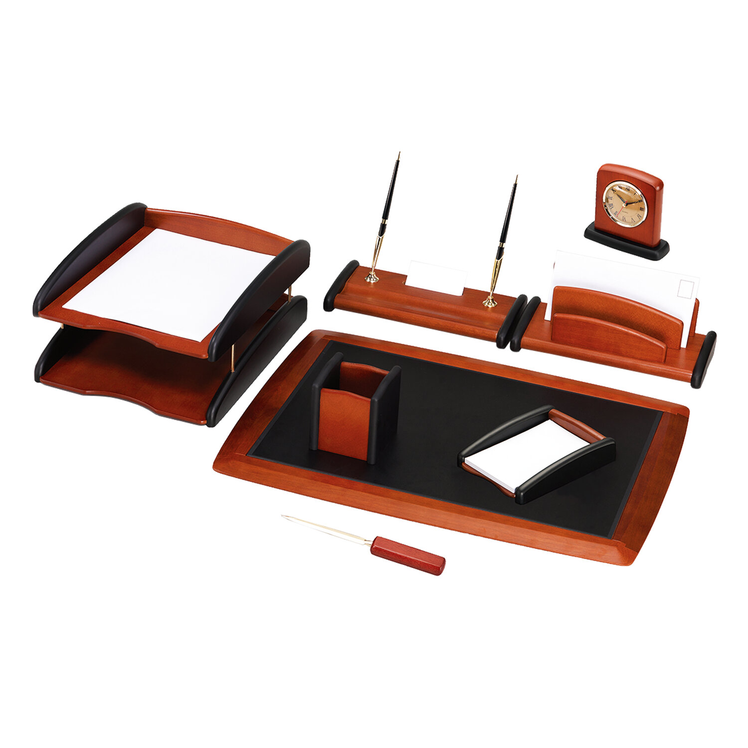 Набор настольный GALANT "Cayman" из дерева, 8 предметов, цвет "палисандр/чёрный" Код товара: 238160 21 325 ₽ Купить Производитель:GALANT Настольный набор премиум-класса GALANT "Cayman" - оригинальный подарок, отличающийся утонченным стилем и совершенством деталей. Идеально подойдет в качестве статусного подарка руководителю, бизнес-партнеру, коллеге по работе. Набор состоит из 8 предметов: - двойной лоток для бумаг формата А4; - коврик для письма (размер 59х43,5 см); - подставка для ручек (2 шариковые ручки с синими чернилами в комплекте) со специальным отверстием под визитки; - стакан-подставка для письменных принадлежностей; - подставка для бумажного блока; - часы с кварцевым механизмом; - подставка для писем; - нож для вскрытия конвертов. Все предметы изготовлены из дерева комбинированного цвета "палисандр/черный". Набор дополнительно упакован в защитную коробку для сохранности в процессе транспортировки. Представленный комплект относится к премиальному ценовому сегменту.Производство: Тайвань (Китай)Серия: WoodЦвет: палисандр/черныйКоличество предметов: 8 шт.Тип лотка: двойнойЧасы: даМатериал: массив дерева, МДФСрок годности: 120 месВес: 7,82 кгРазмер упаковки: 14.8 × 64.3 × 46.9 смОбъём: 0.0538 м3Промежуточная упаковка: 2 штТранспортная упаковка: 2 штШтрих-код: 4606224380537 Сертификат-1.jpg Сертификат-2.jpg Сертификат-3.jpg