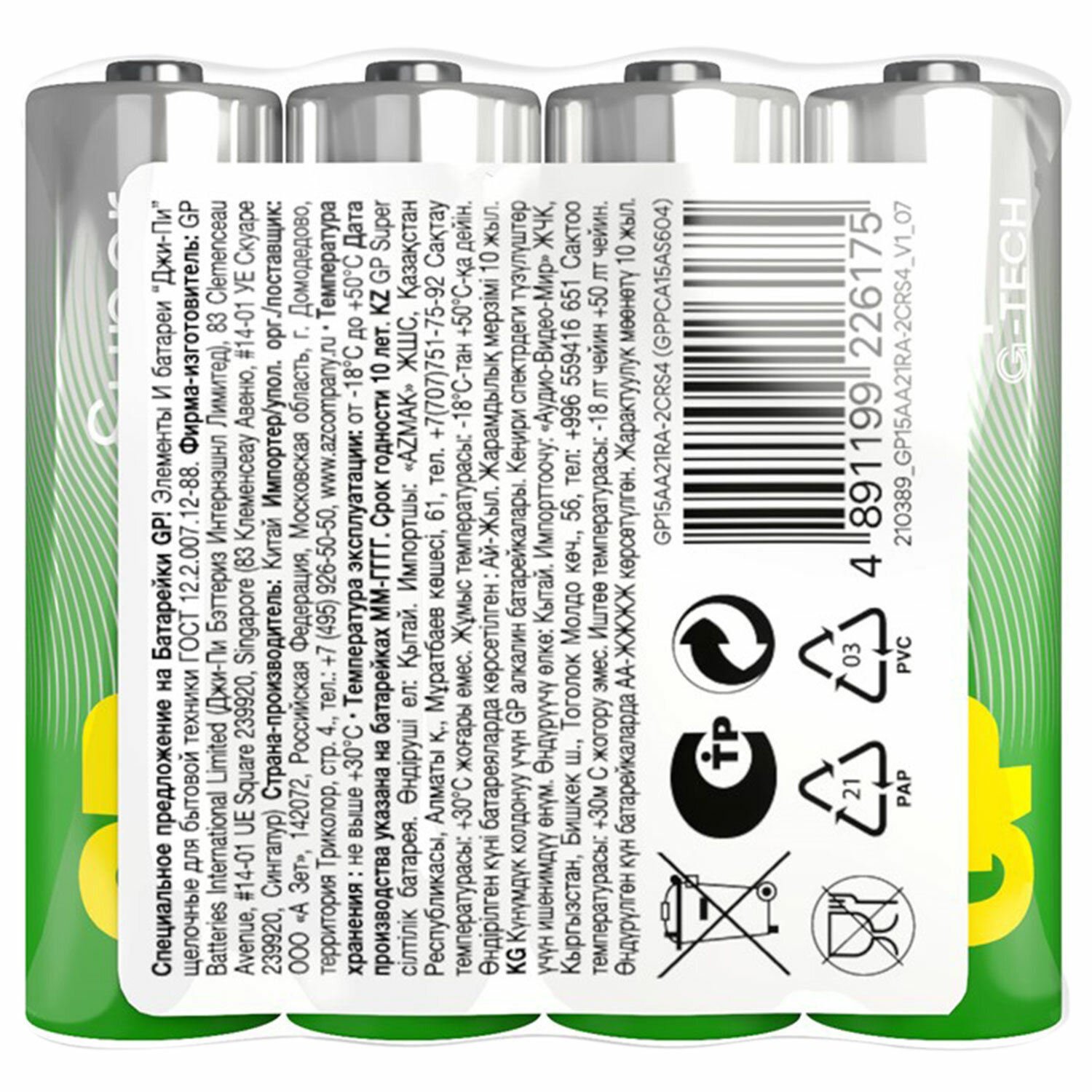 Батарейки КОМПЛЕКТ 4 шт., GP Super G-Tech, AA (LR06, 15 А), алкалиновые, пальчиковые, в пленке, 15AA21 Код товара: 454090 201,28 ₽ Купить Производитель:GP Алкалиновые батарейки GP размера AA увеличенной продолжительности работы идеально подходят для приборов с высоким потреблением энергии, таких как механизированные игрушки, фонарики, портативные игровые консоли, пульты дистанционного управления. Батарейки GP – это надежные элементы питания, которые обеспечивают стабильную работу устройств. В процессе изготовления использовались качественные материалы и тщательно соблюдались стандарты безопасности; они оптимально подходит для бытового применения. Неиспользованные батарейки GP могут сохранять заряд до 10 лет при хранении в обычных условиях. С этими батарейками можете полностью положиться на свое устройство. Поставляются комплектом из 4 штук в пленке. Вся информация о товарах на сайте носит справочный характер и не является публичной офертой в соответствии с пунктом 2 статьи 437 ГК РФ. Производитель оставляет за собой право изменять характеристики товара, его внешний вид и комплектность без предварительного уведомления продавца.Производство: КитайФорма батарейки: AA (пальчиковые)Серия: SuperТипоразмер: AA (пальчиковая, R6, LR6, 316, 15A, 15D)Технология: алкалиноваяНапряжение: 1.5 ВКоличество в упаковке: 4 шт.Упаковка: термоусадочная пленкаСрок годности: 120 месВес: 100 грРазмер упаковки: 1.4 × 5.8 × 4.9 смОбъём: 0.0001 м3Промежуточная упаковка: 24 штТранспортная упаковка: 96 шт Файлы Сертификат-1.jpg Сертификат-2.jpg Сертификат-3.jpg Сертификат-4.jpg