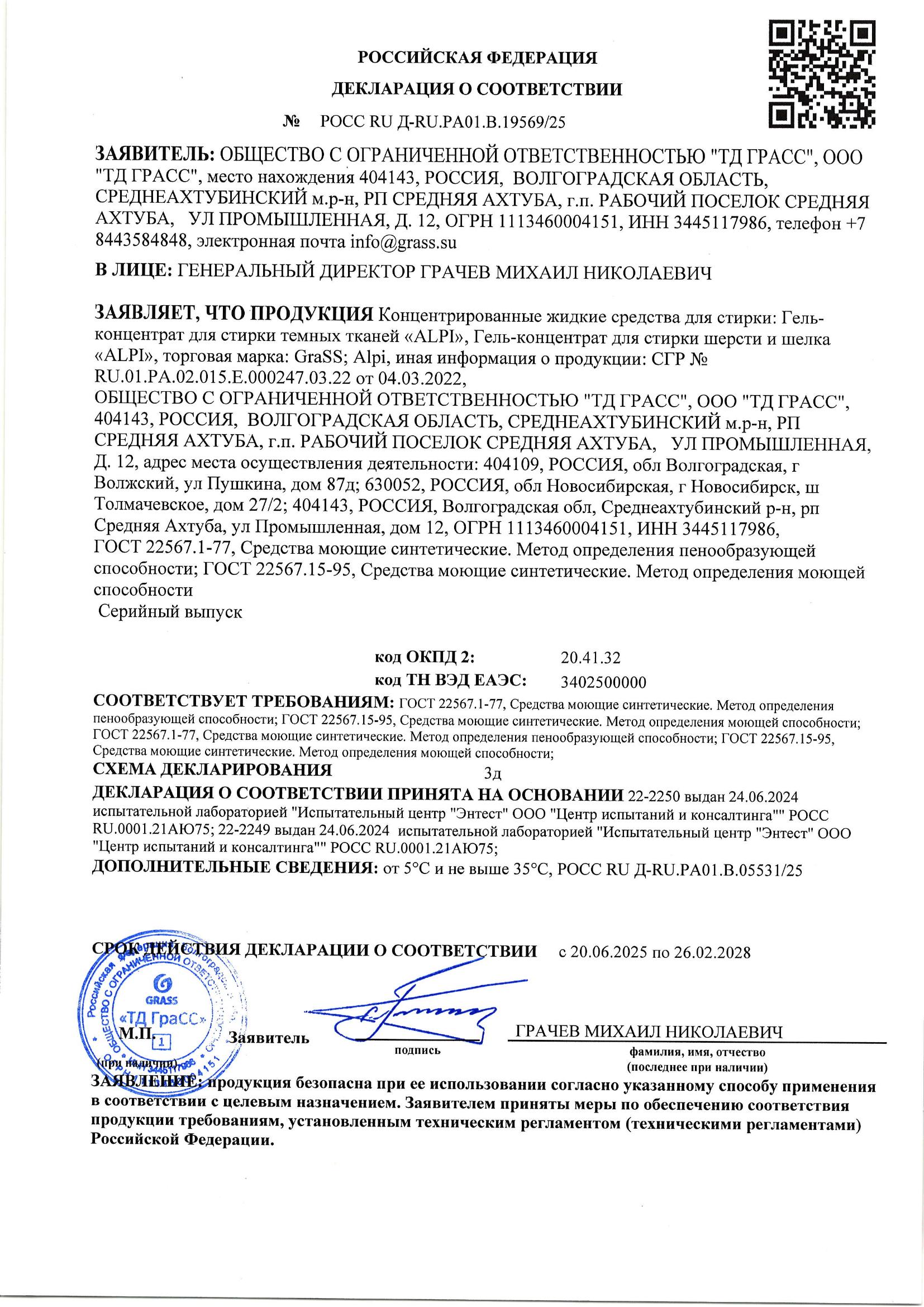 Гель для стирки шерсти и шелка концентрированный гипоаллергенный 1,8 л, GRASS ALPI Код товара: 609897 566,51 ₽ Купить Производитель:GRASS Концентрированное жидкое средство для стирки ALPI предназначено для ухода за деликатными натуральными тканями в стиральных машинах любого типа и ручной стирки в воде любой жесткости. Гель деликатно ухаживает за тканью, не разрушает волокна, сохраняет мягкость вещей. Тщательно удаляет загрязнения и при этом бережно относится к вещам, сохраняет их аккуратный вид стирка за стиркой. Средство для деликатных тканей ALPI поддерживает эластичность волокон, таким образом, сохраняя первозданную форму каждой вещи. Разработано под контролем ведущих специалистов Германии. Рекомендуемый температурный режим стирки 20-40 °С. Перед использованием средство взболтать. Состав: 30% очищенная вода; 5-15% анионные ПАВ, неионогенные ПАВ; менее 5%: мыло, глицерин, энзимы, поликарбоксилаты, метилхлороизотиазолинон, метилизотиазолинон, ароматизирующая добавка, краситель. Способ применения: для выбора способа стирки и температуры воды следуйте рекомендациям на ярлыках изделий. Перед использованием средство рекомендуется взболтать. Для автоматической стирки необходимо 60 мл геля на 3-5 кг белья. При жесткой воде расход геля увеличить до 80 мл. Для ручной стирки гель разбавить в пропорции 5 мл/л (для жесткой воды 6 мл/л). Рекомендуем стирку вещей осуществлять при температуре не выше 40 °С.Производство: РоссияТип: автоматОбъем/Вес: 1800 мл/гВид средства: гельНазначение: для шерсти и шелкаОтдушка: свежестьГипоаллергенный: даКоличество бункеров: 0 шт.Серия: GELВид упаковки: бутыльСрок годности: 18 месРазмер упаковки: 29.1 × 10.5 × 8.5 смОбъём: 0.0035 м3Промежуточная упаковка: 6 штТранспортная упаковка: 6 штШтрих-код: 4670113605704 Приложение-1.pdf Сертификат-1.jpg Сертификат-2.jpg