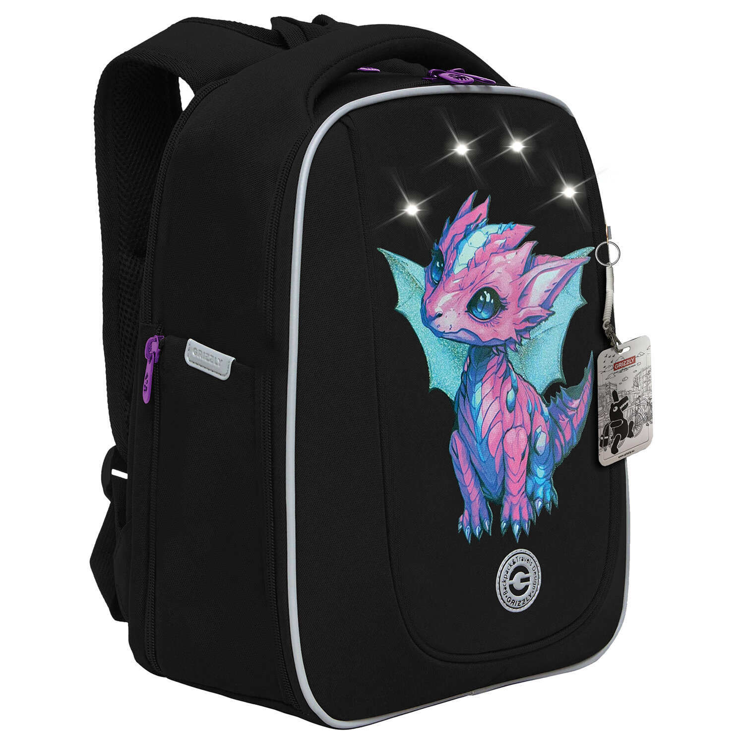 Ранец GRIZZLY анатомическая спинка, с бейджем, для девочек, LITTLE DRAGON, 36х29х18 см Код товара: 272776 5 083,68 ₽ Купить Производитель:GRIZZLY У ранца GRIZZLY формованная лицевая часть, жесткая анатомическая спинка и жесткое дно на ножках, благодаря чему содержимое надежно защищено. А еще такая конструкция равномерно распределяет нагрузку на спину. Чтобы у ребенка не уставали руки и плечи, ранец оснащен широкими лямками и нагрудной стяжкой со свистком. У ранца два отделения. Основное отделение разбито на три отсека: для книг, тетрадей и папок А4, есть карман из сетки на молнии. Дополнительное жесткое отделение не даст помяться ценным вещам. Для безопасности в темное время суток со всех сторон ранца нанесены светоотражающие элементы. За счет водо- и грязеотталкивающей пропитки ранец долго остается чистым. Если он все же чем-то испачкался, рекомендуется ручная стирка в холодной воде. Длина лямки – 34 см. Длина регулировочной стропы – 55 см.Производство: КитайФорма ранца: ранец из формованного EVAСерия: RAF-92Дизайн: LITTLE DRAGONПол ребенка: для девочекСпинка: анатомическая, вентилируемаяНагрудный ремешок: даКол-во отделений: 2Перегородка в основном отделении: даКол-во карманов: 2Светоотражающие элементы: даБоковые карманы: даРегулируемые лямки: даВентилируемые лямки: даМатериал спинки: полиэстерМатериал дна: полиэстерПластиковые ножки: даПерсонализация: бейджЦвет: черныйРазмер: 36х29х18 смДлина лямок: 89 смОбъем: 13 лВес: 0.9 кгРазмер упаковки: 14.6 × 38.3 × 31.2 смОбъём: 0.0144 м3Промежуточная упаковка: 7 штТранспортная упаковка: 7 штШтрих-код: 4670197404644 Сертификат-1.jpg Сертификат-2.jpg