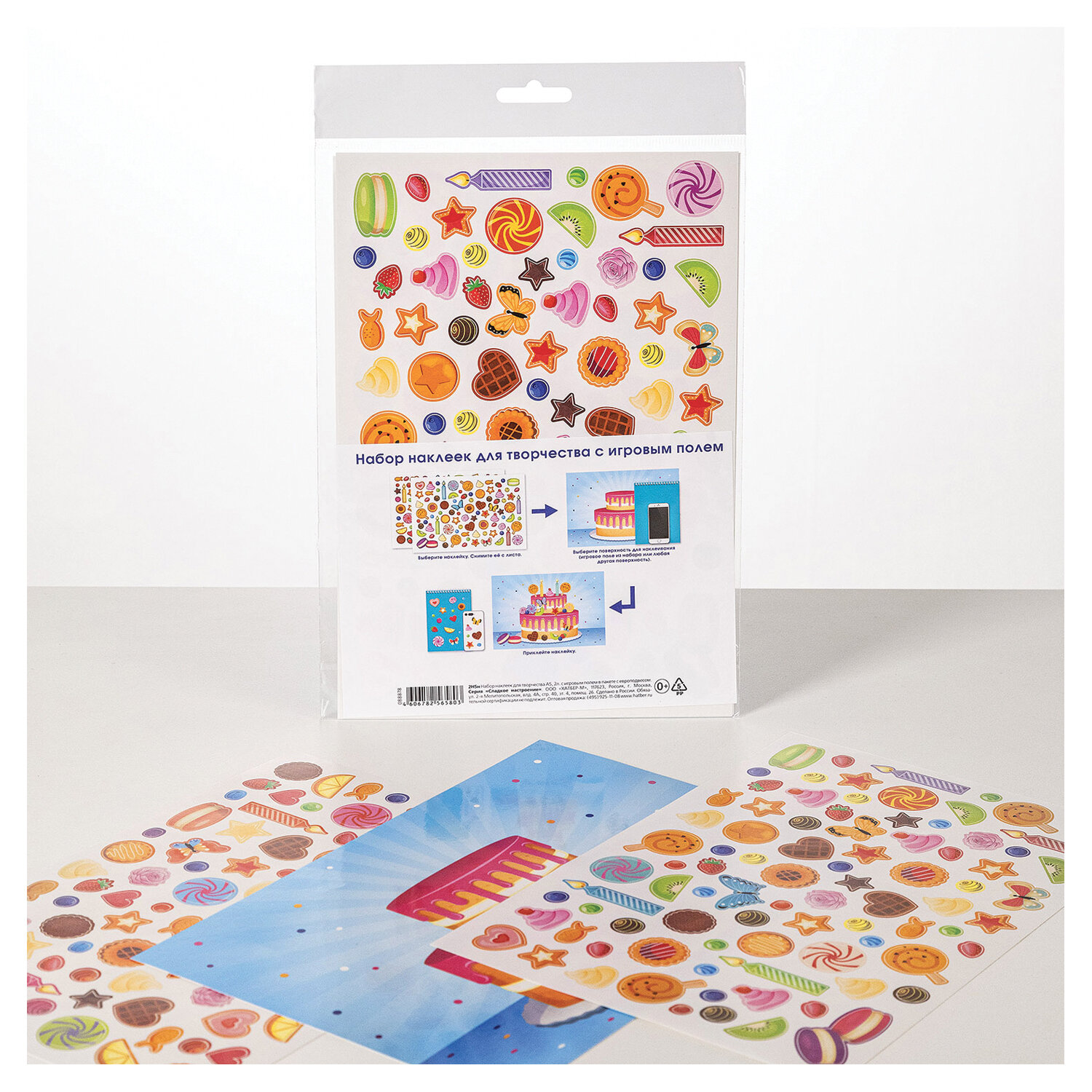 Наклейки бумажные с игровым полем НАБОР 2 листа, 184 наклейки, "Сладкое настроение", HATBER Код товара: 666386 124,26 ₽ Купить Производитель:HATBER Наклейки с игровым полем "Сладкое настроение" HATBER – креативный набор для детского творчества! Набор наклеек для творчества "Сладкое настроение" включает в себя два листа с большим количеством ярких тематических наклеек. Кроме того, в комплект входит игровое поле формата А5, на которое можно наклеивать картинки-наклейки, с удовольствием погрузившись в творческий процесс. Также наклейки можно использовать для украшения смартфонов, блокнотов, тетрадей и оформления открыток и подарков.Производство: РоссияТип наклеек: бумажныеСерия: ГладкиеТематика: едаКоличество наклеек: 184 шт.Тип поверхности наклеивания: бумага/картонДлина листа: 235 ммШирина листа: 160 ммМатериал: бумага самоклеящаясяВозрастная группа: 3+Пол ребенка: девочкаУпаковка: пакет с европодвесомВес: 26 грРазмер упаковки: 0.1 × 17 × 27.2 смПромежуточная упаковка: 20 штТранспортная упаковка: 240 штШтрих-код: 4606782565803 Сертификат-1.jpg Сертификат-2.jpg Сертификат-3.jpg